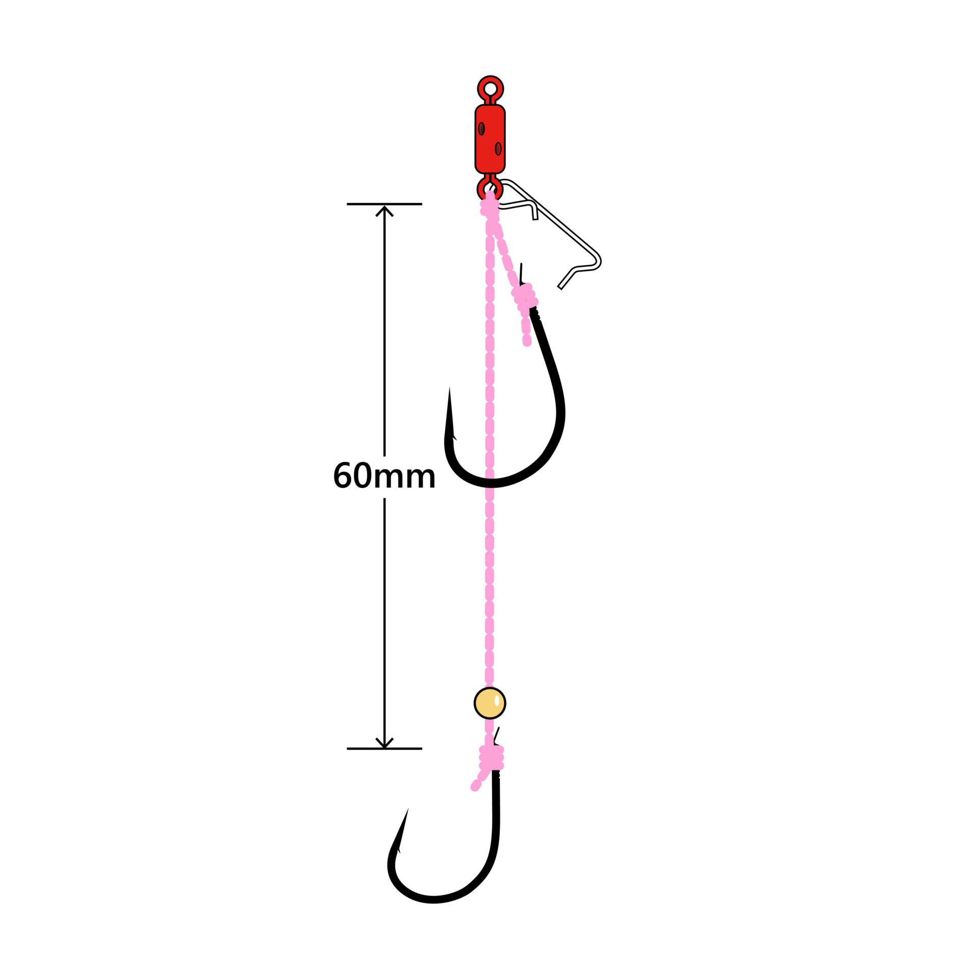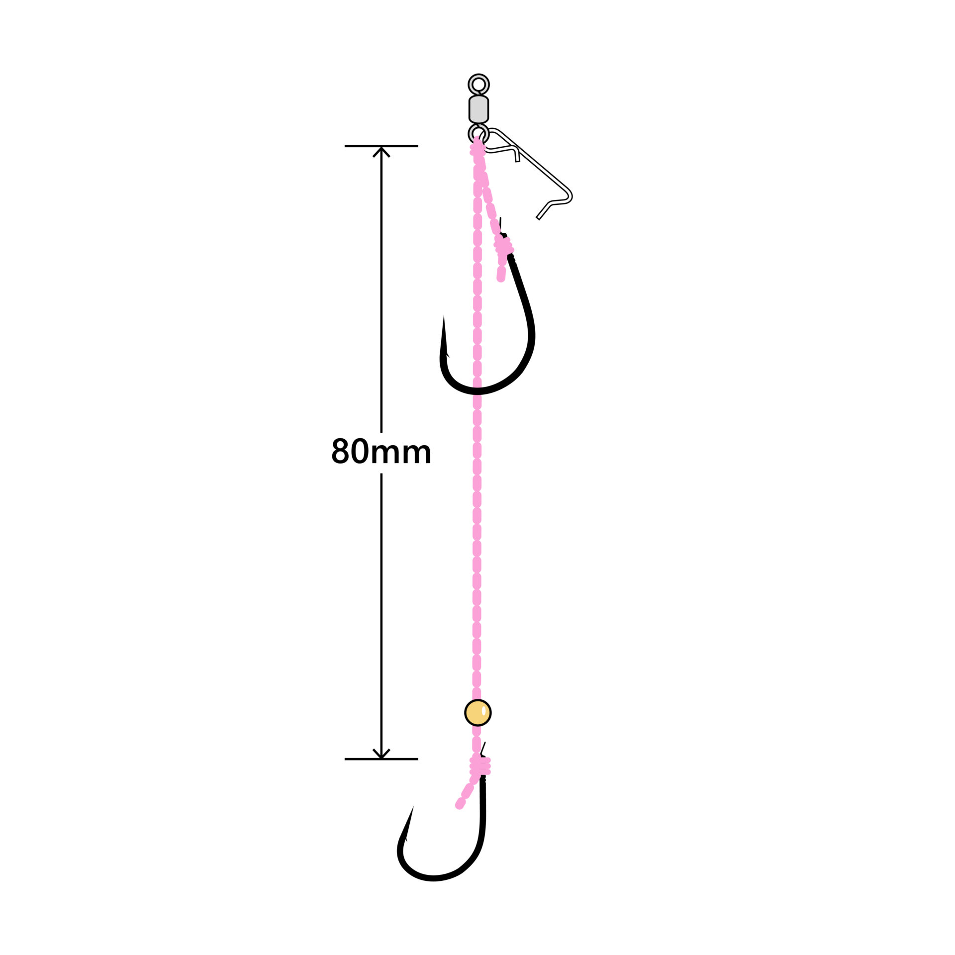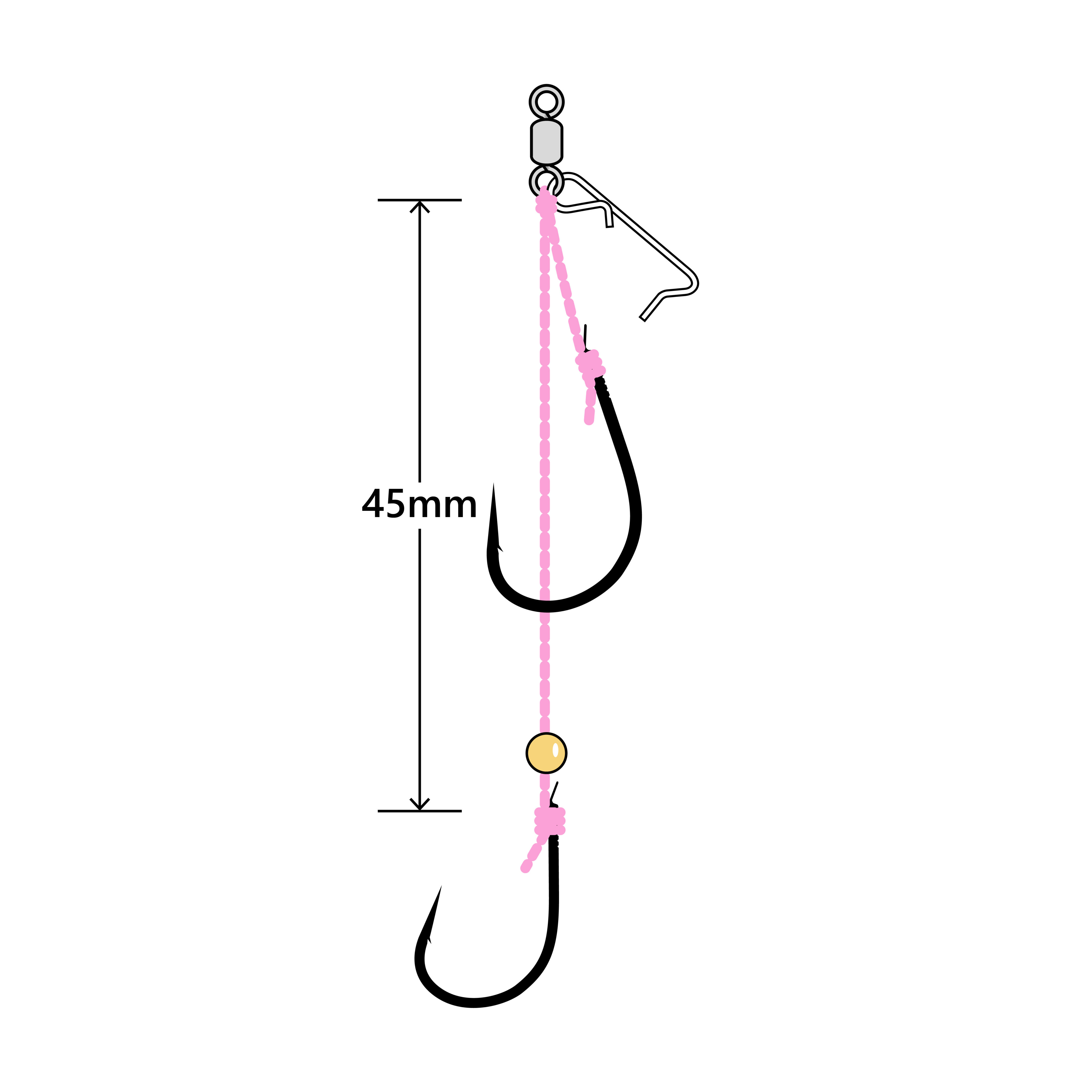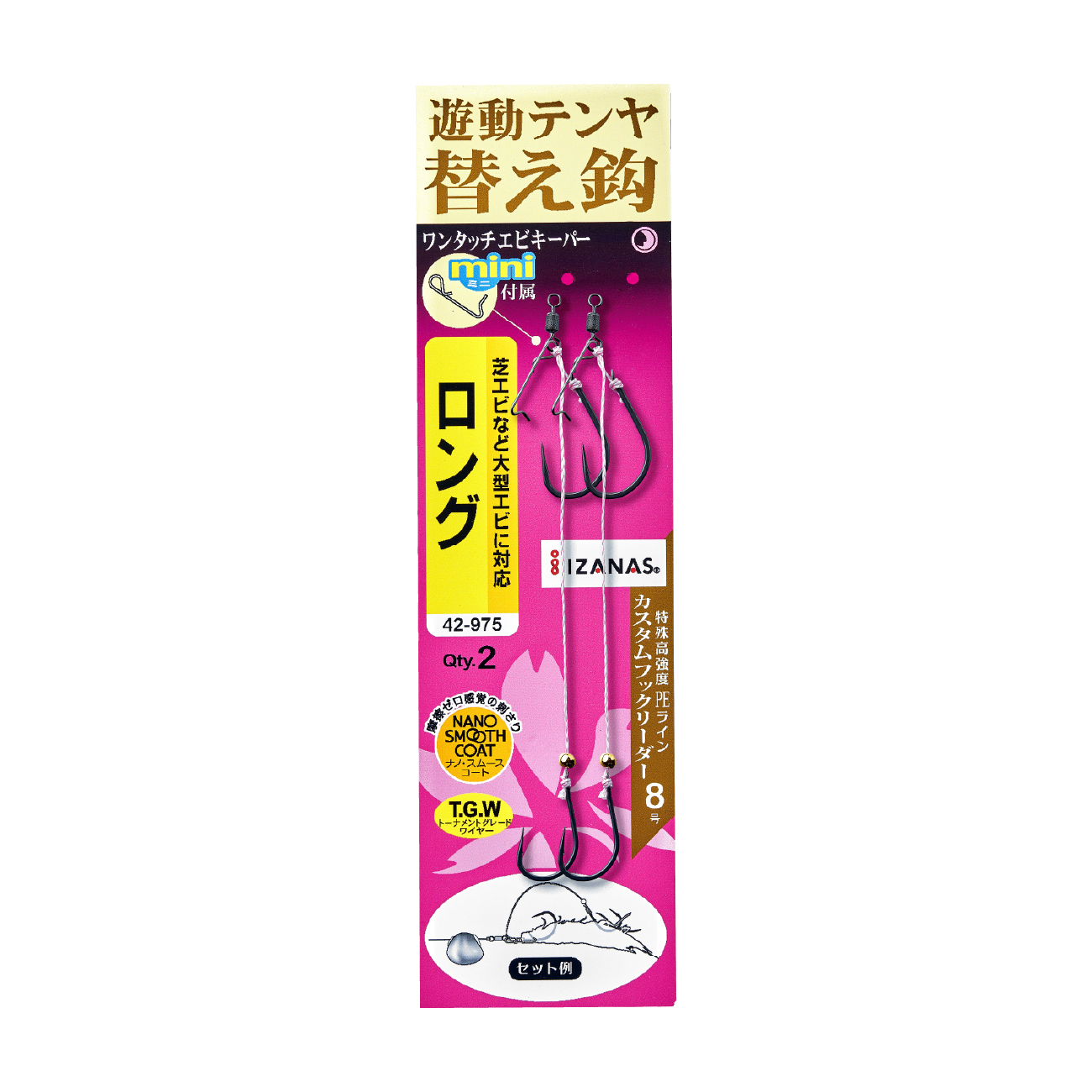 ハリスには強度としなやかさを併せ持つ桜幻カスタムフックリーダー8号を採用することで活きエビだけでなく、冷凍エビにも対応し、頭が取れにくい仕様。フックには実績のあるフッキングマスターを使用し、親バリはサイズL、孫鈎はサイズS。新開発のワンタッチエビキーパーminiを搭載。