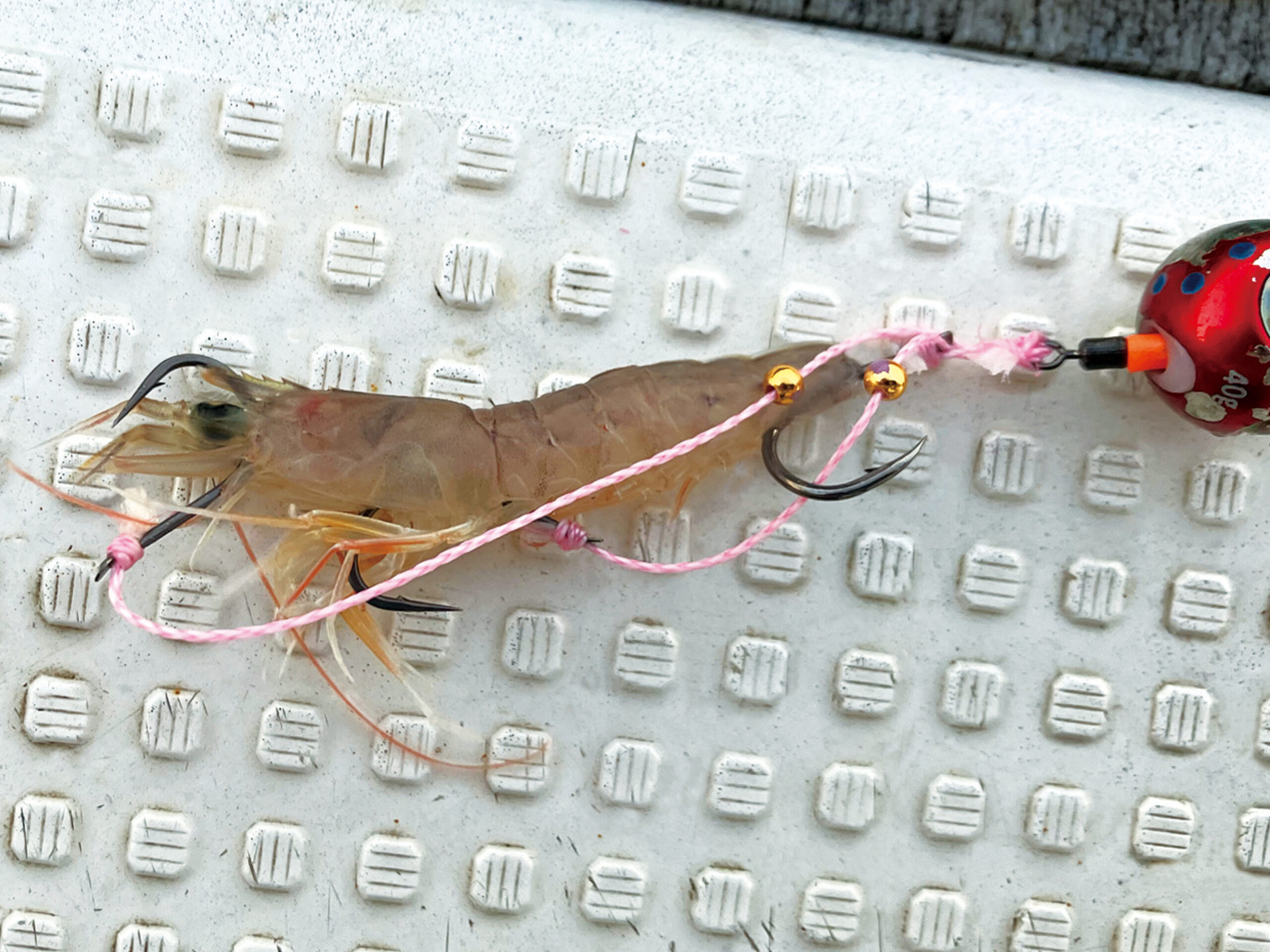 活きエビに負担の少ない小型親鈎はケン付きでエビをがっちりホールド孫鈎ダブルでフッキング率アップ!中~大型のエビには尾、腹、頭部と3点のバイトポイントをカバー。小さなエビには3匹付けなど欲張り仕様にも対応。カスタムフックリーダーの強度としなやかさと適度な張りが活きエビの動きにも追従。しなやかさは冷凍エビでも頭部欠落を防ぎます。