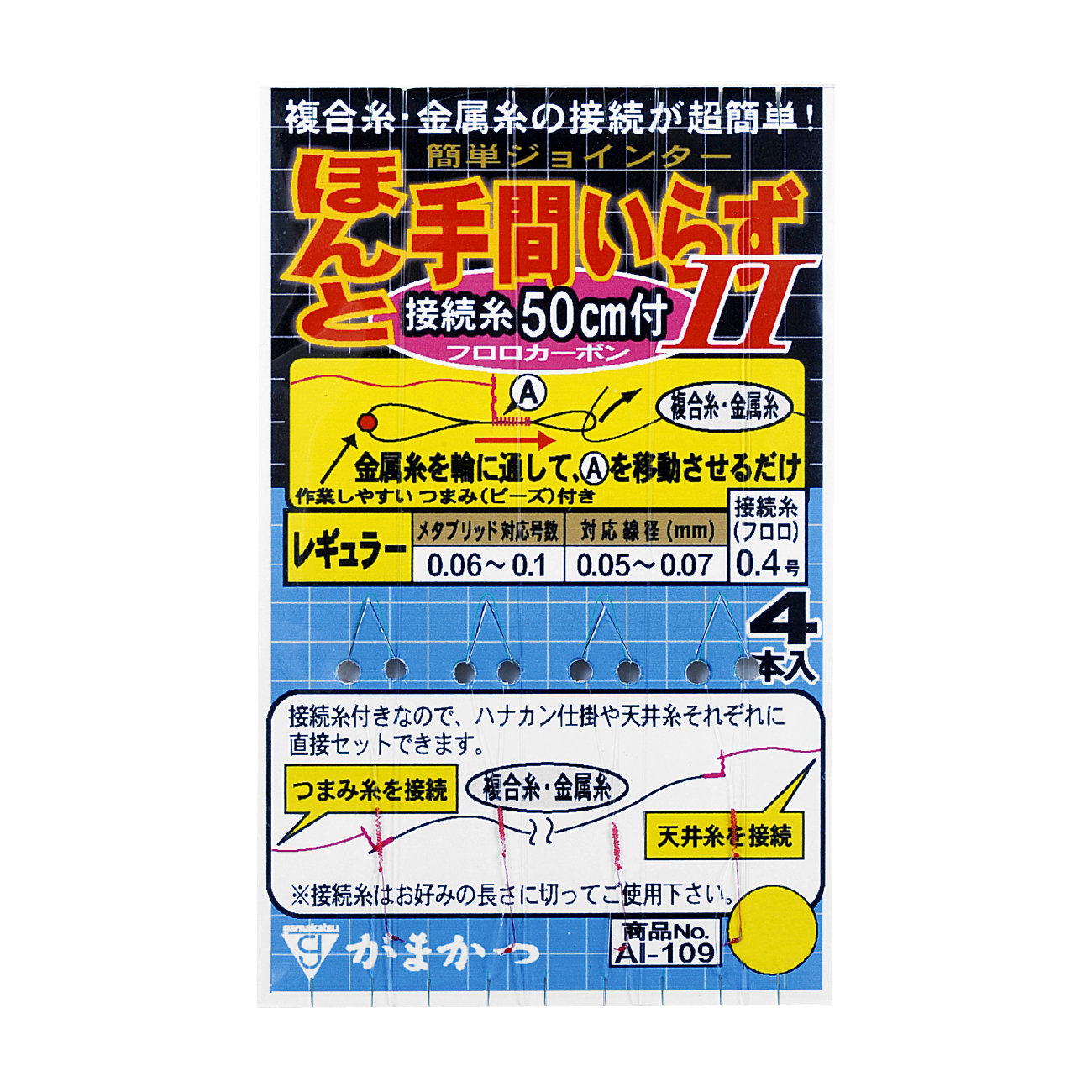 | AI-109 | 細糸用(1) | 0.03〜0.04 | 0.04〜0.05 | 0.3 | 4本 | 550 | 4549018380460 |
