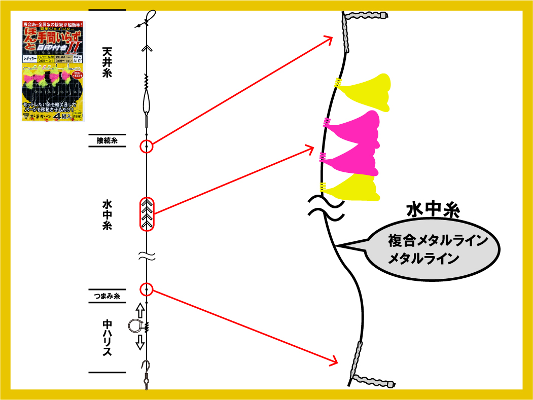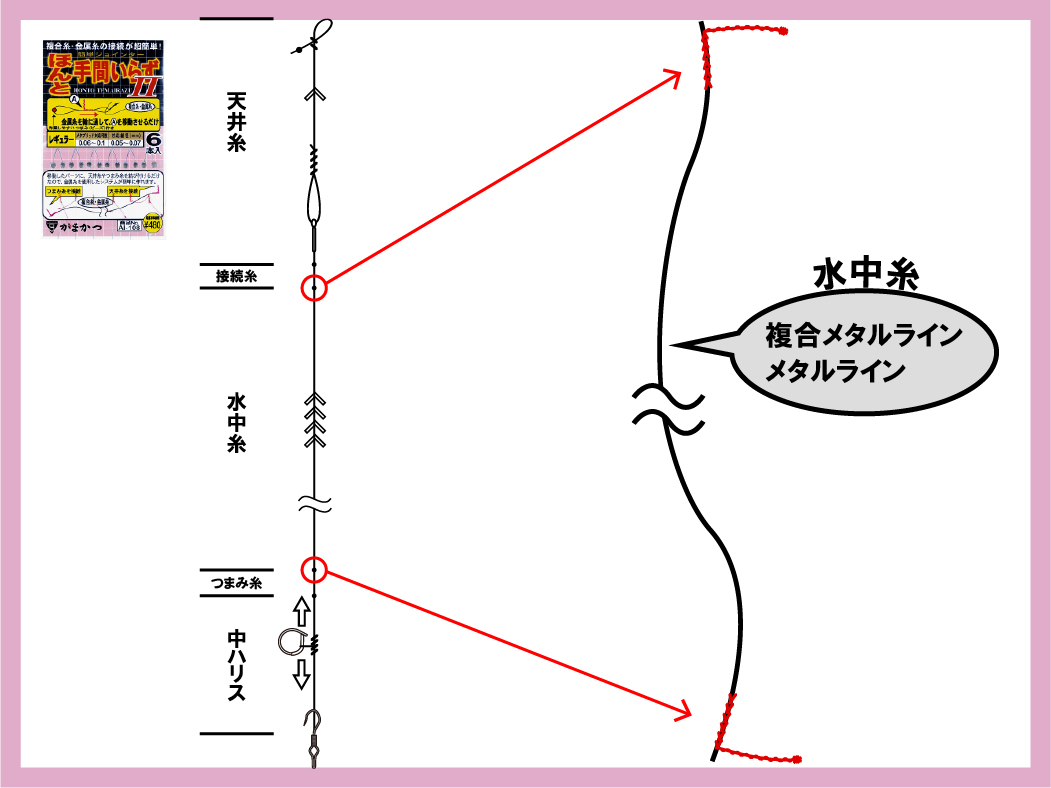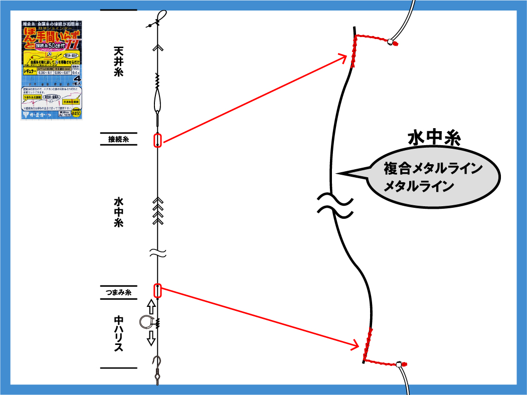 フロロカーボン接続糸付で天井糸やハナカン仕掛それぞれに直接接続いただけます。