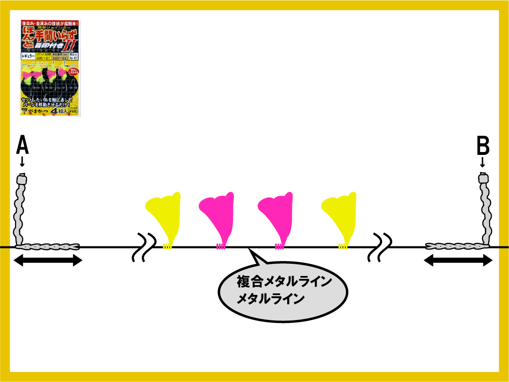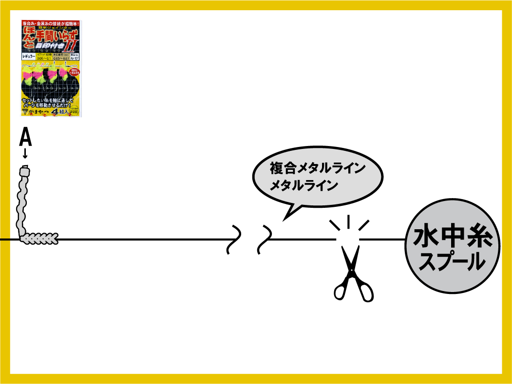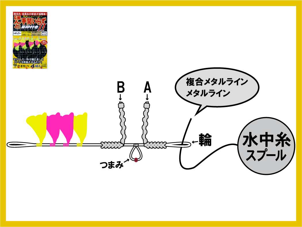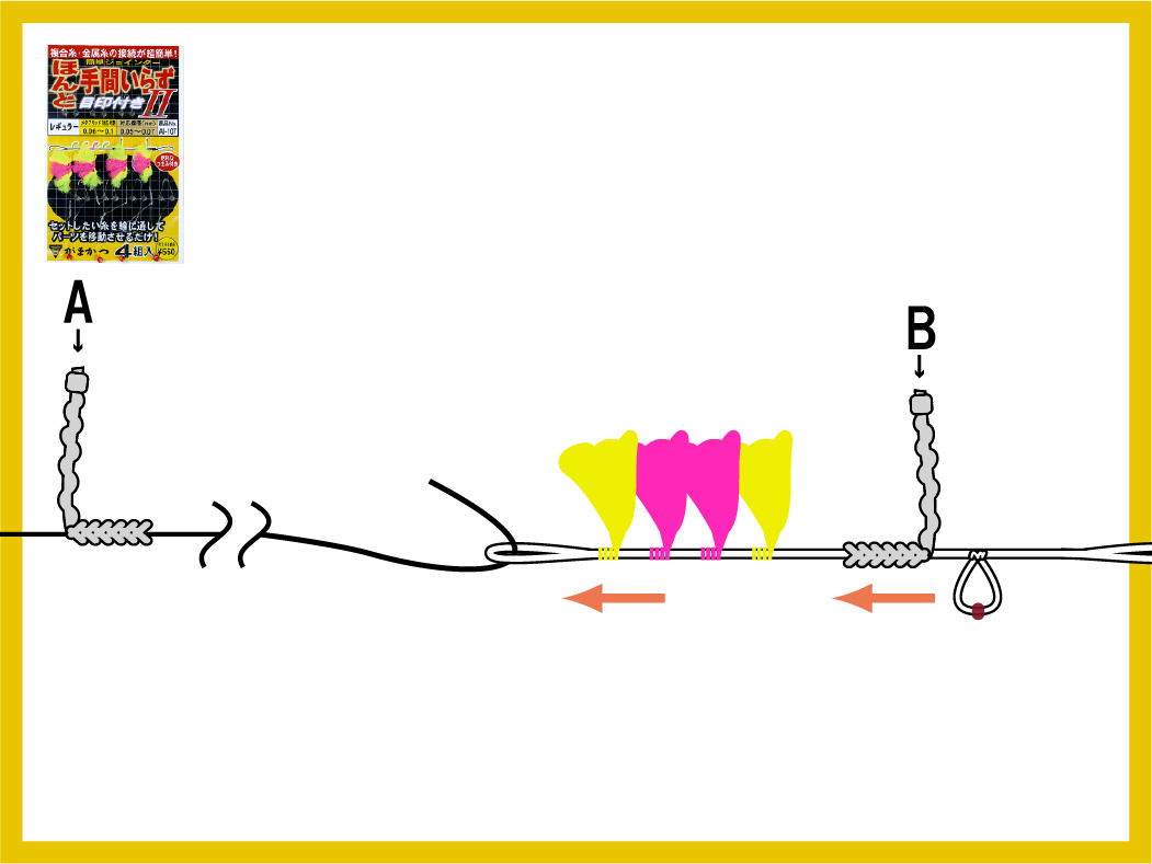 1.水中糸を上図の輪に通して(A) を水中糸へ移動させます。この時、つまみを持つと作業がしやすくなります。