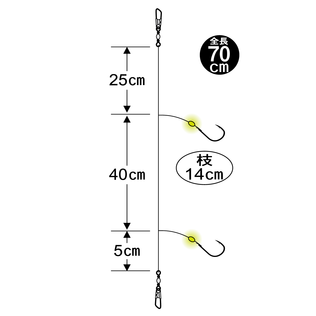 鈎には、海エビ・虫エサ等さまざまなエサに対応できる「チンタメバル」を使用。夜釣りでも扱いやすいショートハリス仕様で、積極的に底を攻めることができる様、捨て糸が短い根魚専用設計になっています。