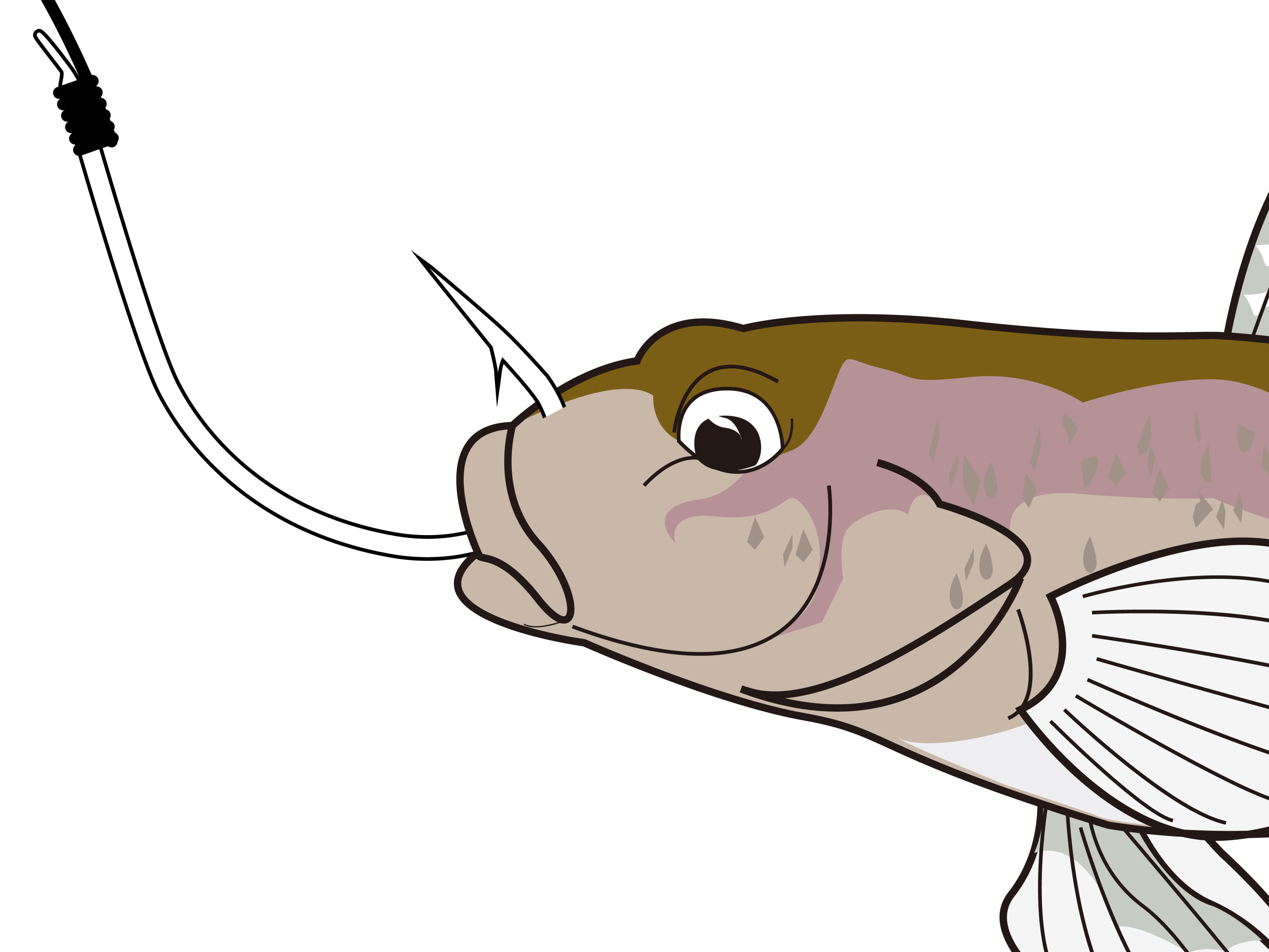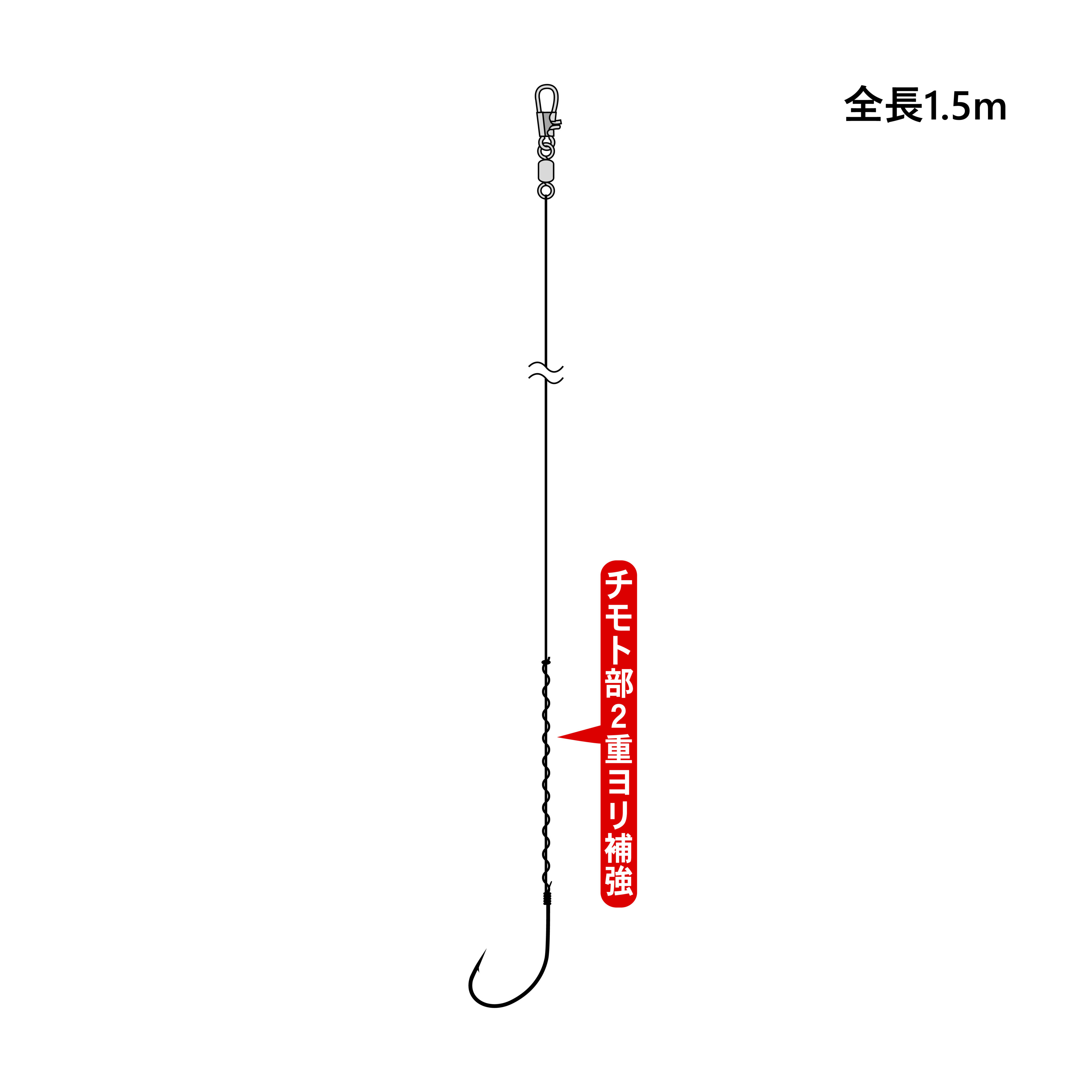 鈎のチモトに巻いた糸オモリがエサのエビを安定させます。フロロカーボンを使用したチモト2重結びを採用。マゴチの歯からハリスを守ります。