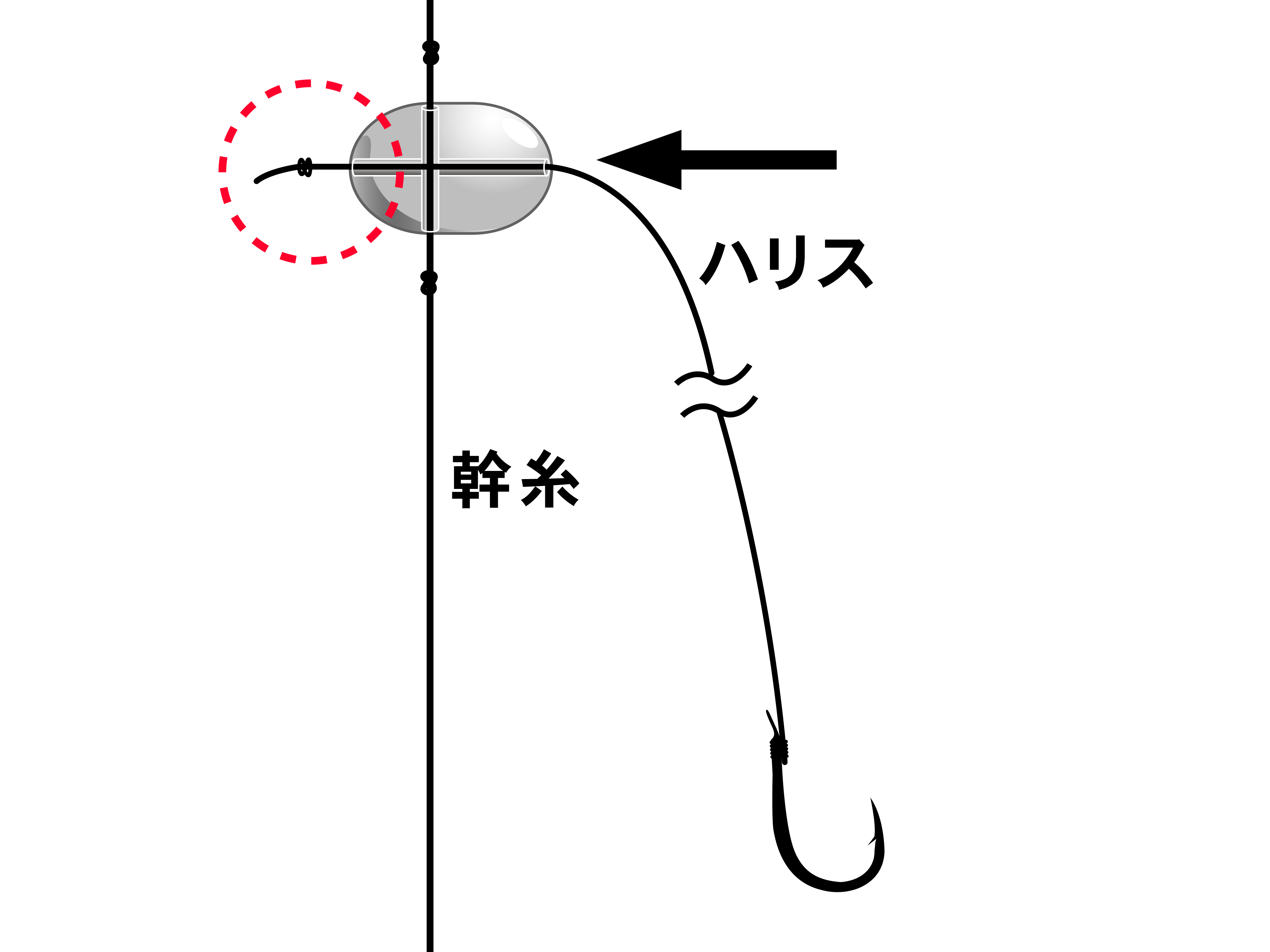 矢印の方向からビーズの穴にハリスをさし込み、先端に結びコブを作ってハリスが抜けないようにセットします。