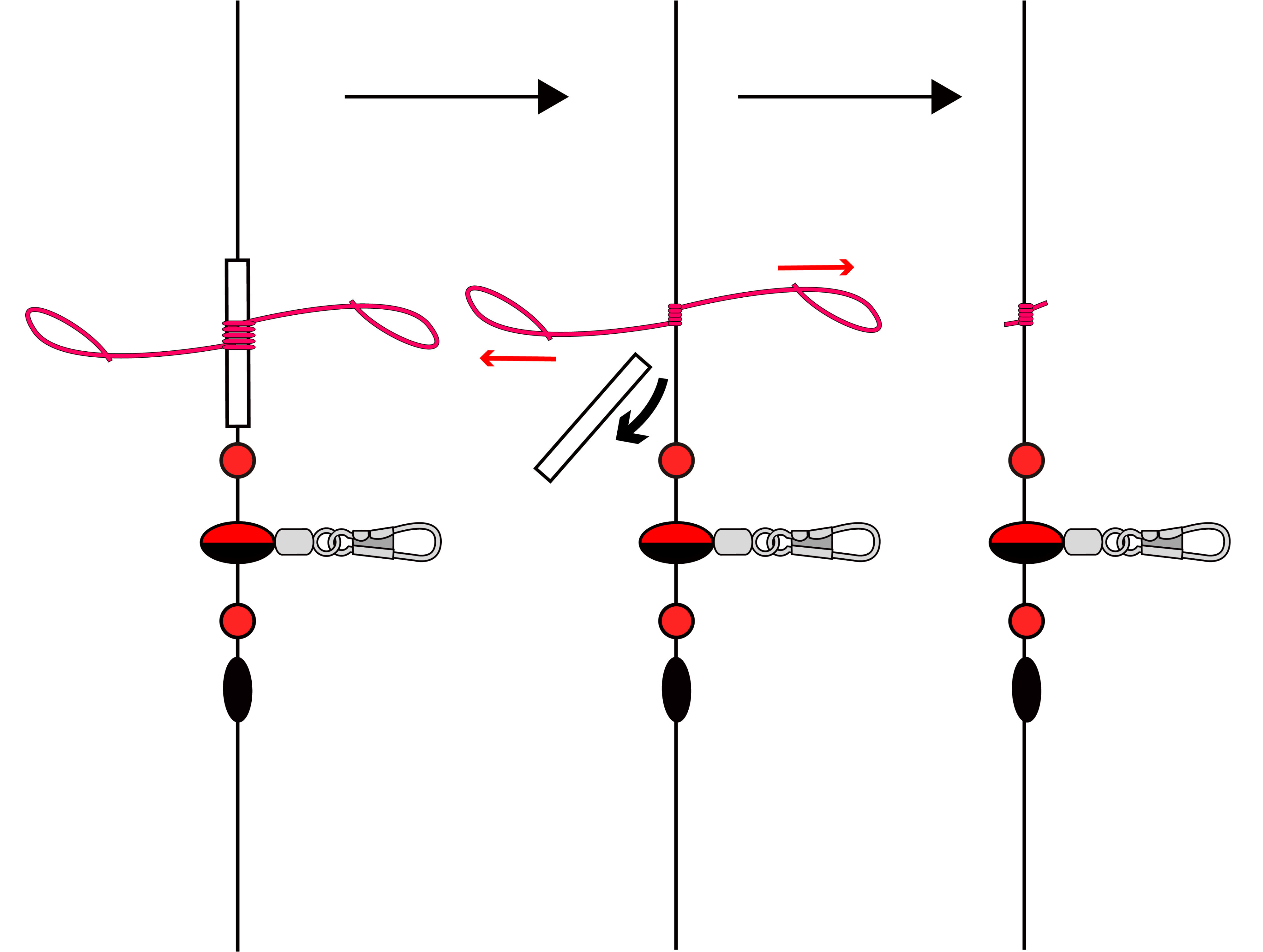 リール糸に移動したあと、台パーツを引き抜きます。輪を左右に引っ張って引き締めたあと、余分な糸をカットして完成。これを上下に移動させることによりウキ下寸法を調整できます。