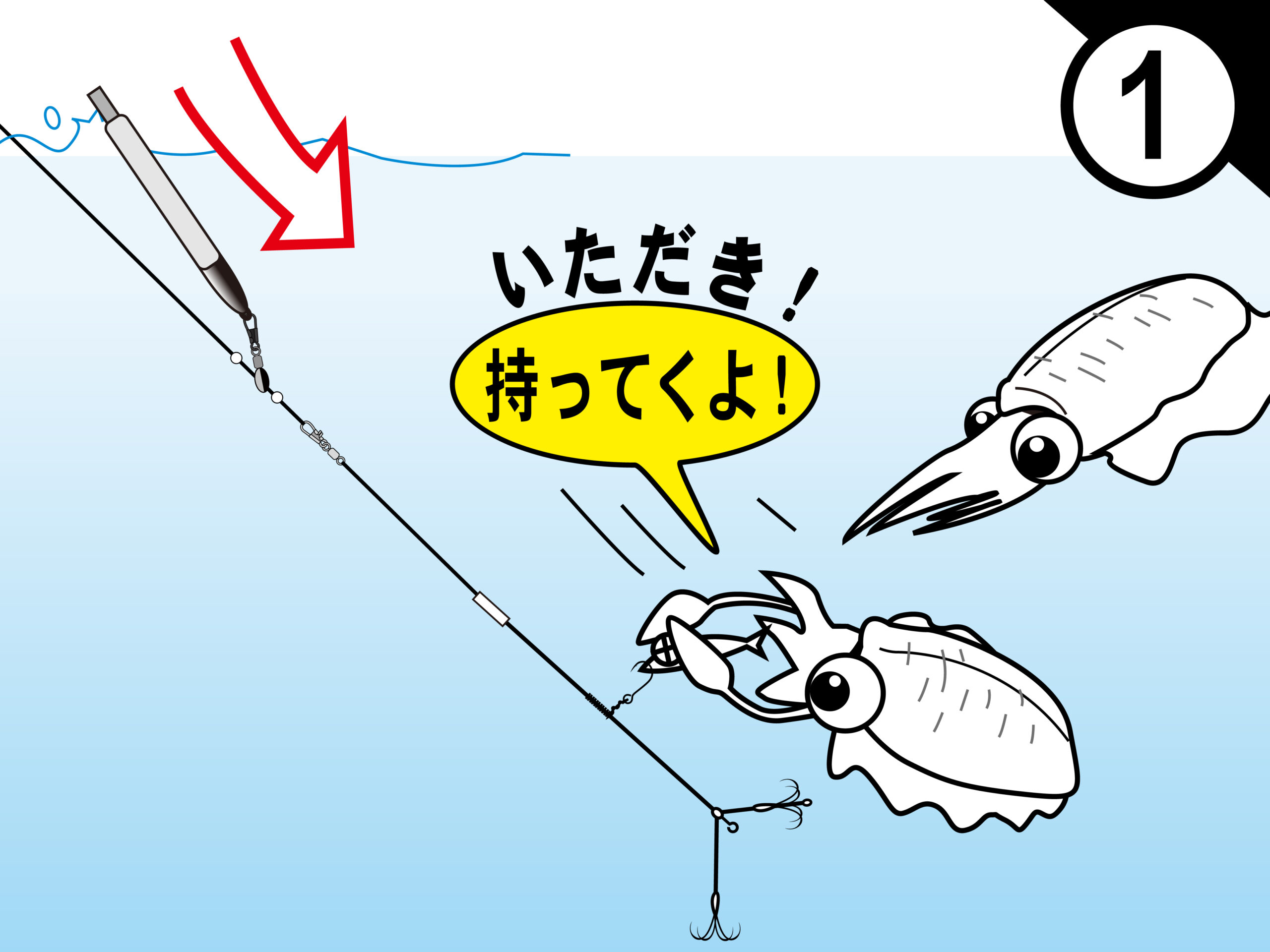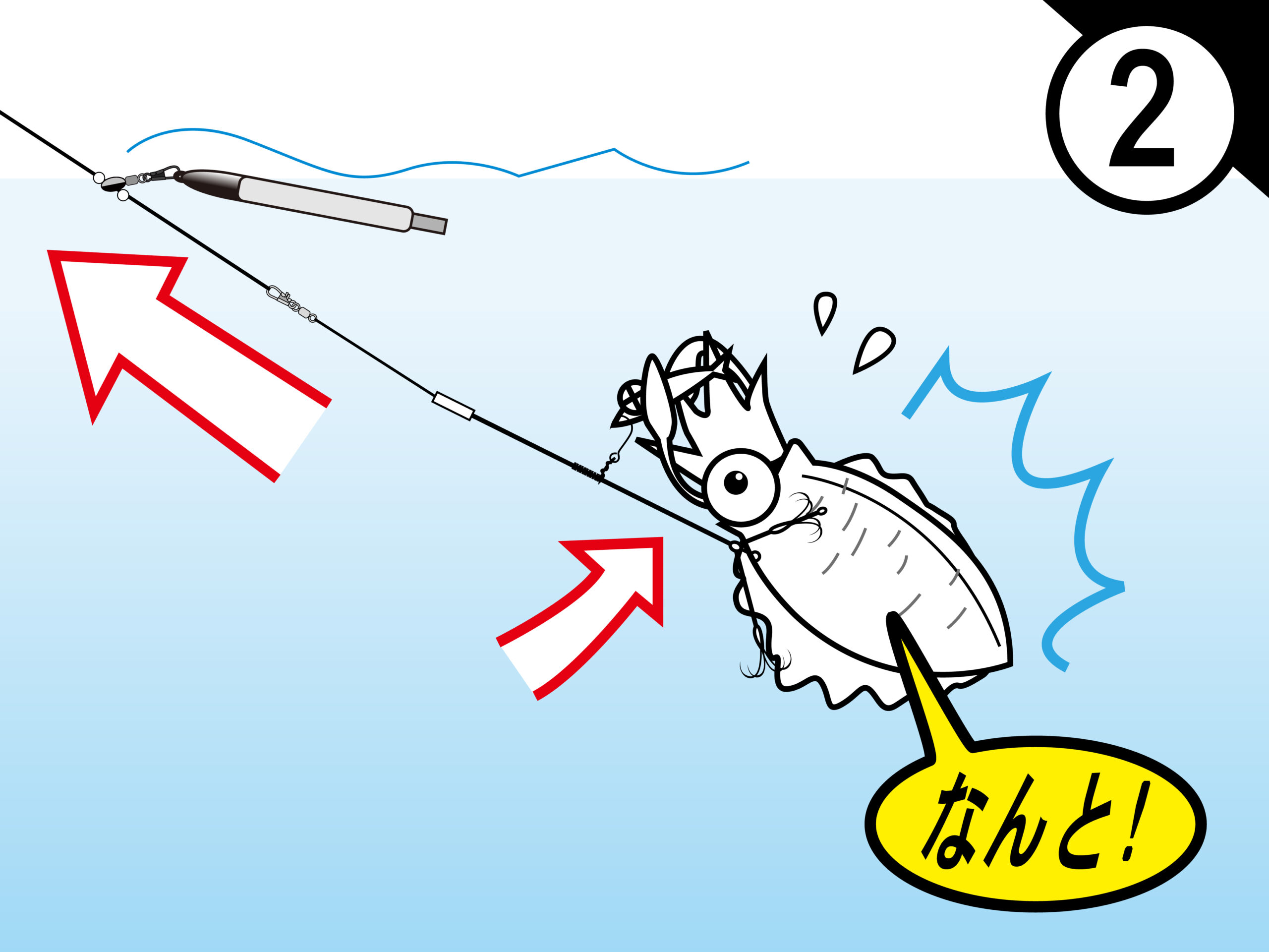 2.仕掛がはね上がり、イカをしっかりとキャッチ!左右に分かれた段差を付けた2組の錨で逃しません。