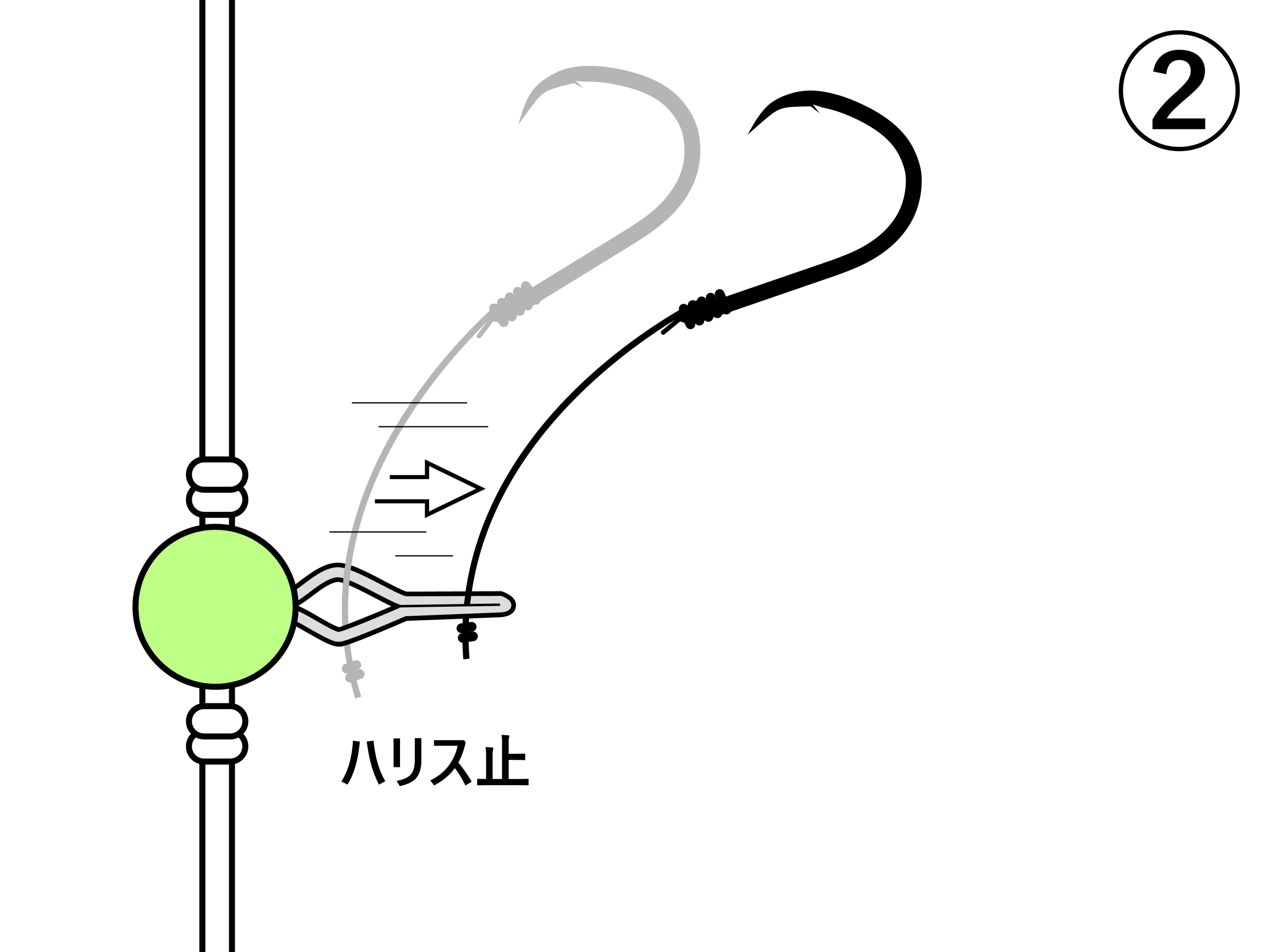 ハリス止の穴の方へ引っ張り、枝鈎をはずします。