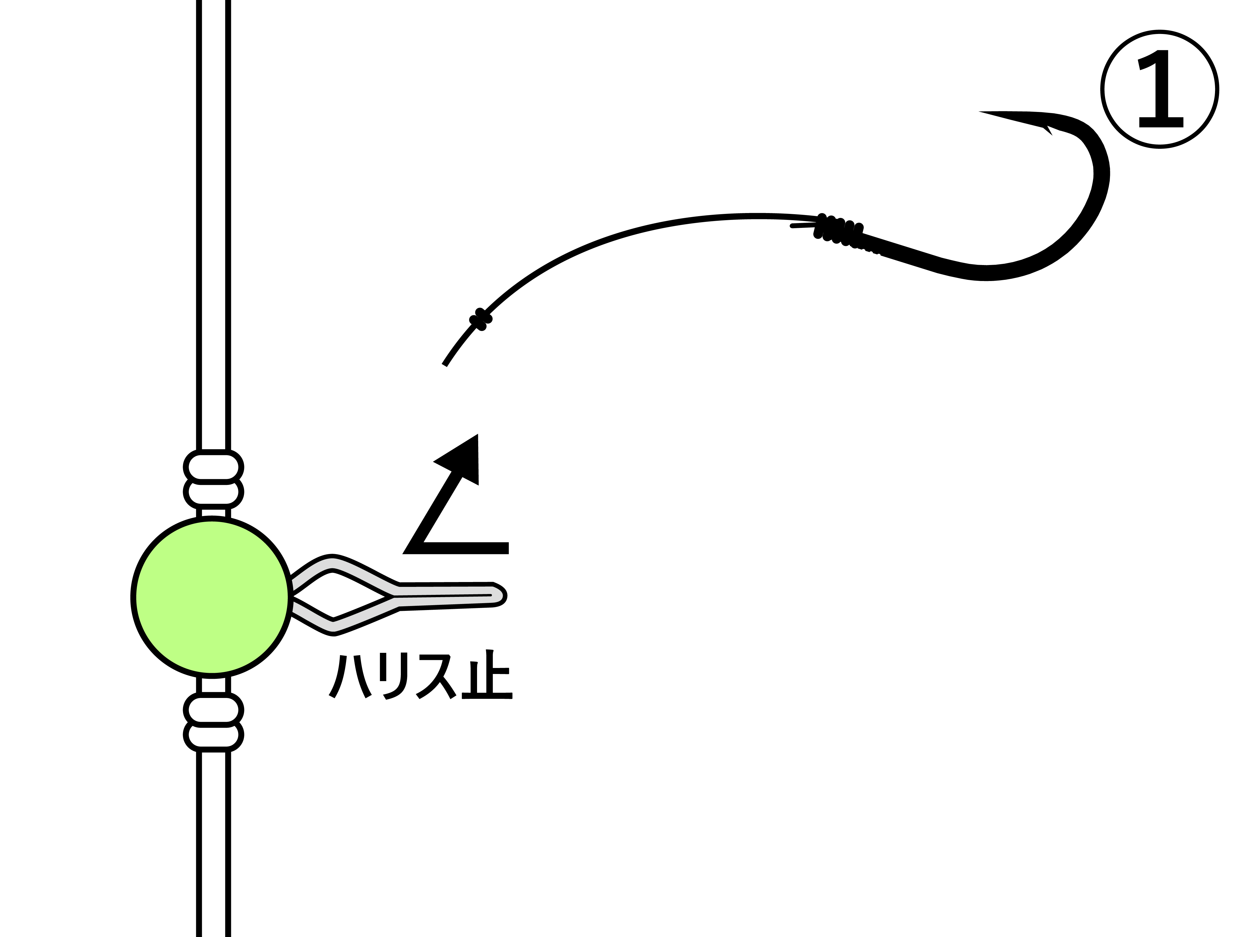 替え鈎のハリスの先端に結びコブを作ります。ハリス止の穴に挿入し、溝の方へ引っ張って固定したら完成。糸を通しやすい大穴仕様のハリス止めビーズなので、糸ヨレ解消!簡単に鈎交換が行えます。