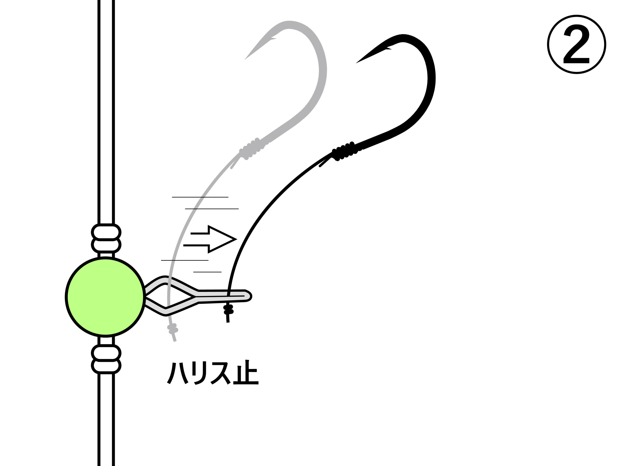 ハリス止の穴の方へ引っ張り、枝鈎をはずします。