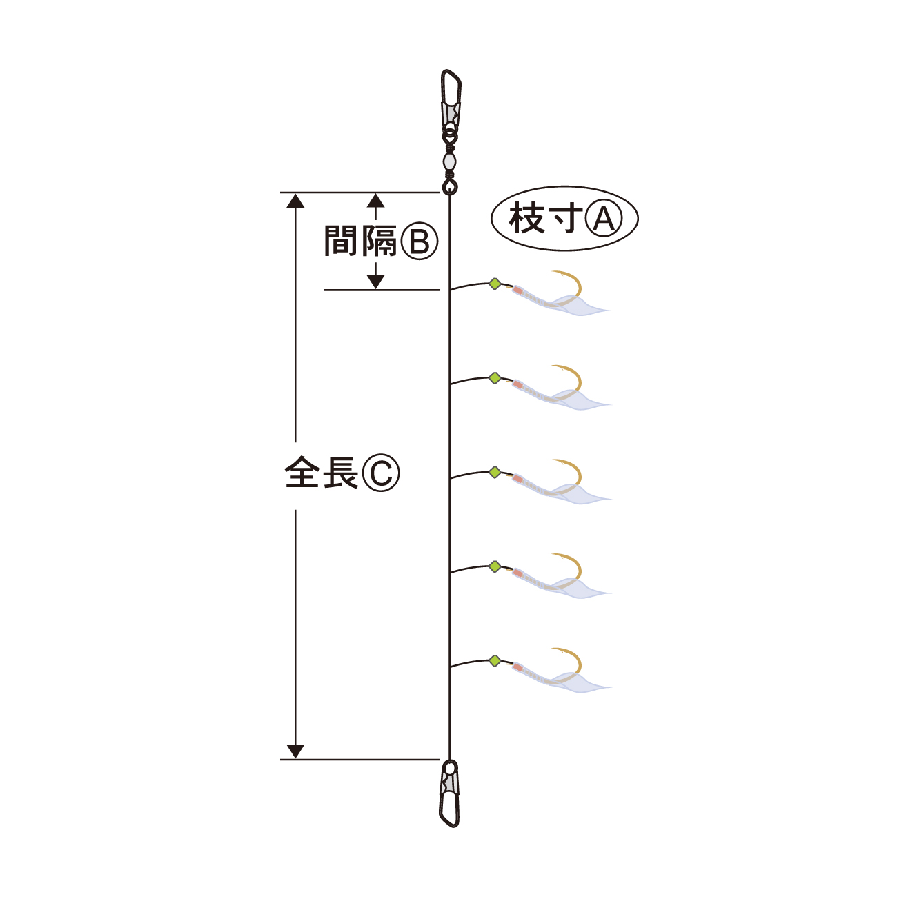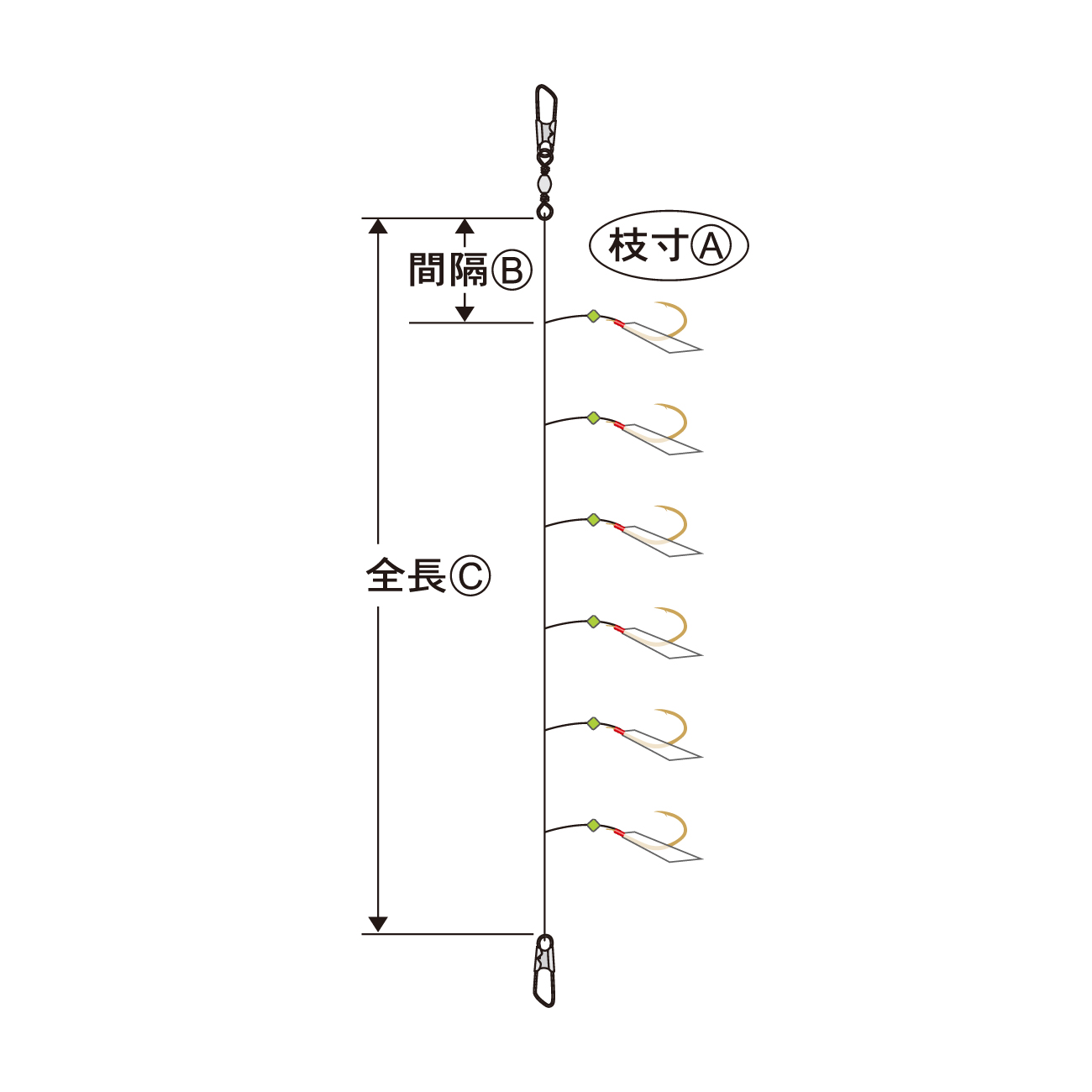| 品名コード | 号数 | ハリス | 幹糸 | 枝寸 | 間隔 | 全長 | 入数 | 希望本体価格(円) | JANコード |