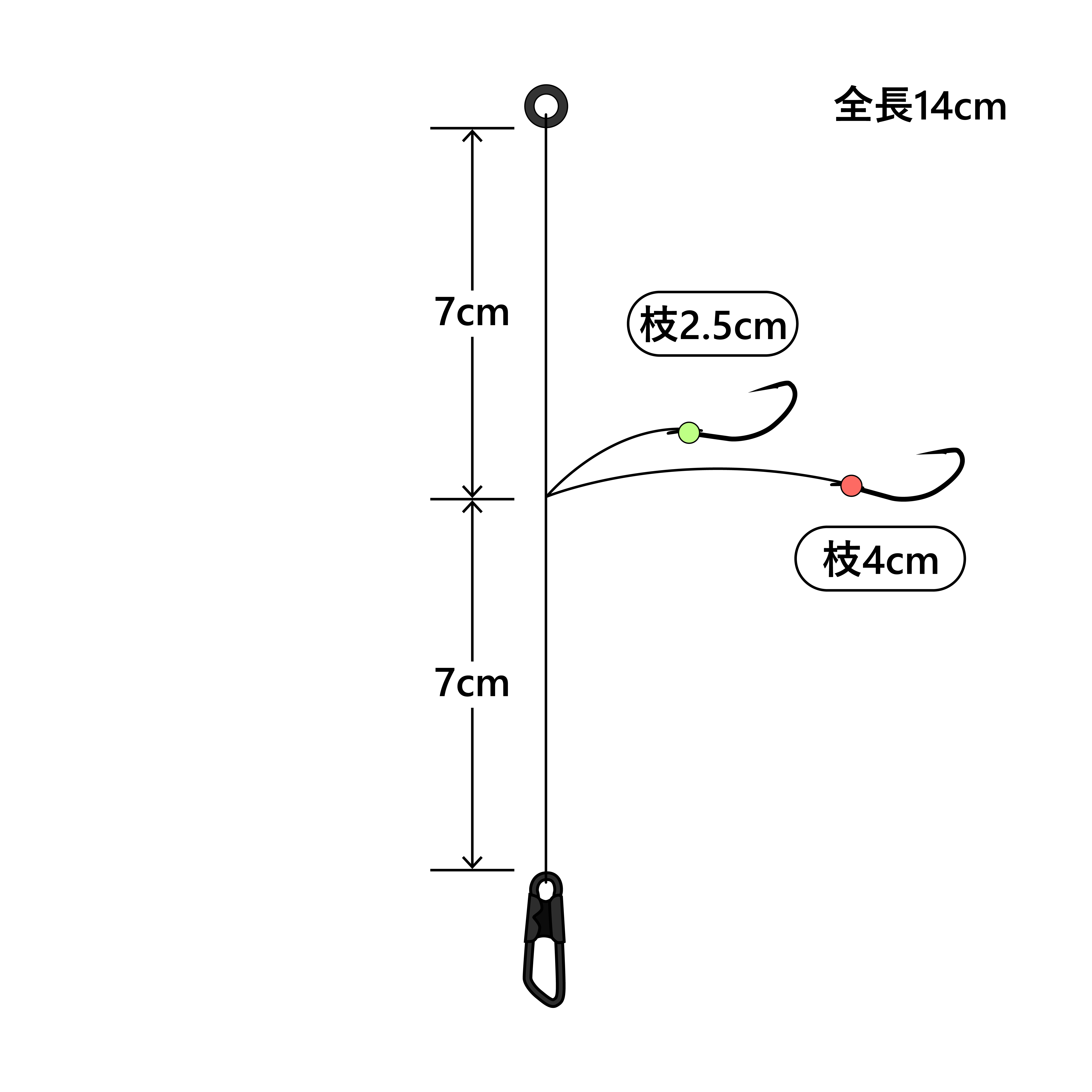 仕掛の上部に装着し、短ハリスに寄せ餌のブドウ虫、長ハリスに喰わせエサを付ける事もできる「集魚ダブル仕掛」。仕掛の下部に装着して「底集中ダブル仕掛」と、お手持ちの仕掛をカスタマイズすることができます。鈎数を増やすことにより、高活性時の数釣りにも効果を発揮します。餌のボリュームと、不規則な動きで高アピール!底集中で攻められる!
