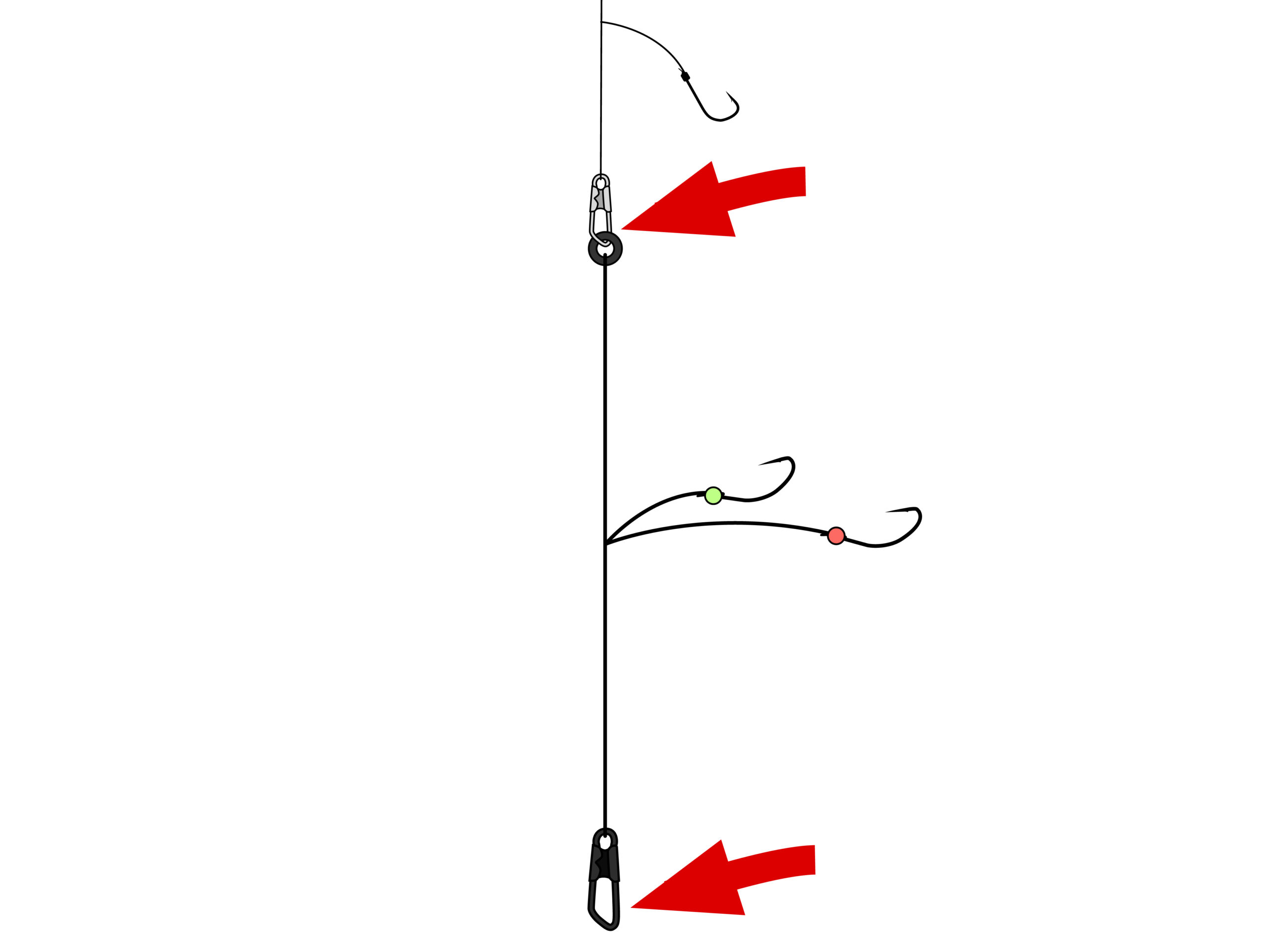 上部のリングはお手持ちの仕掛へ接続し、下部のスナップにはオモリを付けてご使用ください。