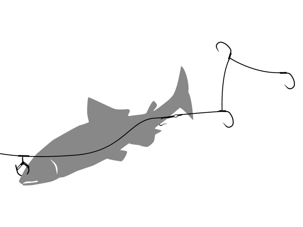 大鮎対応の攻撃的チラシ仕掛です。鈎がより広範囲に散らばるようにハリス角度を設定した3本チラシ仕掛です。