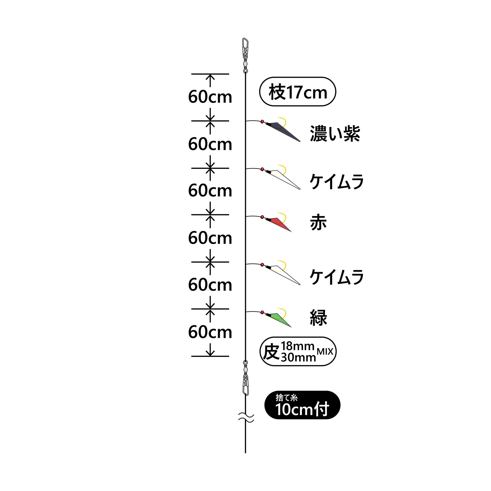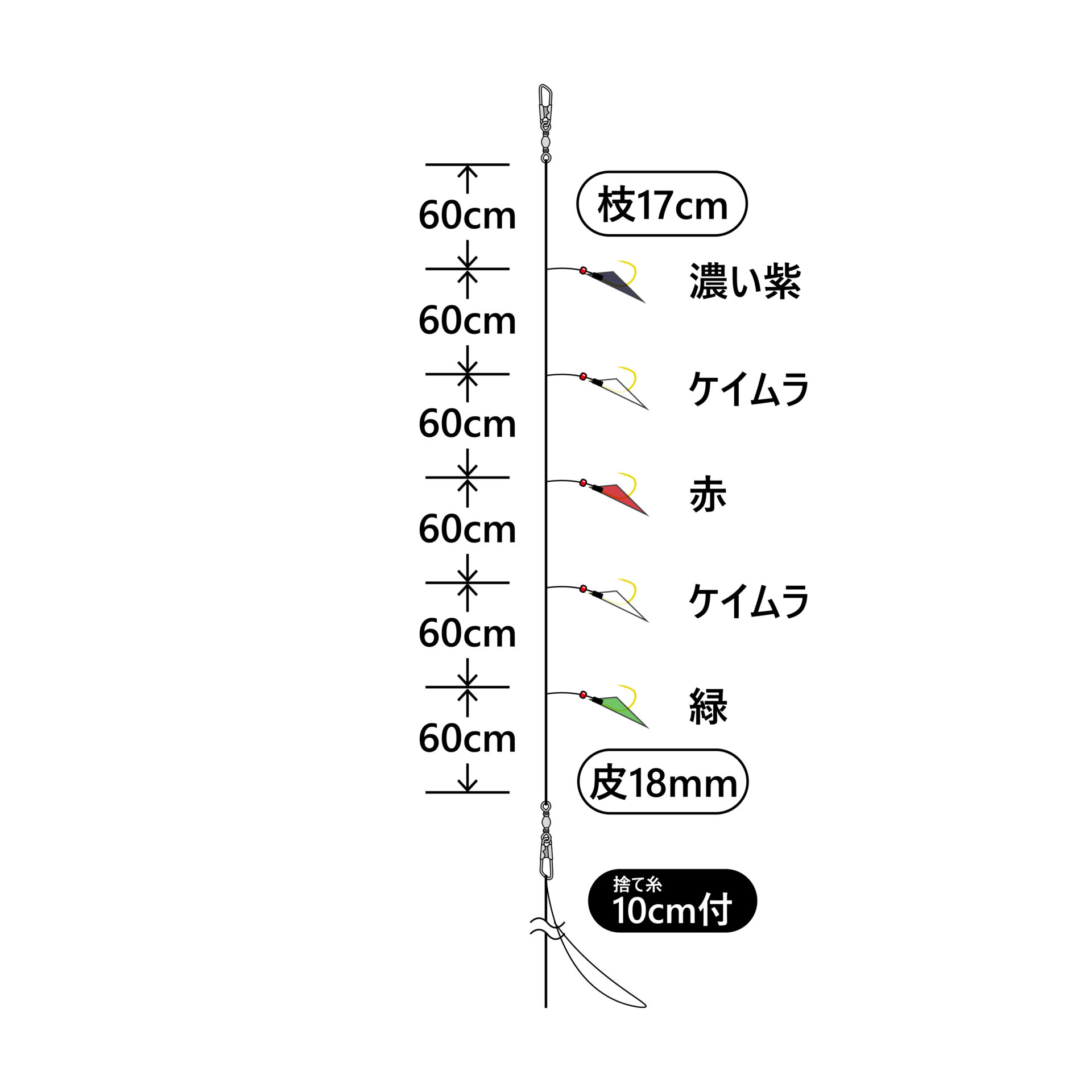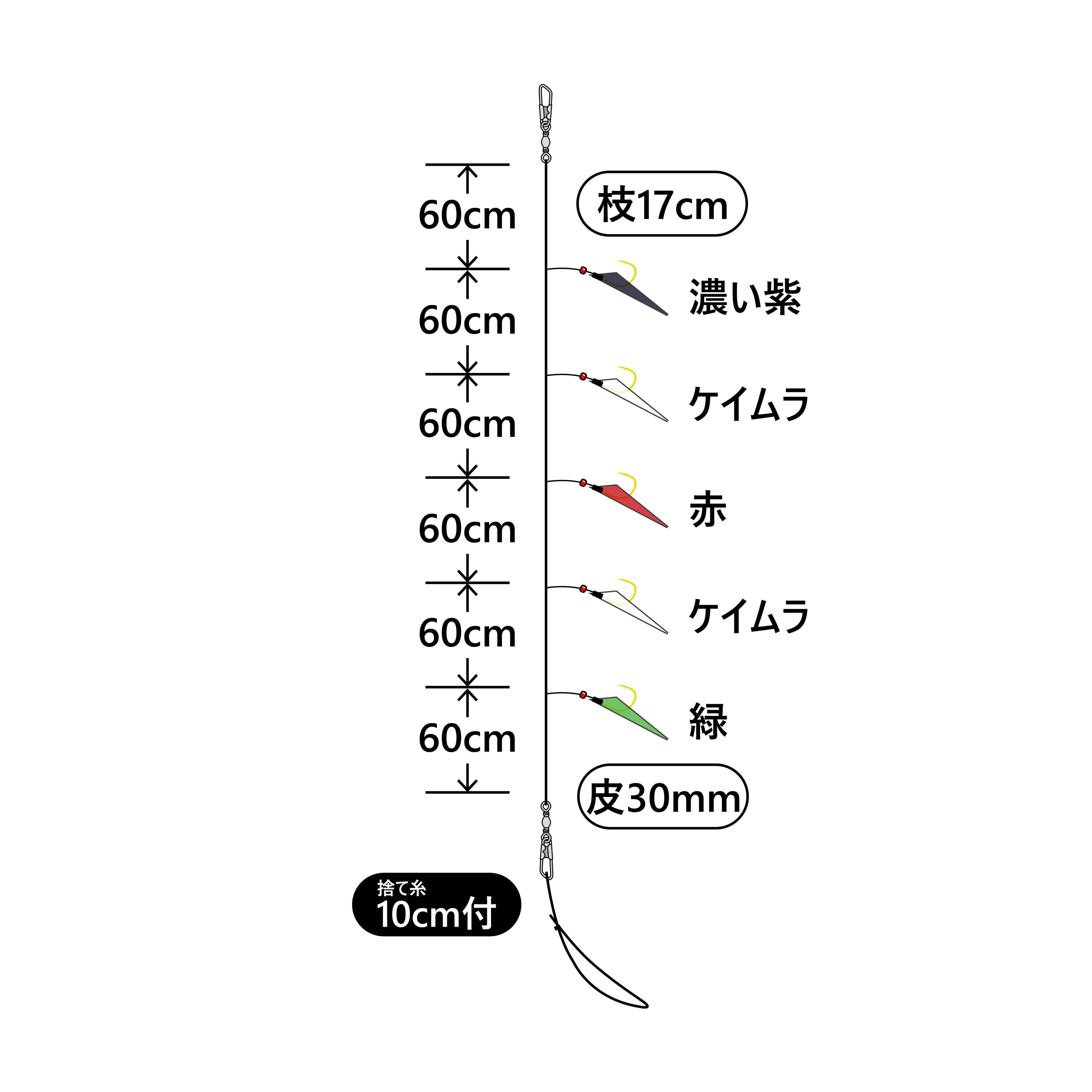 | 品名コード | 号数 | ハリス | 幹糸 | 全長 | 入数 | 希望本体価格(円) | JANコード |