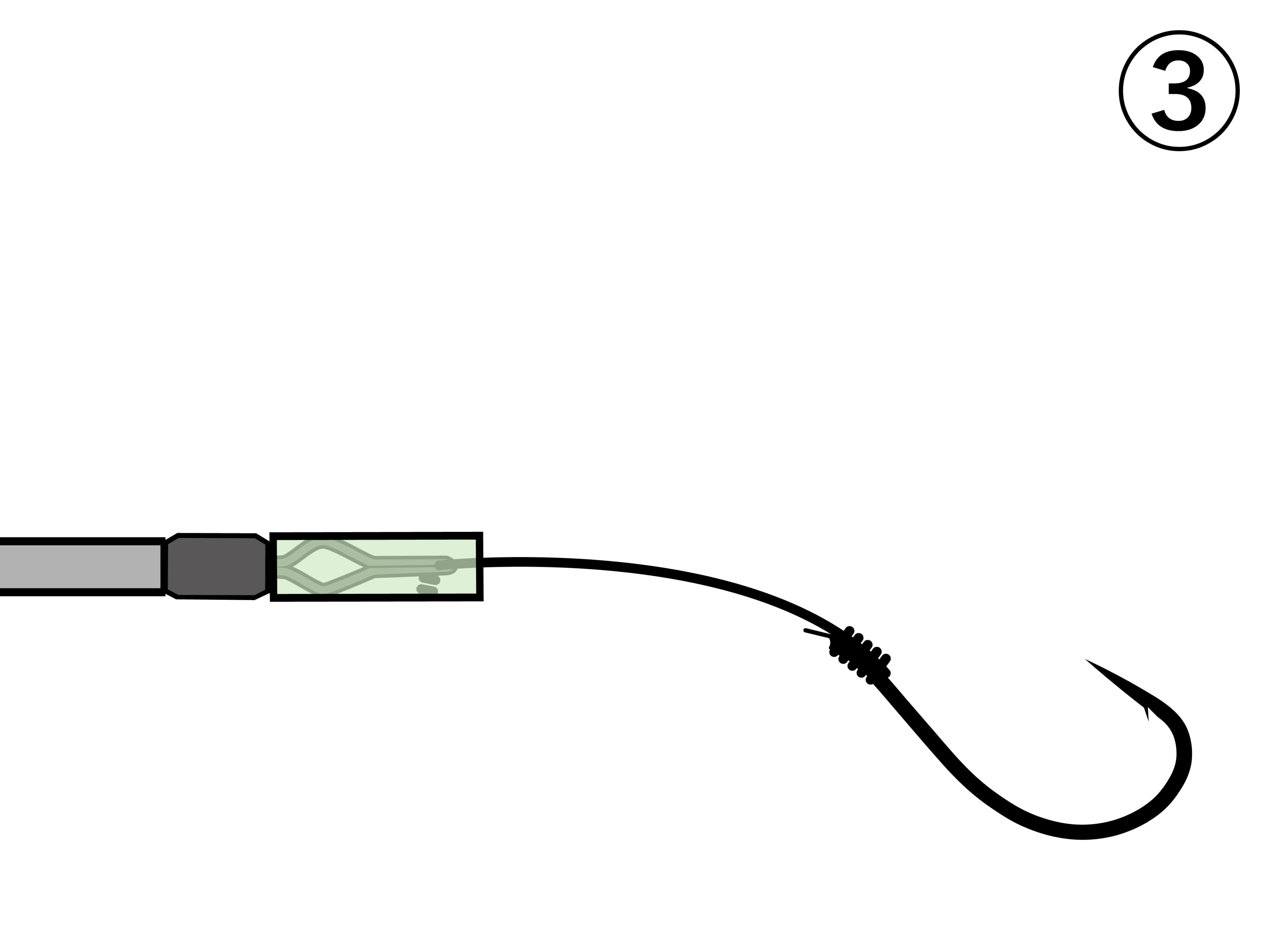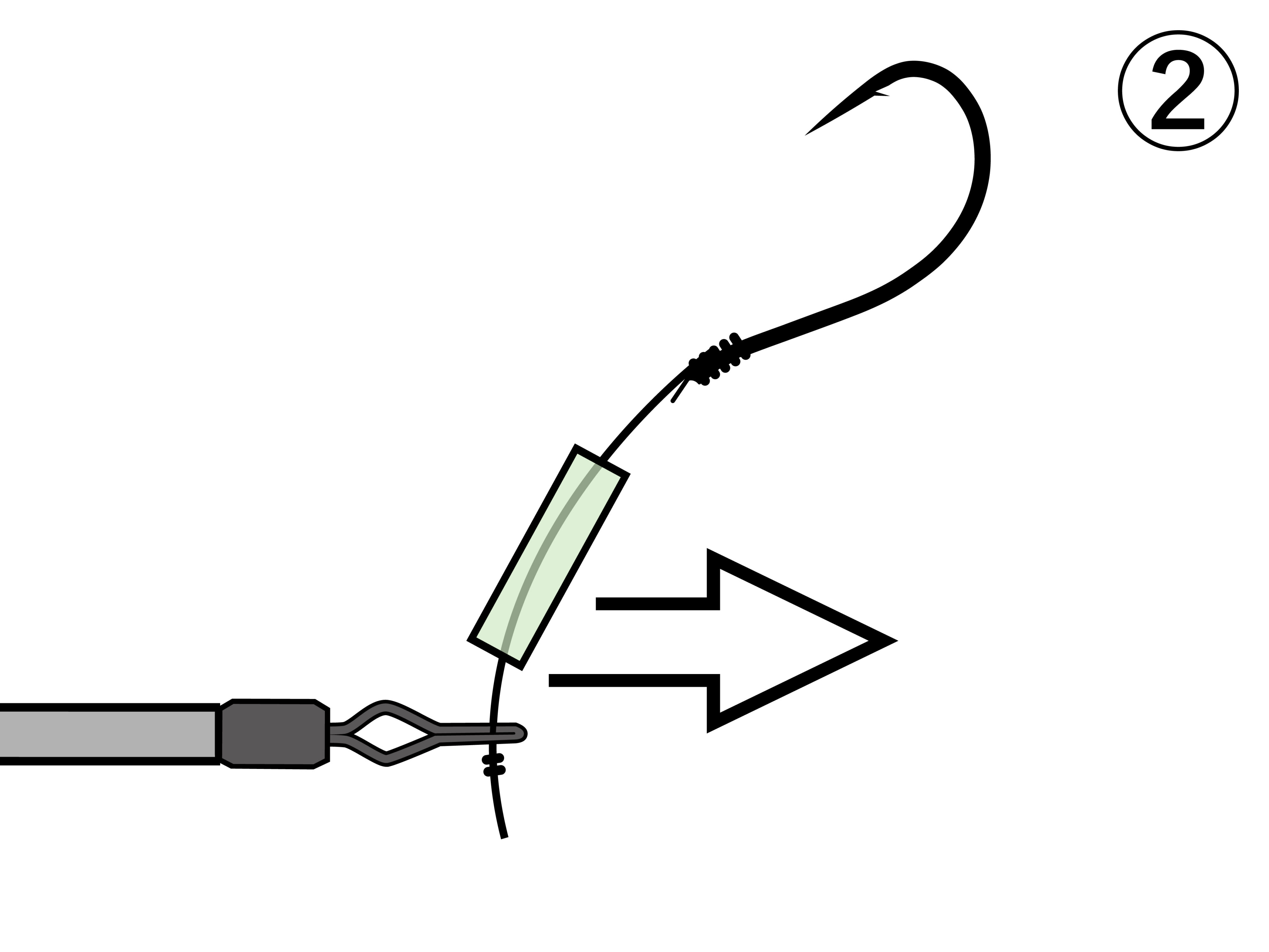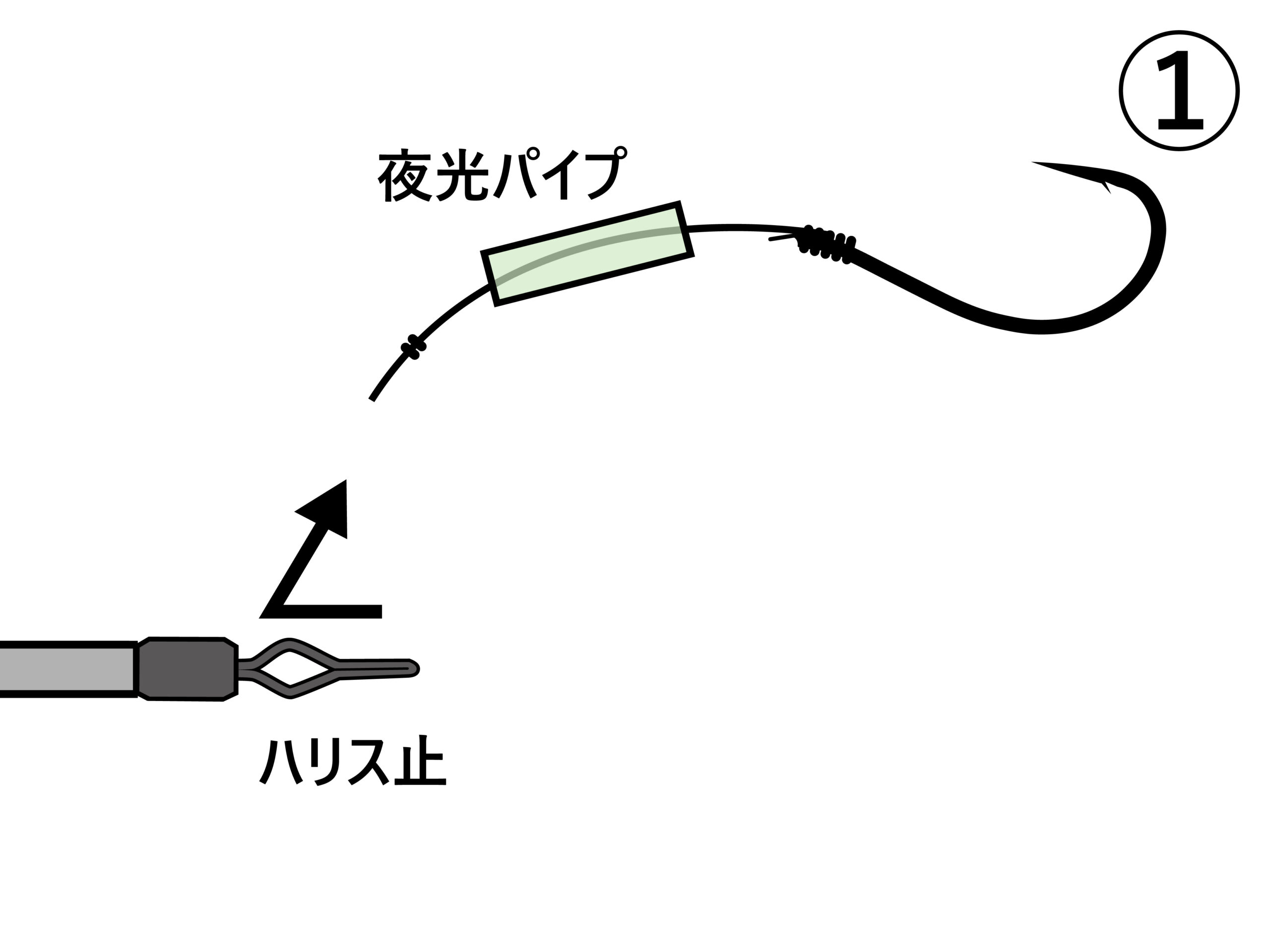 替え鈎のハリスに(1)ではずした枝鈎の夜光パイプを通し、先端に結びコブを作ります。ハリス止の穴に挿入し、溝の方へ引っ張って固定。