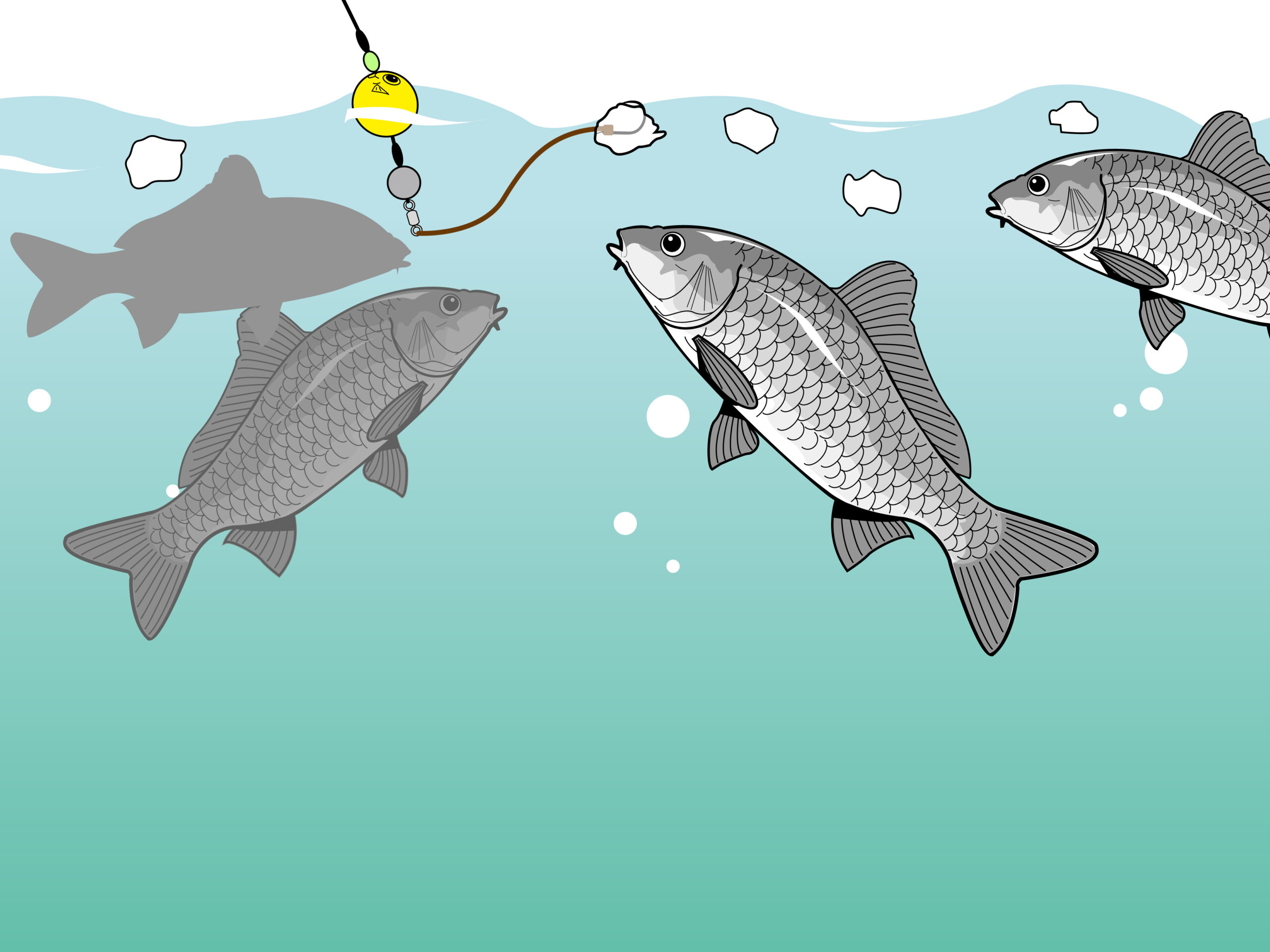 パンをちぎって水面にバラまきます。鯉の姿が見えたら仕掛を投入!漂うパンと同調させましょう。
