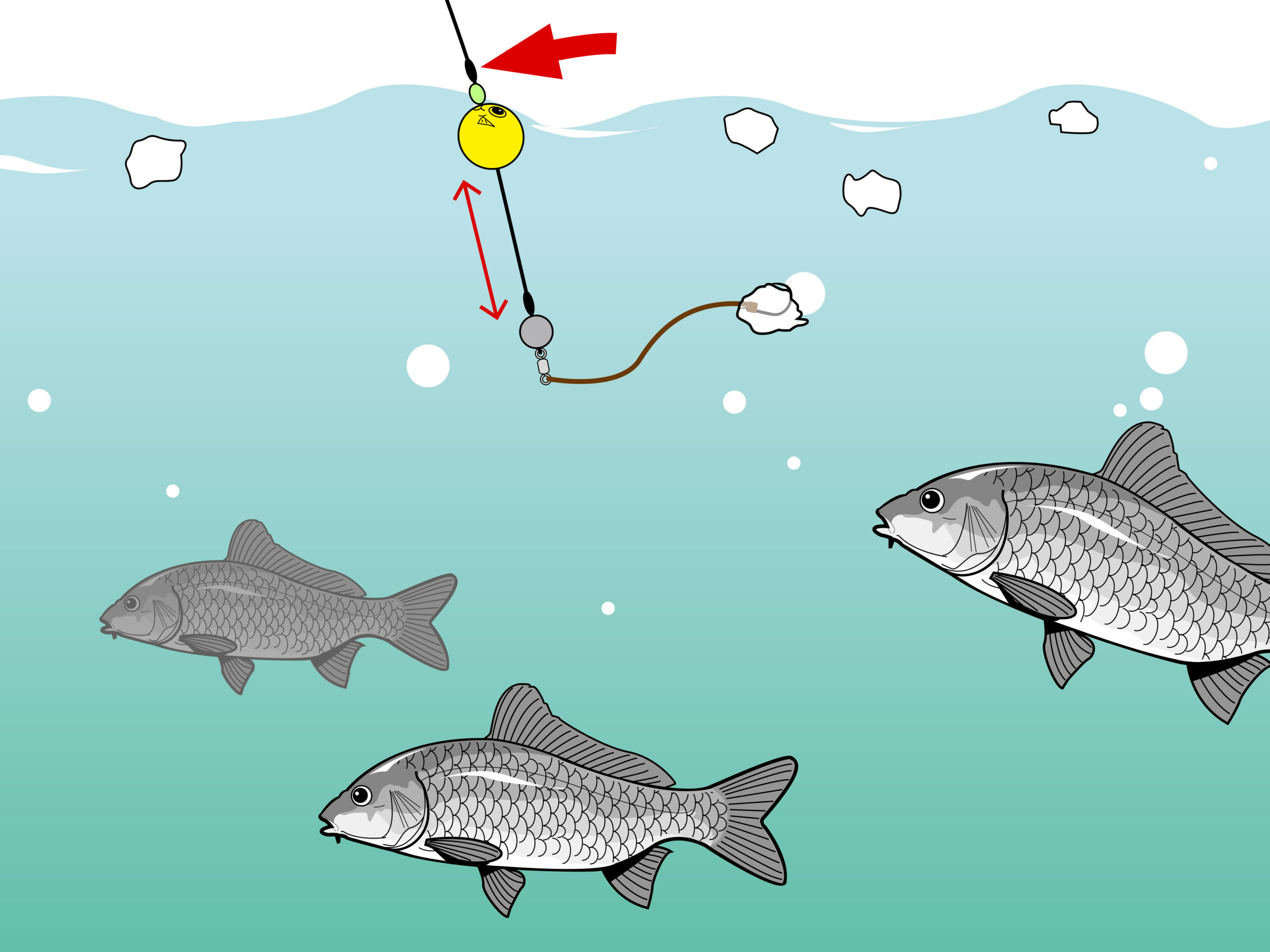 鯉が水面まで浮いてこない時は調整ゴムを上にズラし、ウキの下を長くして、少し沈めましょう。