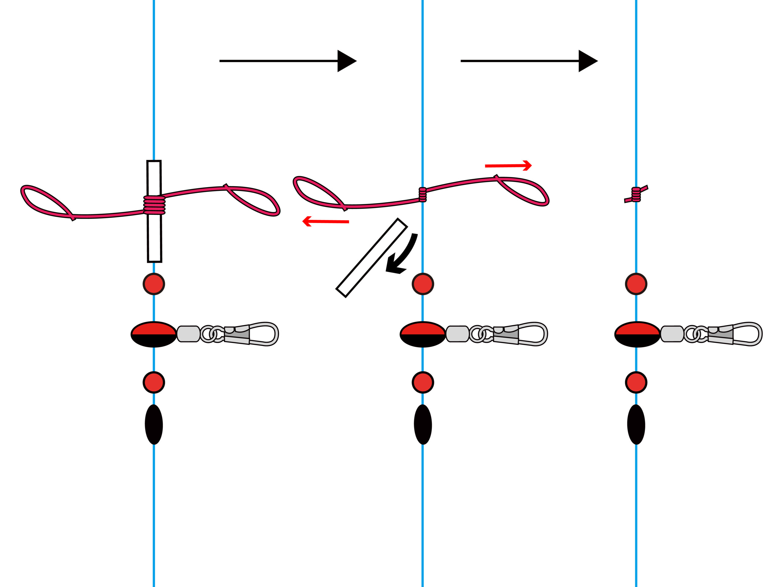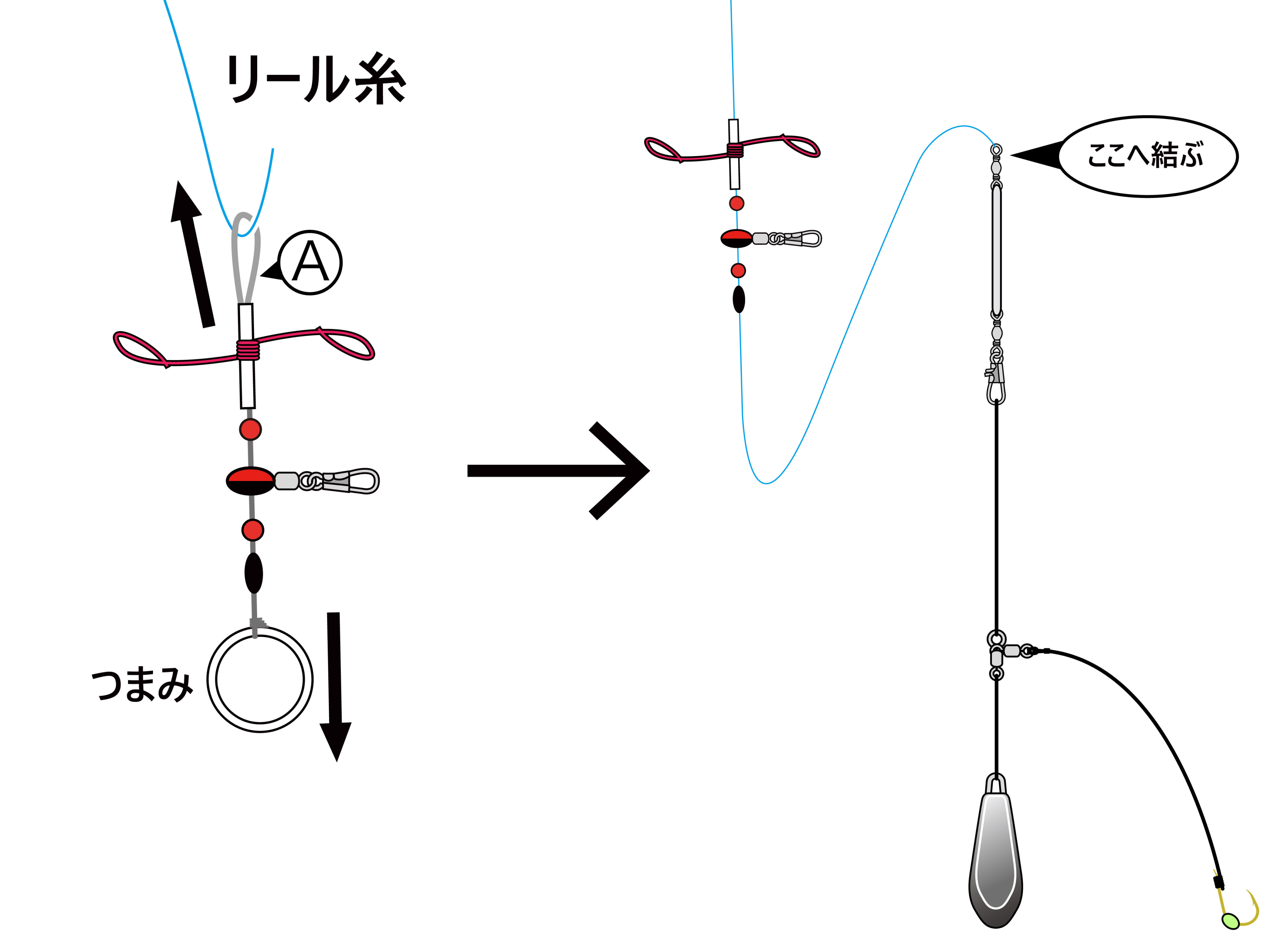 リール糸に移動したあと、台パーツを引き抜きます。輪を左右に引っ張って引き締めたあと、余分な糸をカットして完成。これを上下に移動させることによりウキ下寸法を調整できます。
