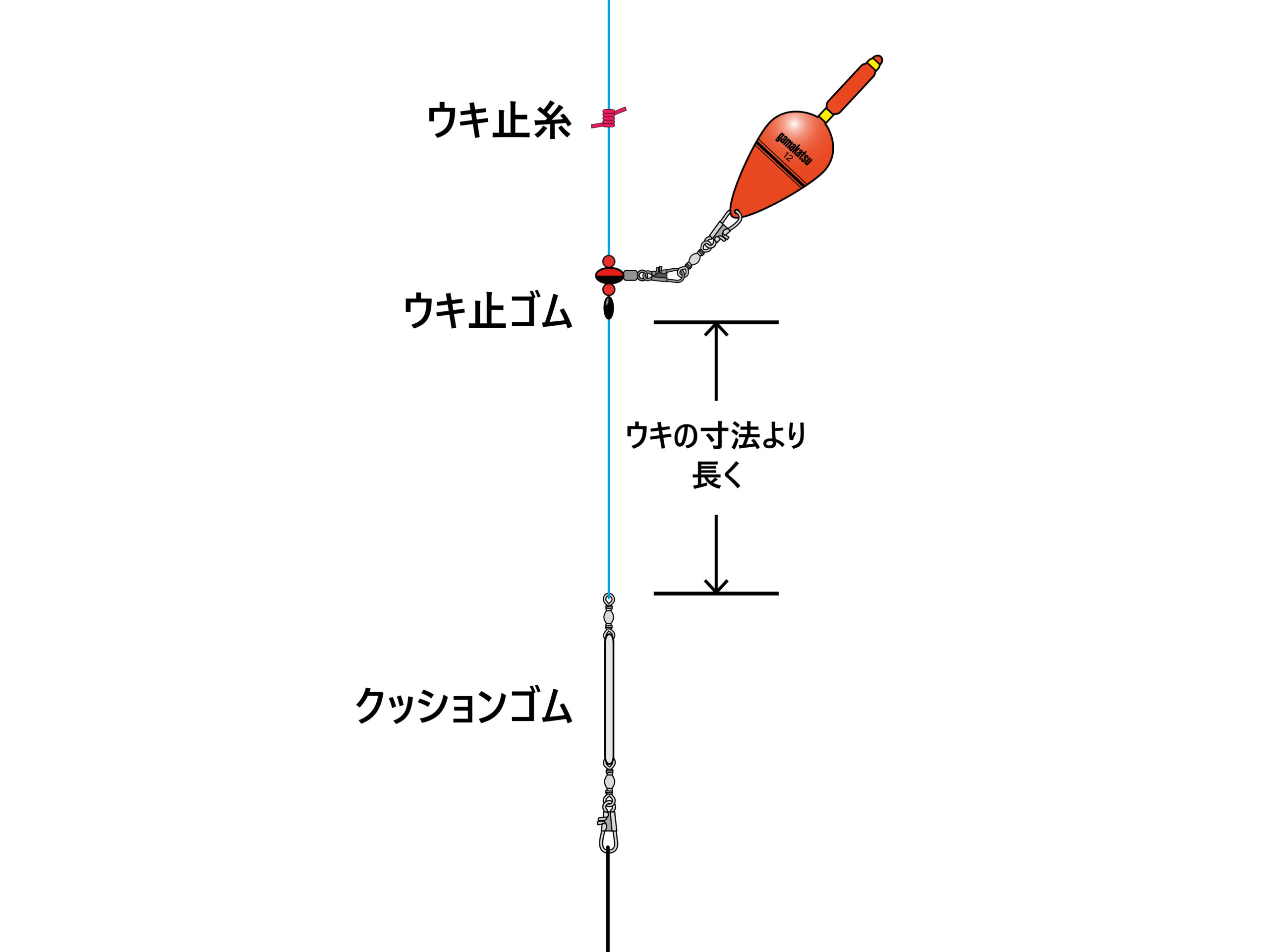 ウキ止め糸を移動させて、ウキ下調整します。道糸とウキ止め糸を濡らしていただくと、スムーズに移動できます。クッションゴムからウキ止めゴムの位置をウキの寸法より長くすることでトラブルを軽減できます。