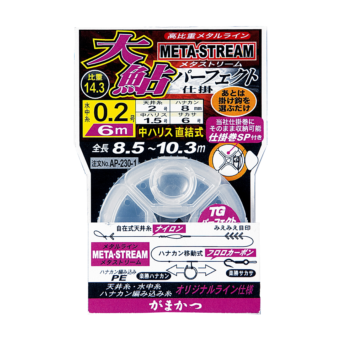 高強力・高比重のメタルライン「メタストリーム」を使用した大鮎パーフェクト仕掛です。比重14.3の圧倒的高比重が、快適な瀬釣りを約束。水中糸を6m取ることにより、大鮎の潜む荒瀬や深場を攻略可能。高い耐摩耗性により荒い底石が点在するポイントでも安心して使用可能です。独自の表面特殊コートにより、キンク・パーマが起こり難く、目印移動もスムーズに行えます。ハナカンはオトリ鮎の姿勢が安定する「楽勝ハナカン」、サカサは使いやすく太ハリス対応の「T1 楽勝サカサ(6号)」を使用。あとはフィールドに合った掛け鈎を選ぶだけです。