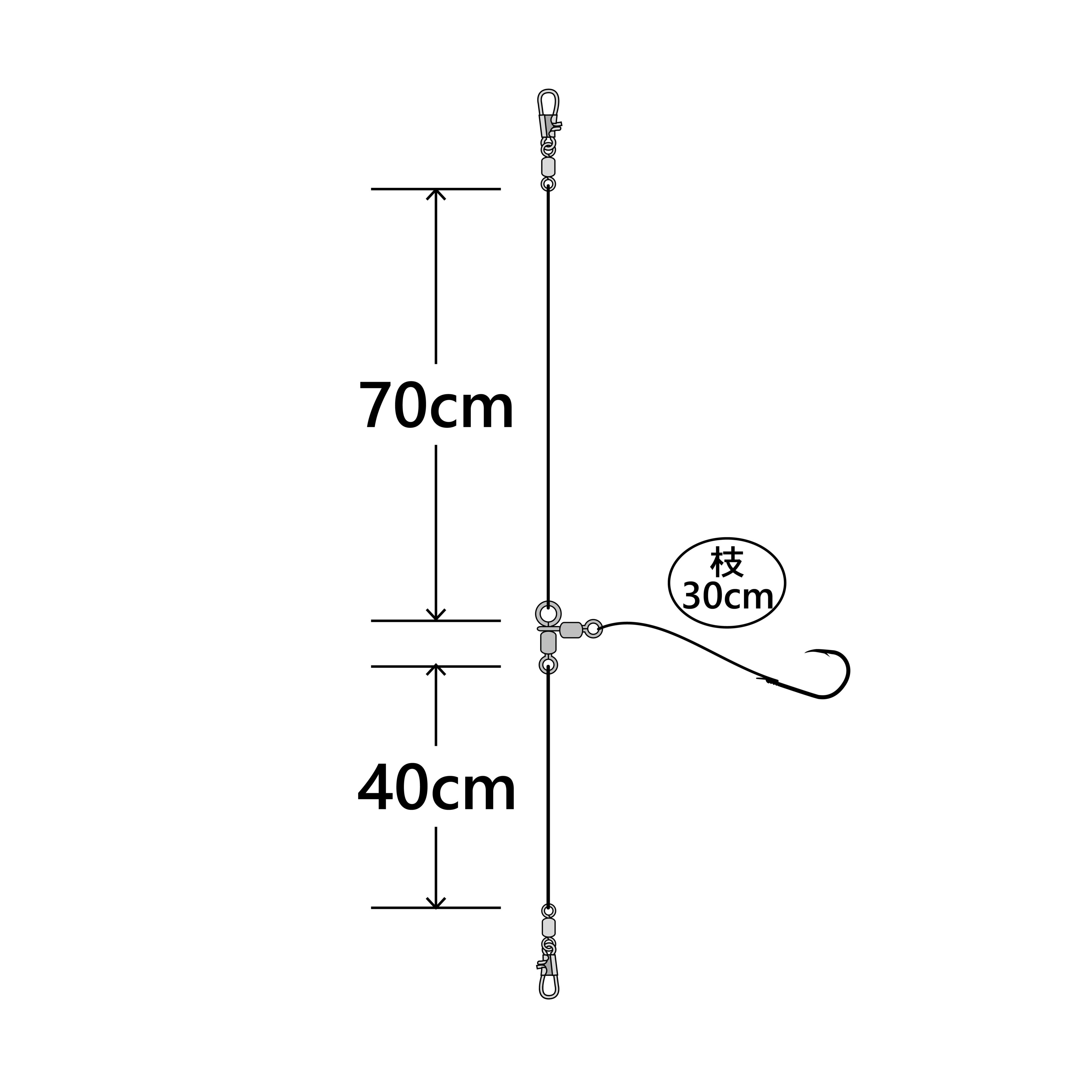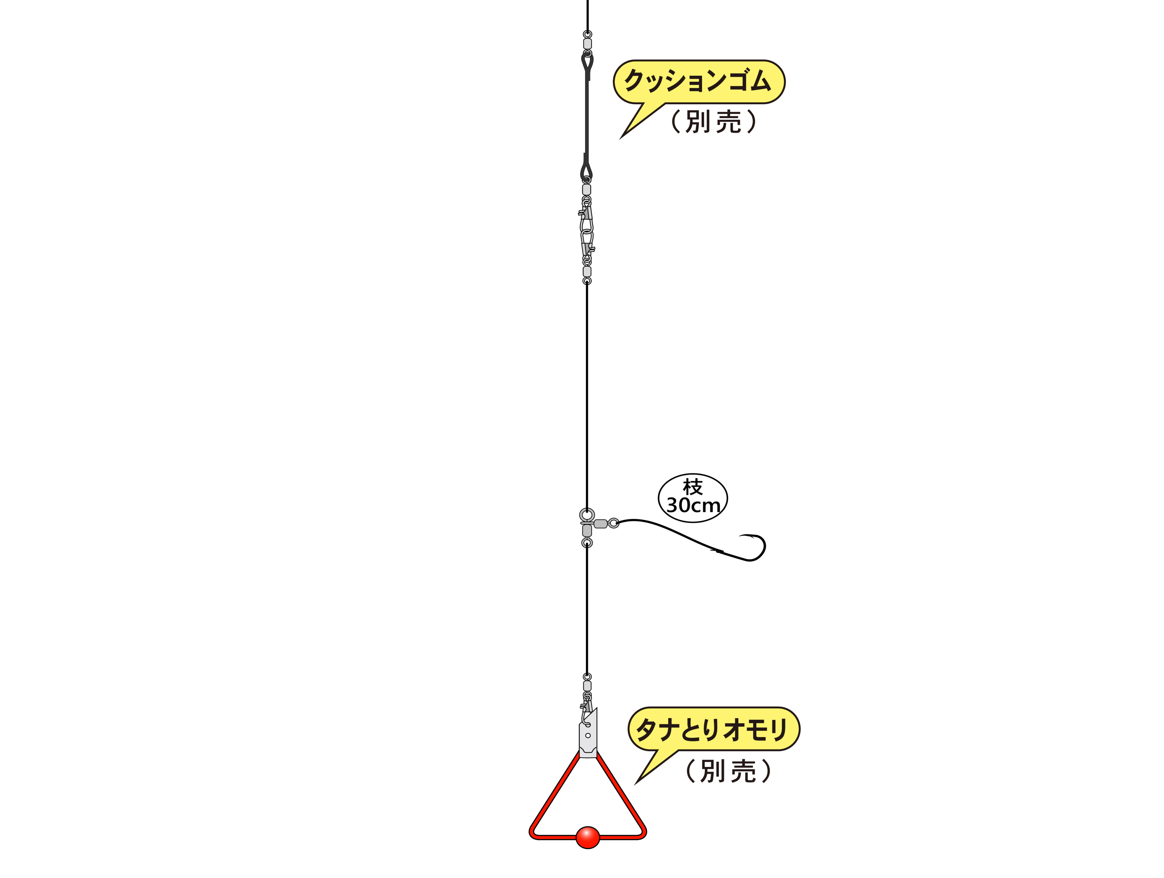 オモリに「がまかつ工房 海上釣堀 タナとりオモリ2」を使用することで、根掛かりしにくく、底付近を集中的に狙いやすい仕掛です。「42577 海上釣堀 青物泳がせ仕掛 タナとりオモリ仕様」の替え仕掛としても適します。