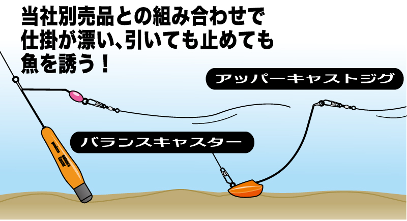 “アッパーキャストジグ”、“バランスキャスター”にベストマッチ!!仕掛が漂い、引いても止めても魚を誘う。エギングロッド・コンパクトロッド対応の短寸仕掛。