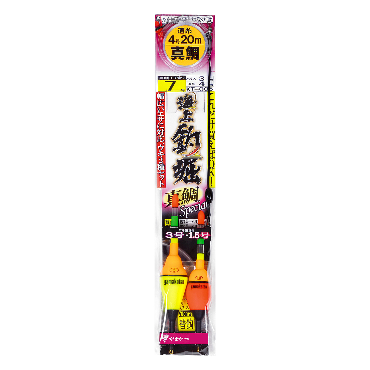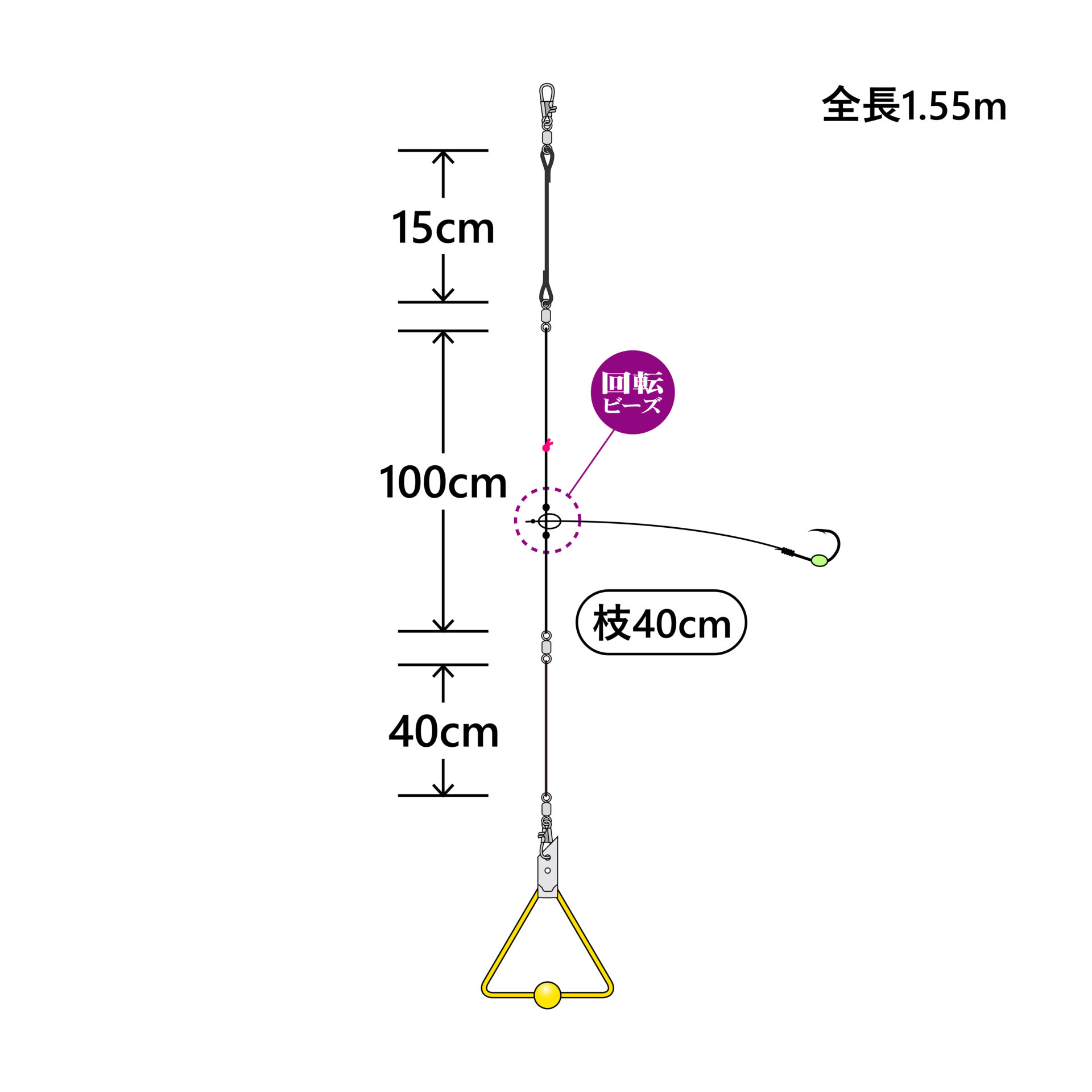 タナとりオモリ2イエロー(重さ7号相当)仕様を採用。活き餌をより自然に泳がせられる遊動式仕掛です。枝鈎誘導式!ピンクゴムを移動させることで誘導幅を自由に設定できます。
