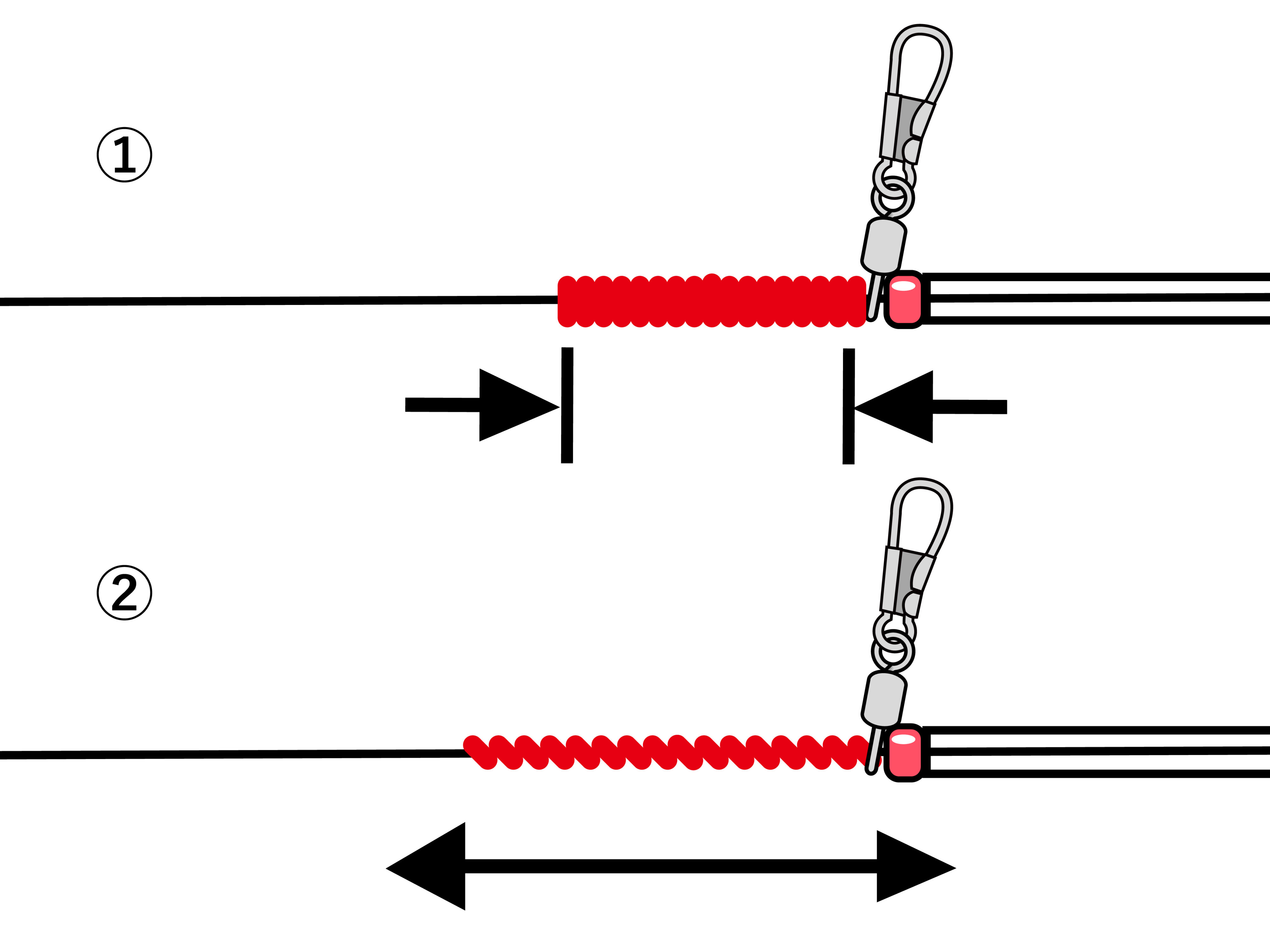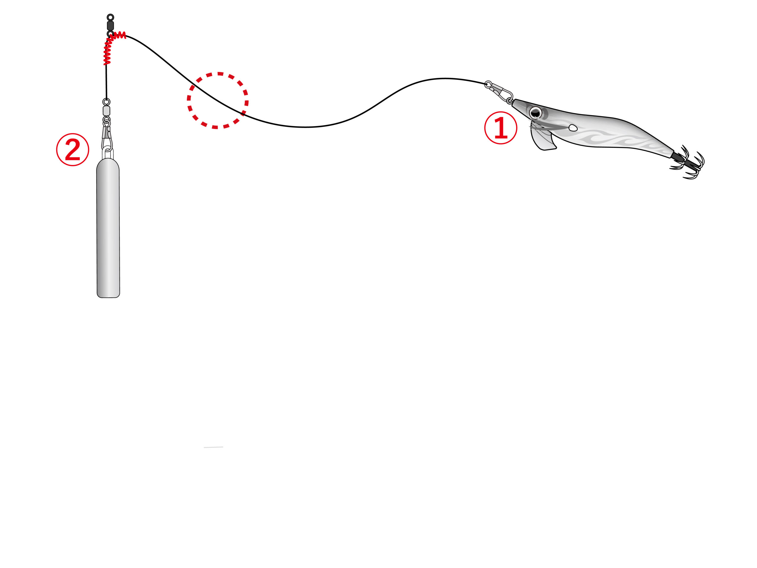 (1)のスナップにドロッパーとしてお手持ちのエギを、(2)のスイベル付スナップにオモリをセットします。