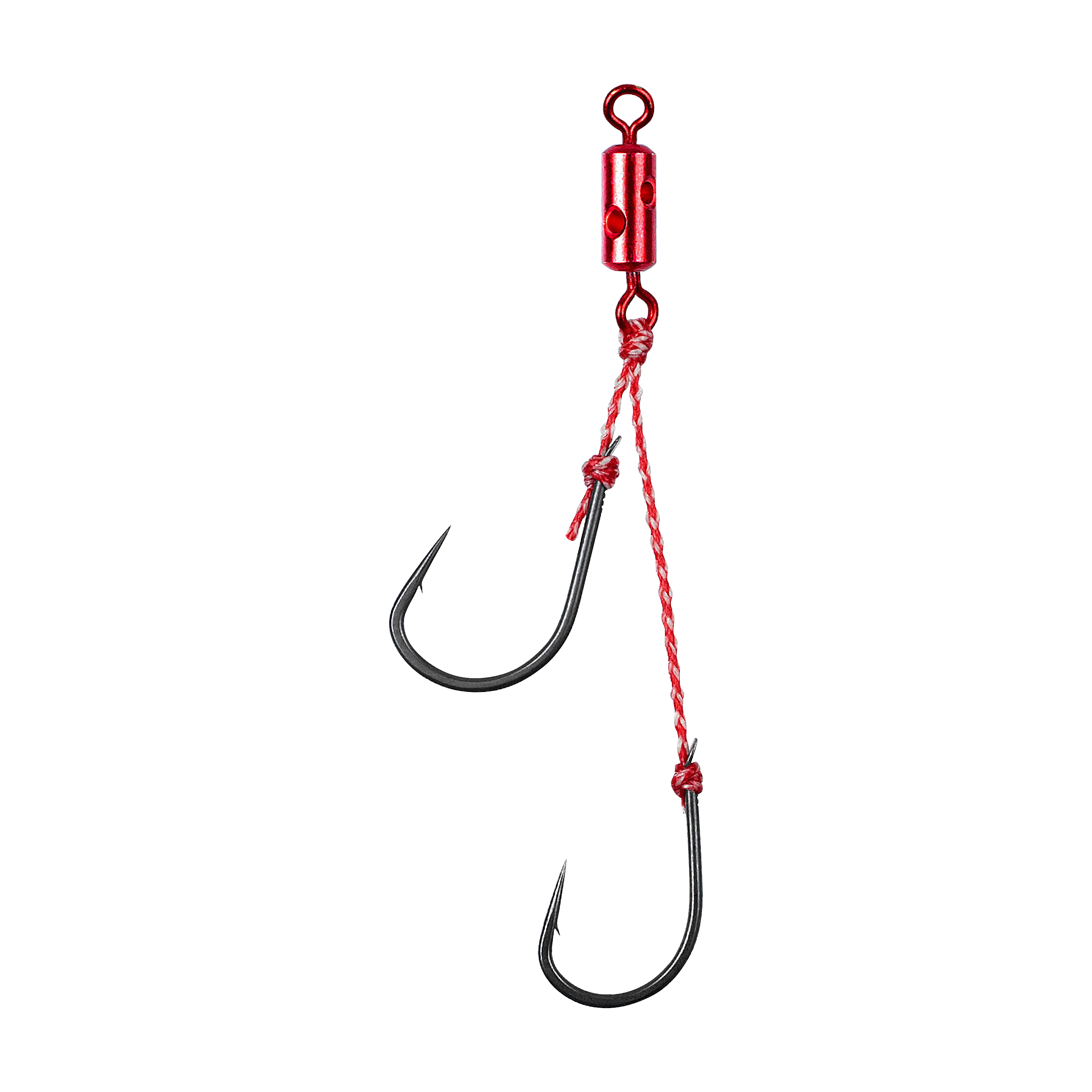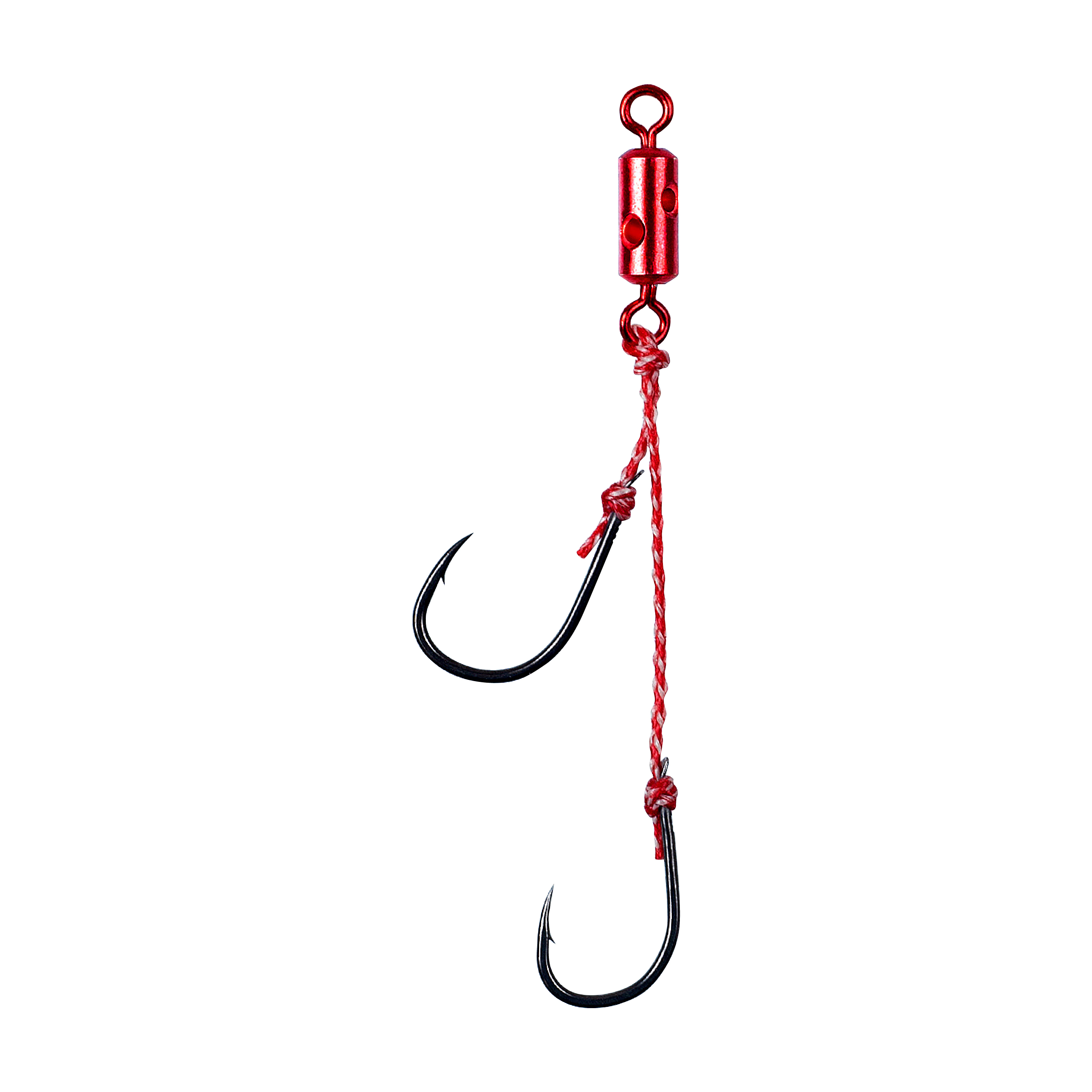 アゴやカンヌキを貫き刺すことをコンセプトに、トップフックをシンカーに近づけた設定。ボトムフックはファイト中のセカンドフッキングを狙い、サイズダウンしています。