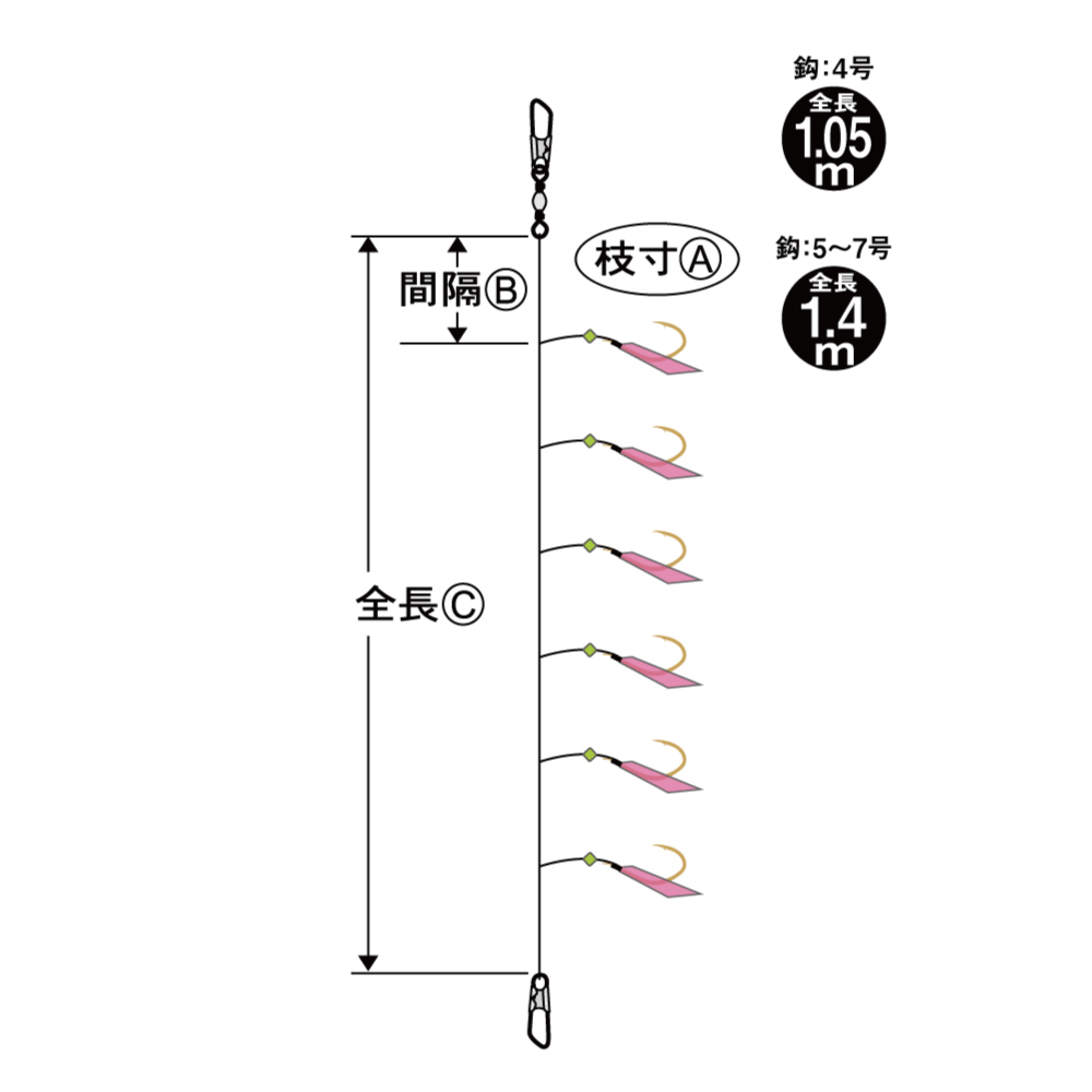 | 品名コード | 号数 | ハリス | 幹糸 | 枝寸 | 間隔 | 全長 | 入数 | 希望本体価格(円) | JANコード |