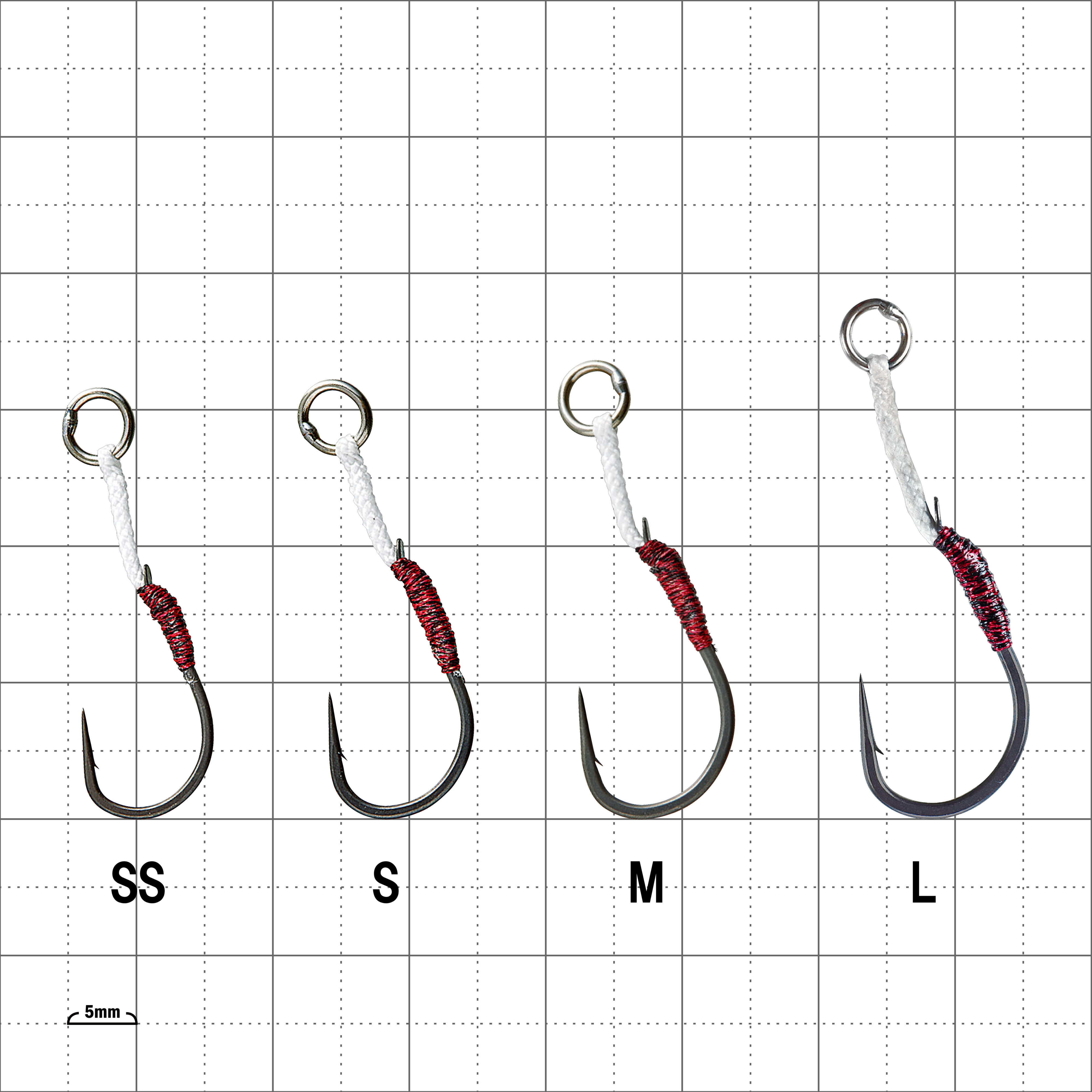 L.S.J.(ライトショアジギング)専用アシスト。鋭利なスパットテーパーとナノスムースコートにより、ジャレつく魚も速攻フックアップ。魚へのアピール効果を備えた白色アシストライン搭載。