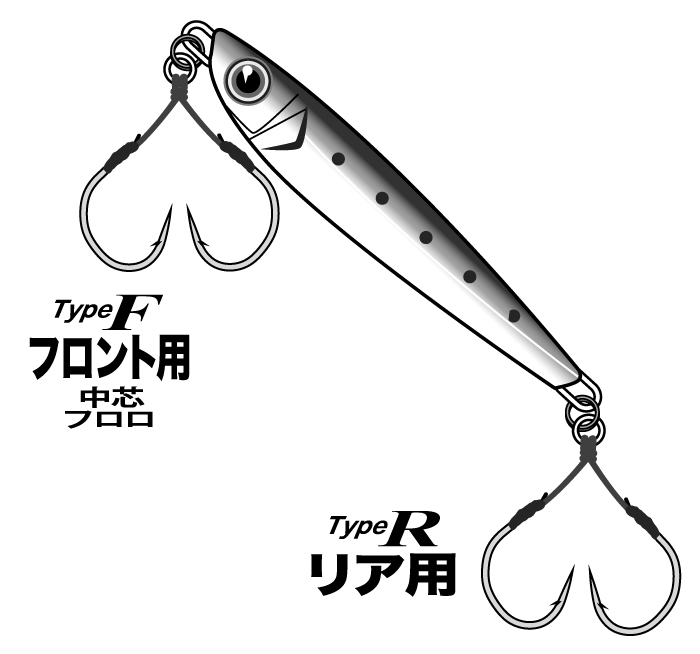 中村豪監修スーパーライトジギング専用設計!当社フックプロスタッフ中村豪が使用するアシストフックを量産化。中村豪のノウハウから導き出された部材、寸法を採用し、ベストなフッキングをサポート。フロント用、リア用を組み合わせる事でベストなパフォーマンスが可能です。