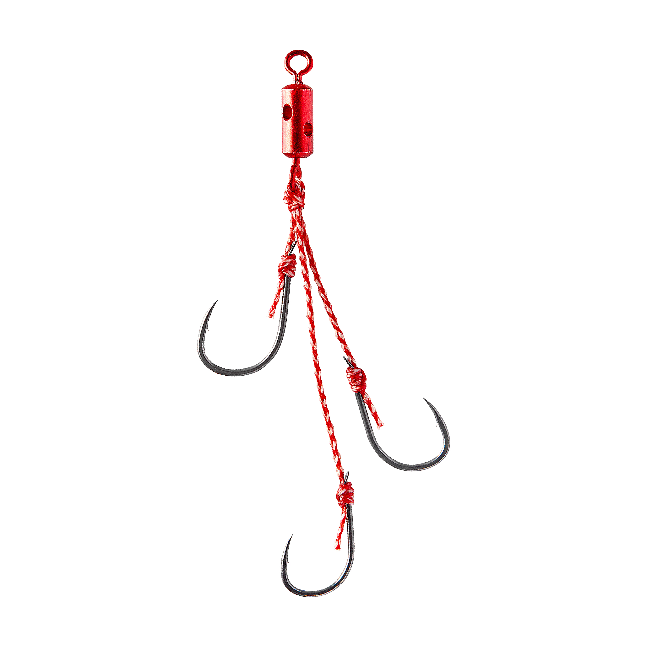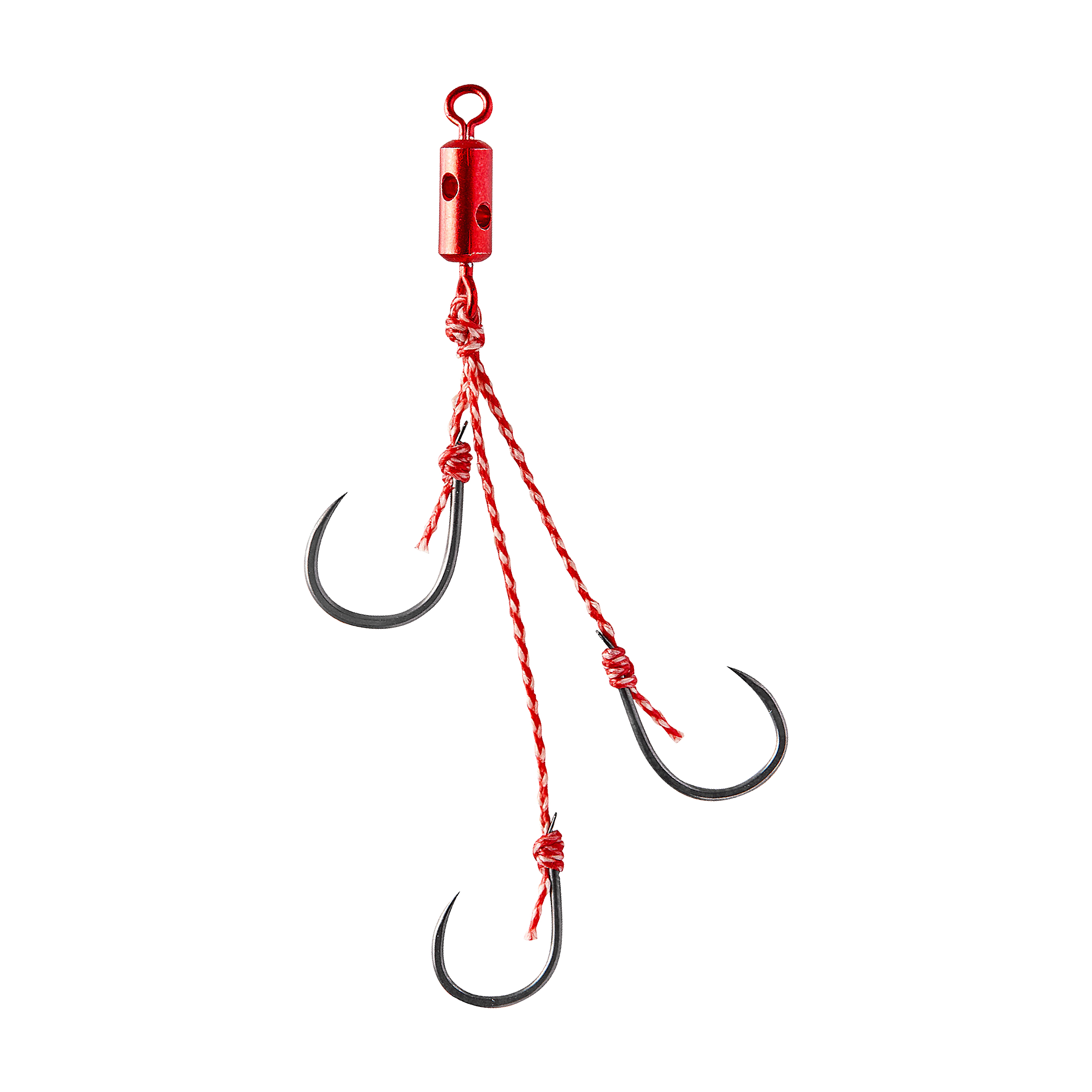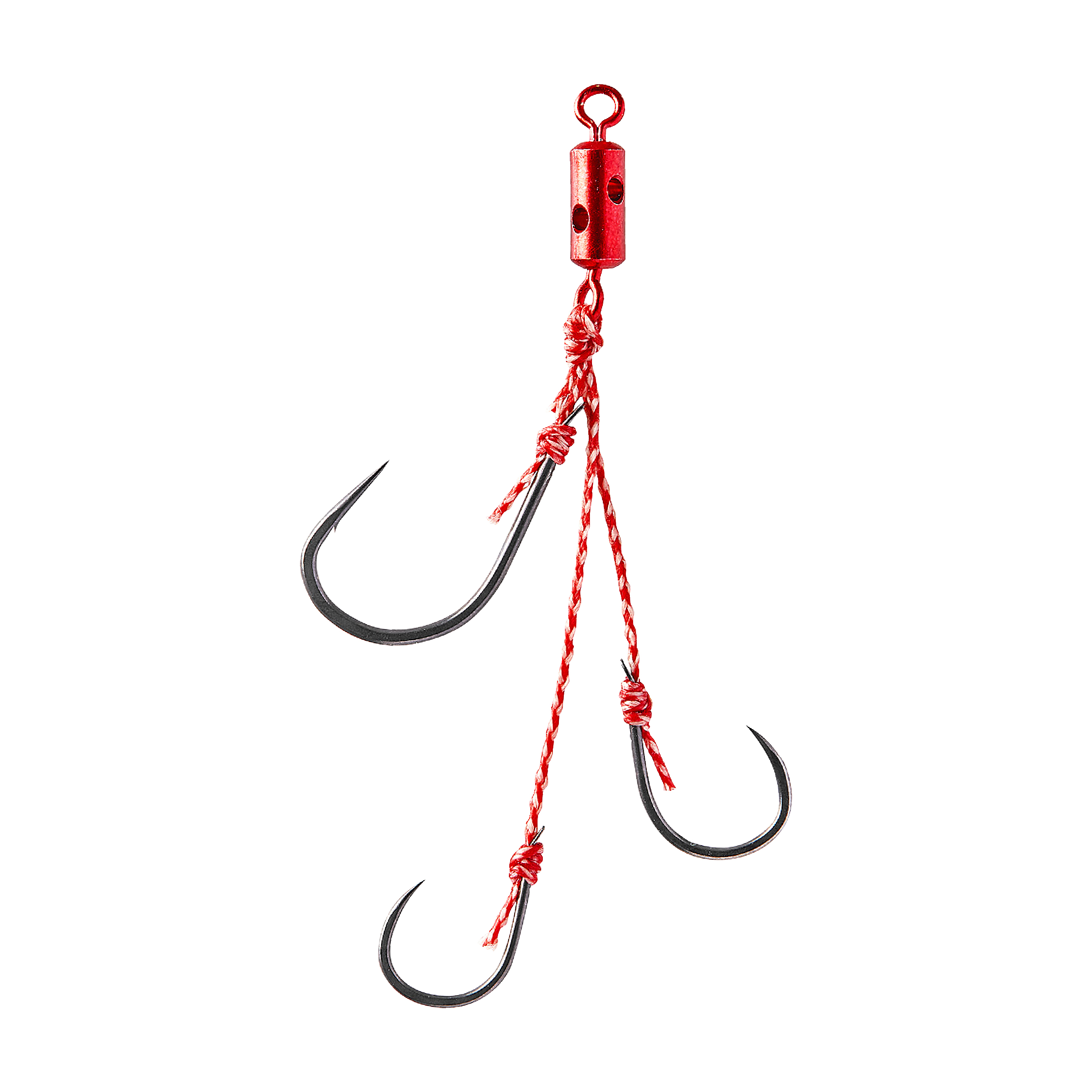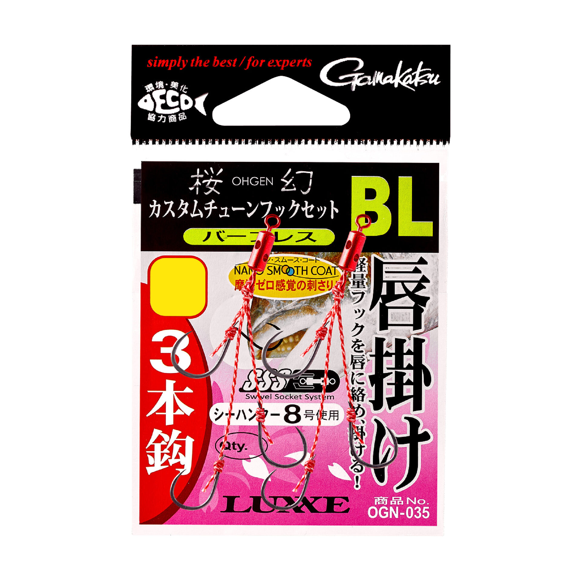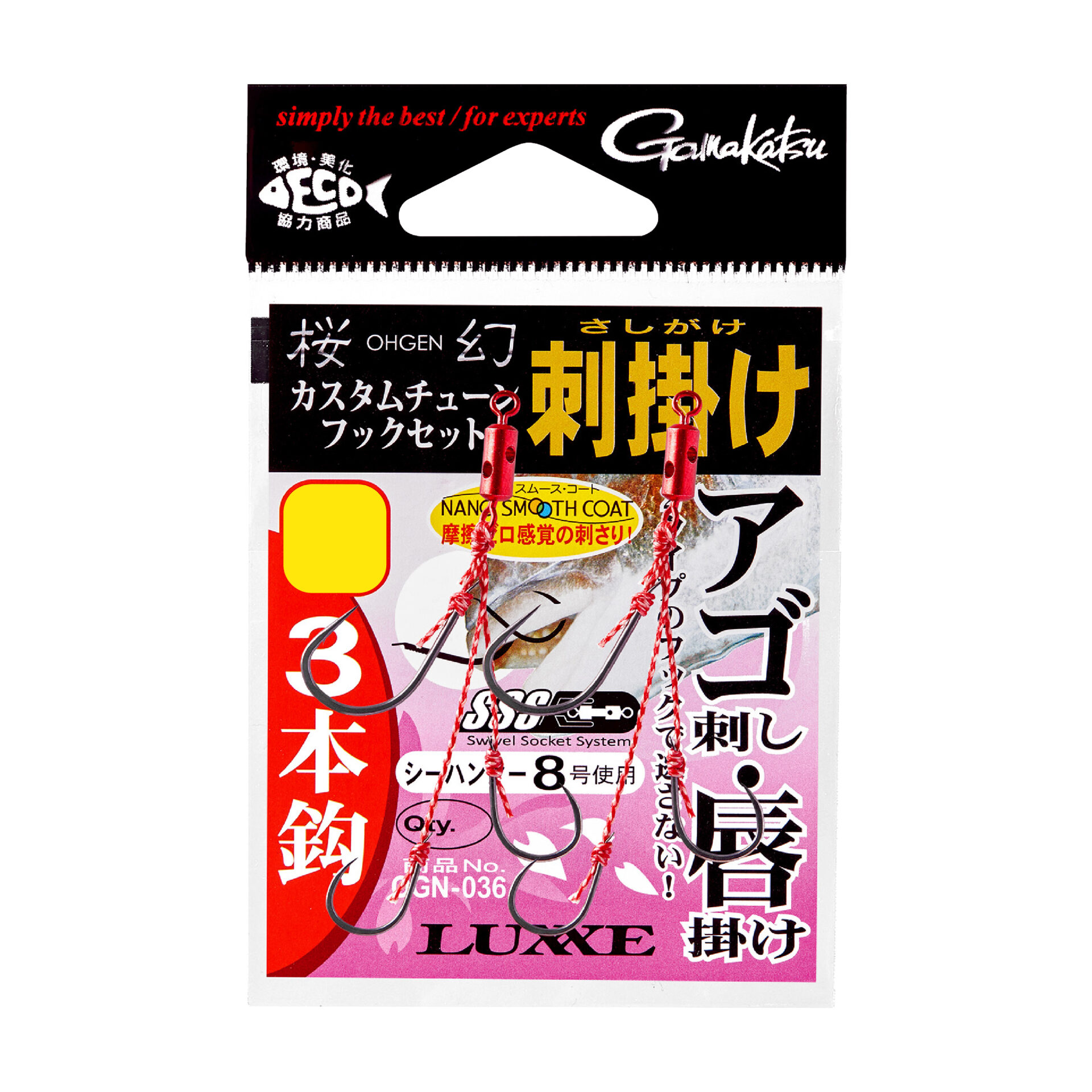 桜幻カスタムチューンフックセットをさらに3フックス化。トップ、ミドル、ボトムとダウンサイズしてフッキング効率を高めています。特に、刺掛けシリーズはフッキングマスター+バーブレスでアゴ刺し、唇掛けを両立したこだわり仕様です。