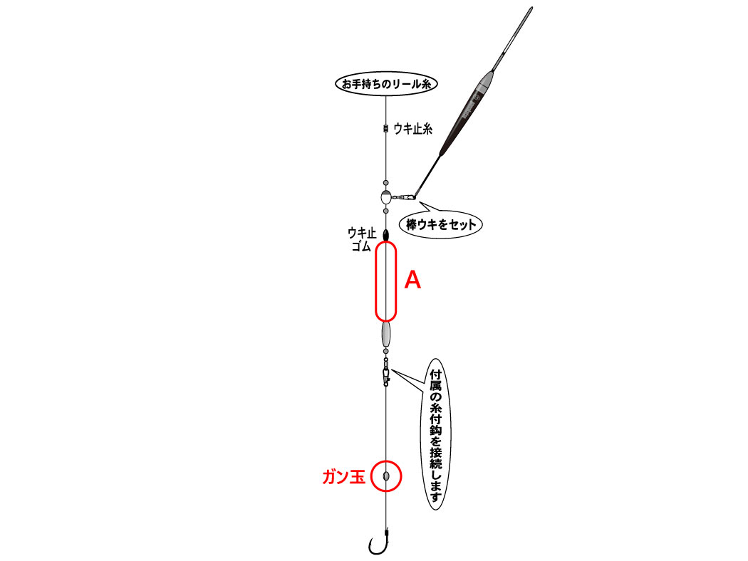 Aの長さはカラミ防止のため、ウキの寸法より長くしてください。