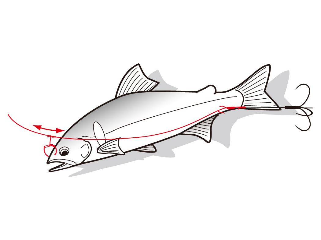 ハナカンはオトリ鮎の姿勢が安定する「楽勝ハナカン」、サカサは使いやすさを追求した「T1 楽勝サカサ(フック式)」を使用。中ハリスは視認性抜群の「鮎 中ハリスフロロ(蛍光みえみえイエロー)」を採用しています。