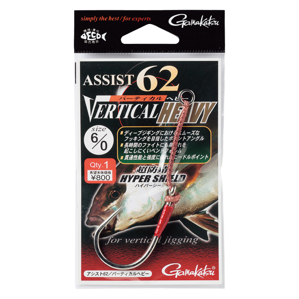 40ポンドクラス以上のタックルを用いて10kgを越えるカンパチやマグロ類、大型のハタ類をターゲットとして想定した大物専用のジギングフック「シングルフック 62 バーティカルヘビー」を用いたアシストフックです
