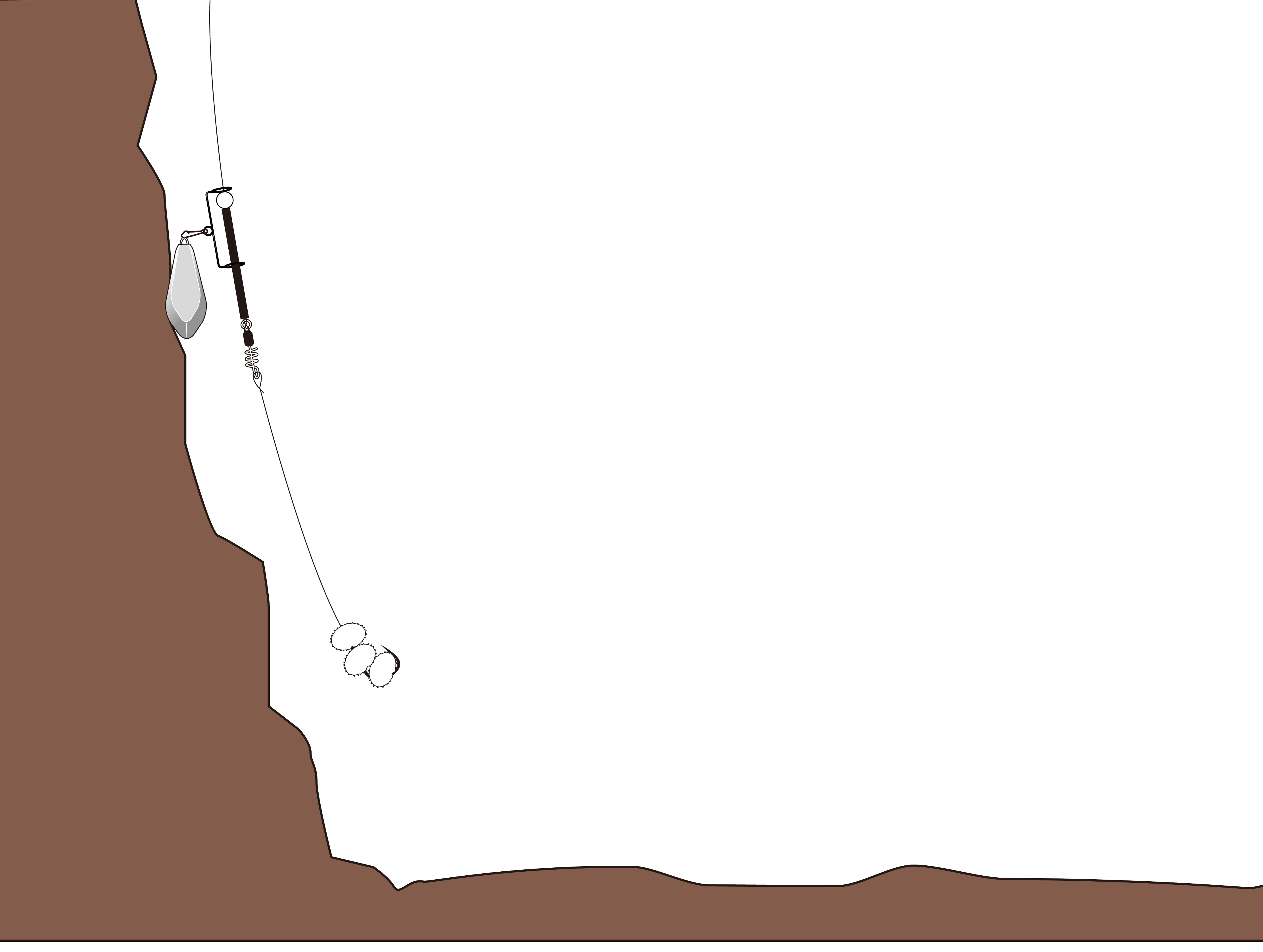 底・壁が凸凹の場合や海藻の多い釣り場では捨て糸を1~2mと長めに設定することでエサが魚に見やすくなり、根掛かりしてもオモリの紛失のみですみます。