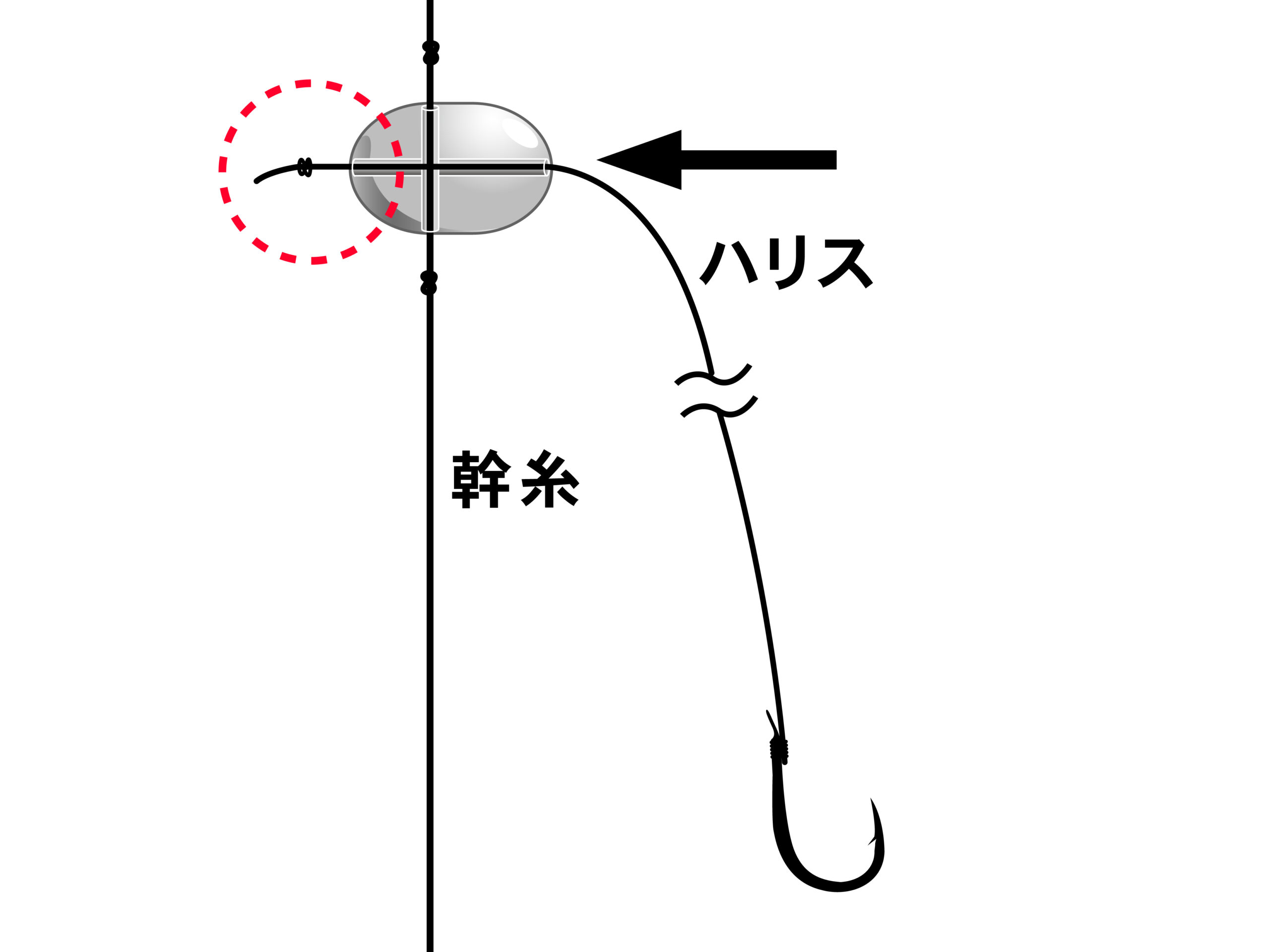 矢印の方向からビーズの穴にハリスをさし込み、先端に結びコブを作ってハリスが抜けないようにセットします。