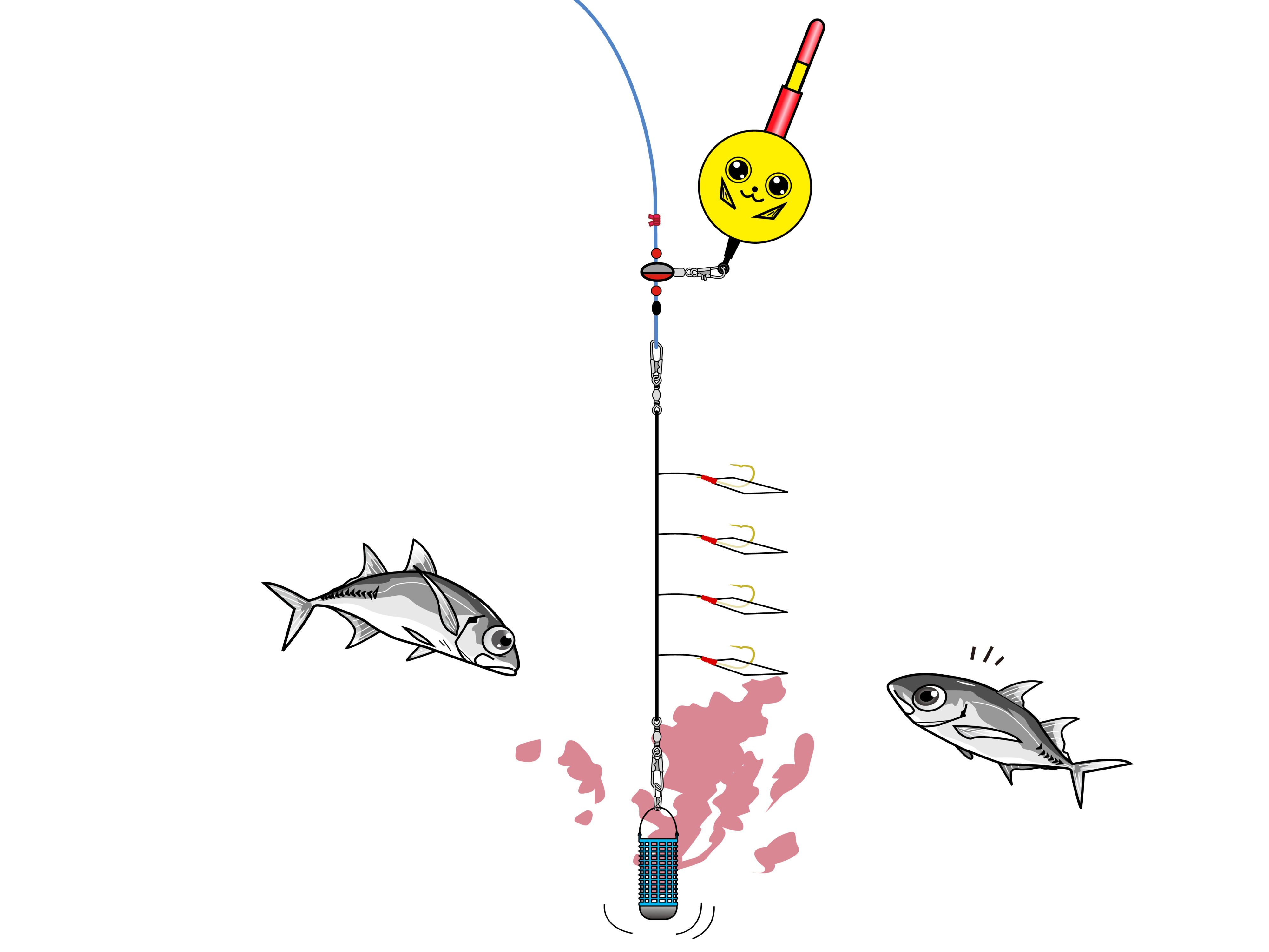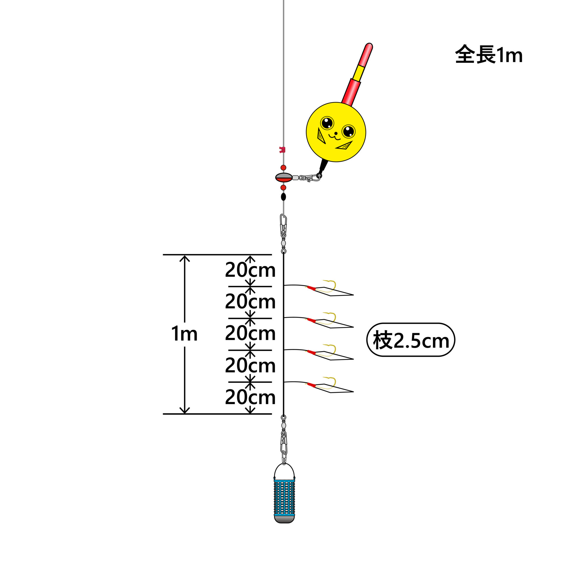 うきまろ遠投ウキ(12号)と仕掛カゴ(10号)が入ったパーフェクト仕掛。鈎には掛かりがよく外し易い極(キワメ)金袖を使用。ハリスには大物対応の太ハリスを使い、投げやすい4本鈎仕様です。ウキ止めは移動できます。上にあげるとウキ下を深くできます。