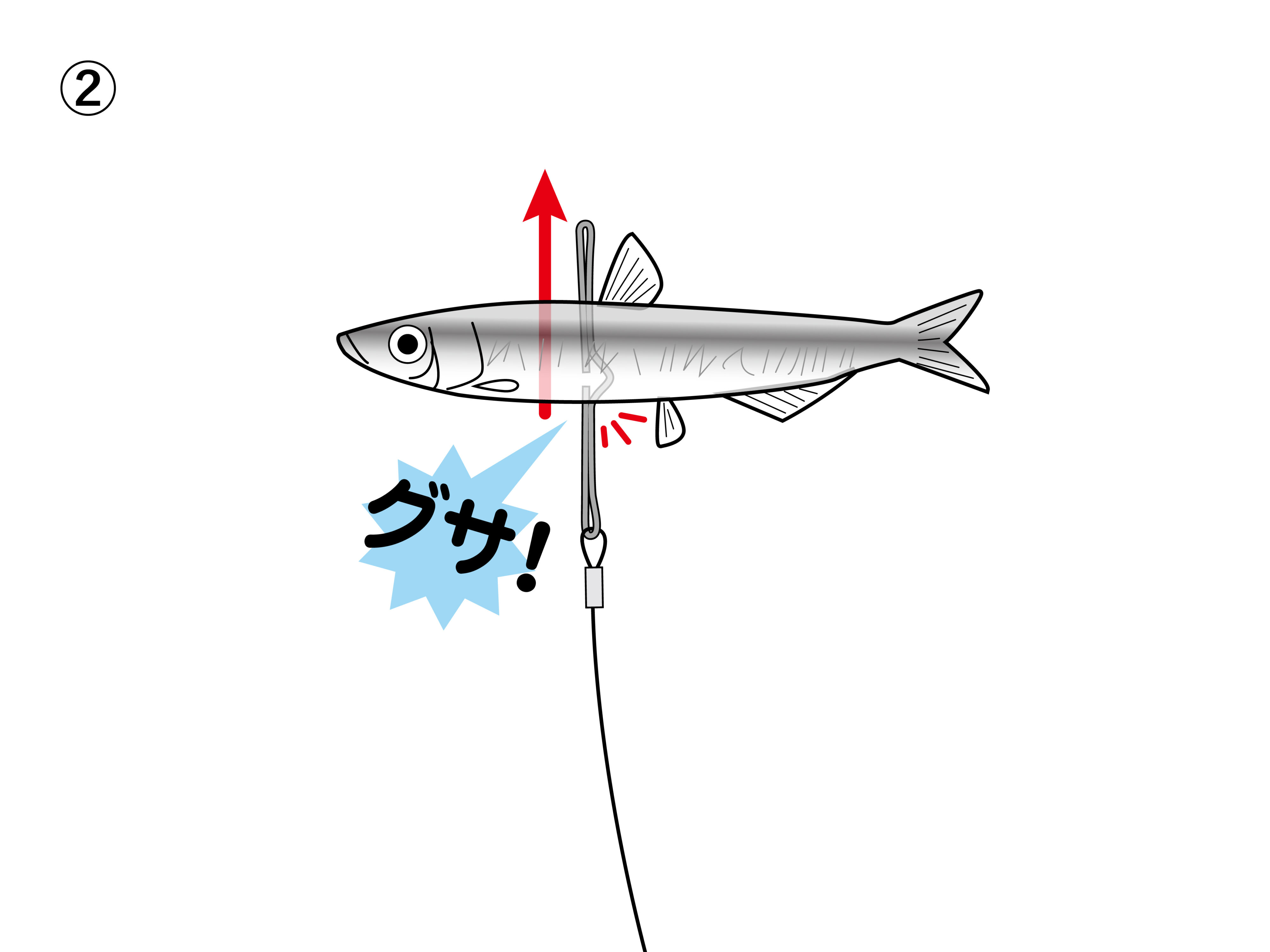 2.ハリス止でキビナゴをお腹側よりつらぬきます。