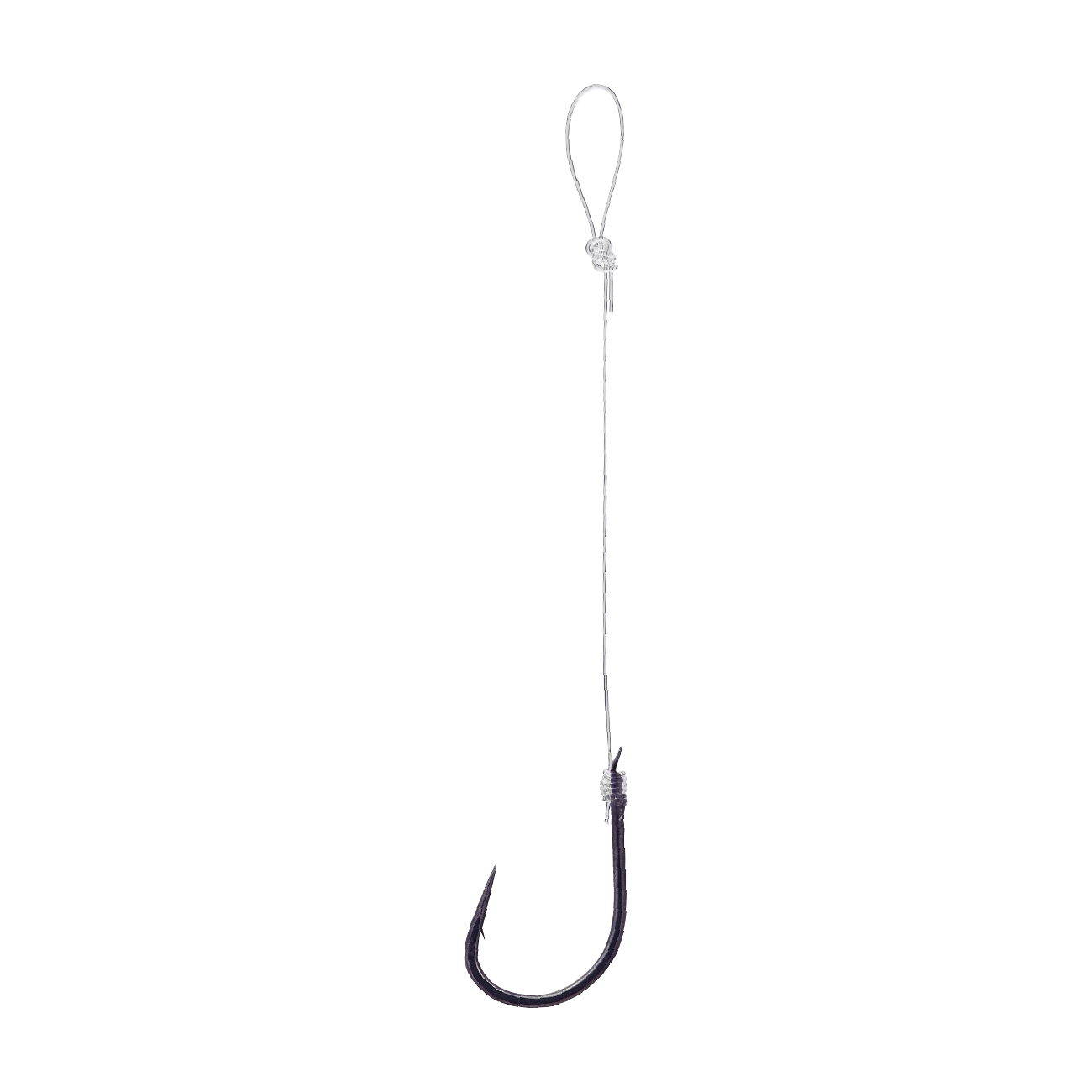 ハリスの輪をテンヤのアイに通したあと、鈎をハリスの輪にくぐらせ、しっかり引き締めます。