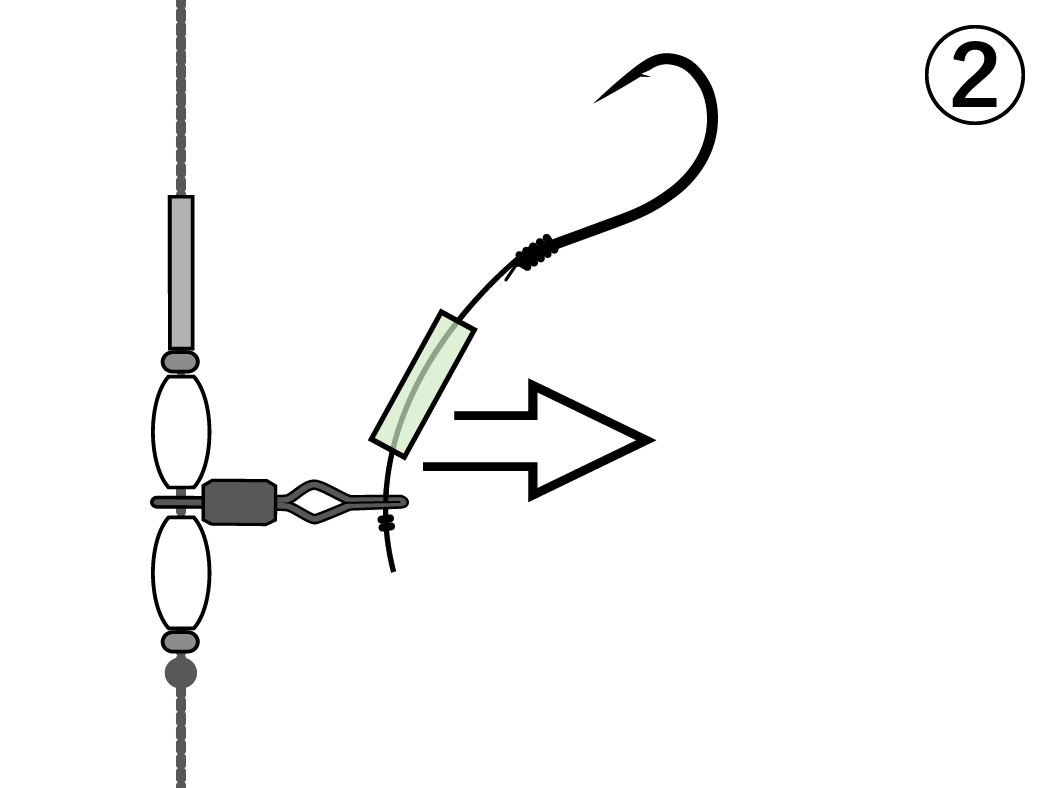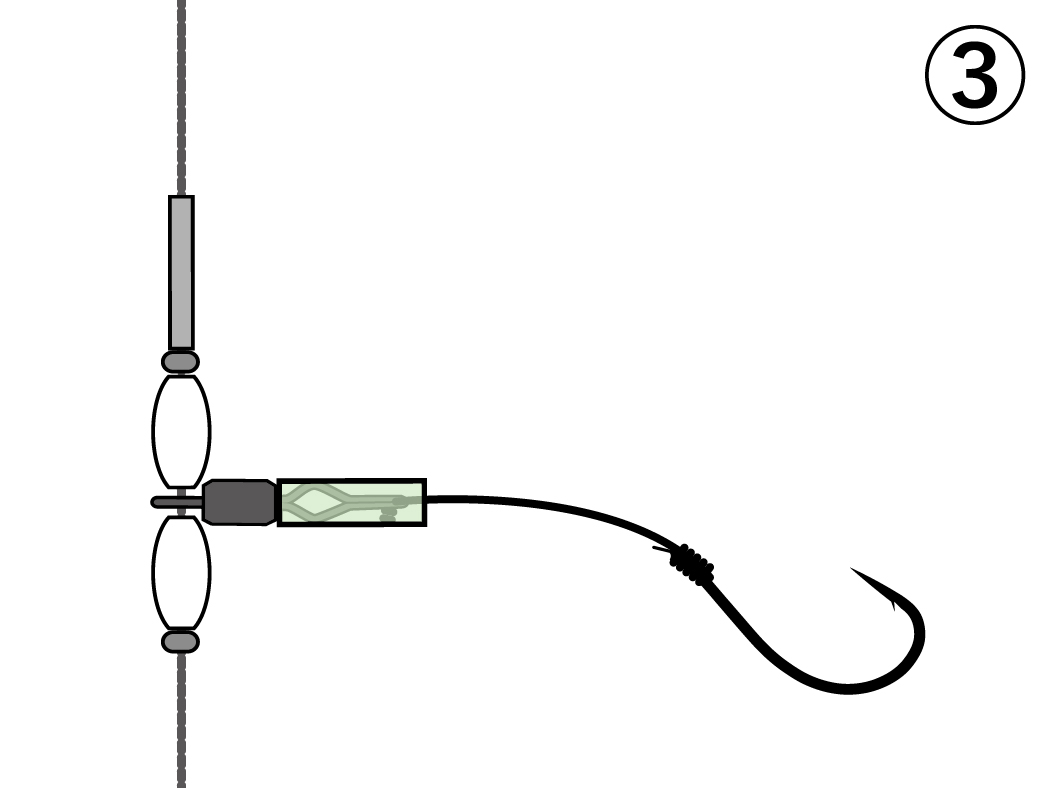 替え鈎のハリスに(1)ではずした枝鈎の夜光パイプを通し、先端に結びコブを作ります。ハリス止の穴に挿入し、溝の方へ引っ張って固定。