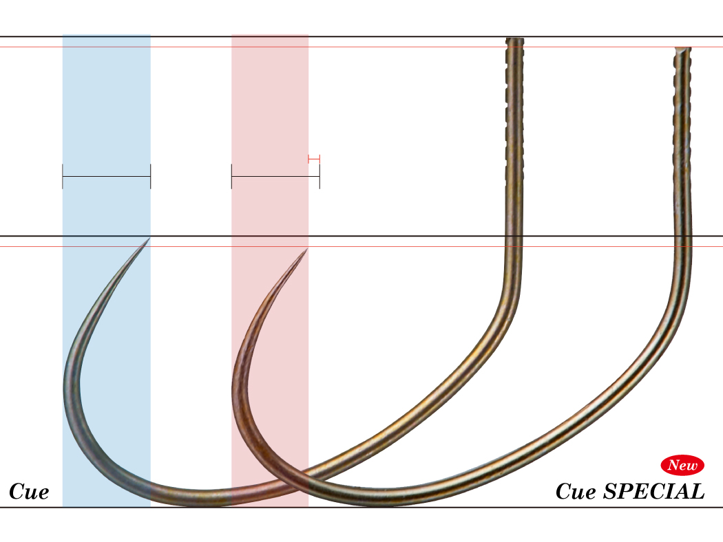 形状は鈎先と軸を0.1㎜単位で微調整した10を超えるパターンから厳選。その最適解はオリジナルCueから鈎先・軸長ともにわずかに短くする形と導き出した。鈎先が短くなればフトコロは広くなり、鈎先が魚体に触れやすい。また、広いフトコロにより鮎の身を大きくとらえることで、掛かった後の身切れによるバラシも軽減させる効果がある。