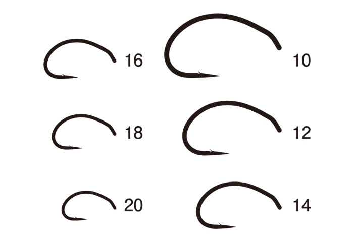 アイ寄りのシャンクのまっすぐな部分にウイングやハックルを巻き、この部分は浮かせる。その先はグンと下に曲げて沈ませる。そんなコンセプトでデザインしました。魚に優しくバレにくい「マイクロバーブ」仕様。カディスピューバやシュリンプパターンにも有効。