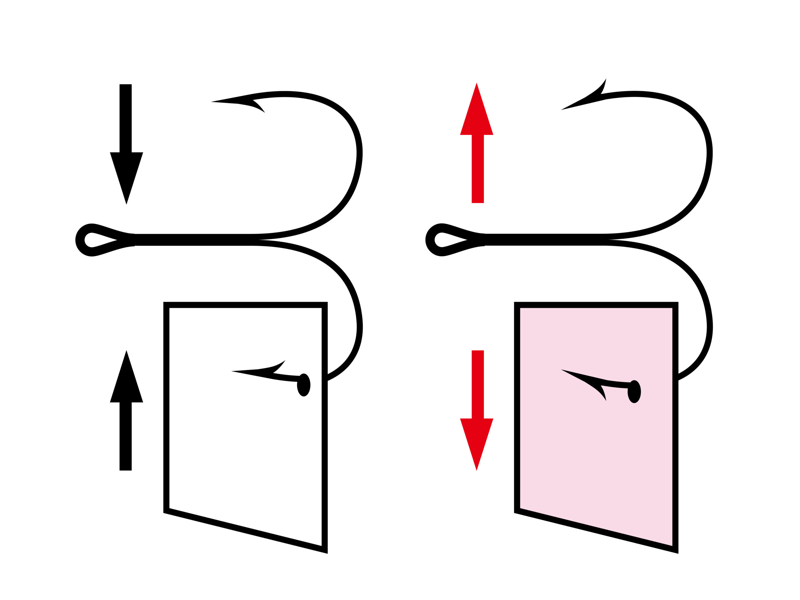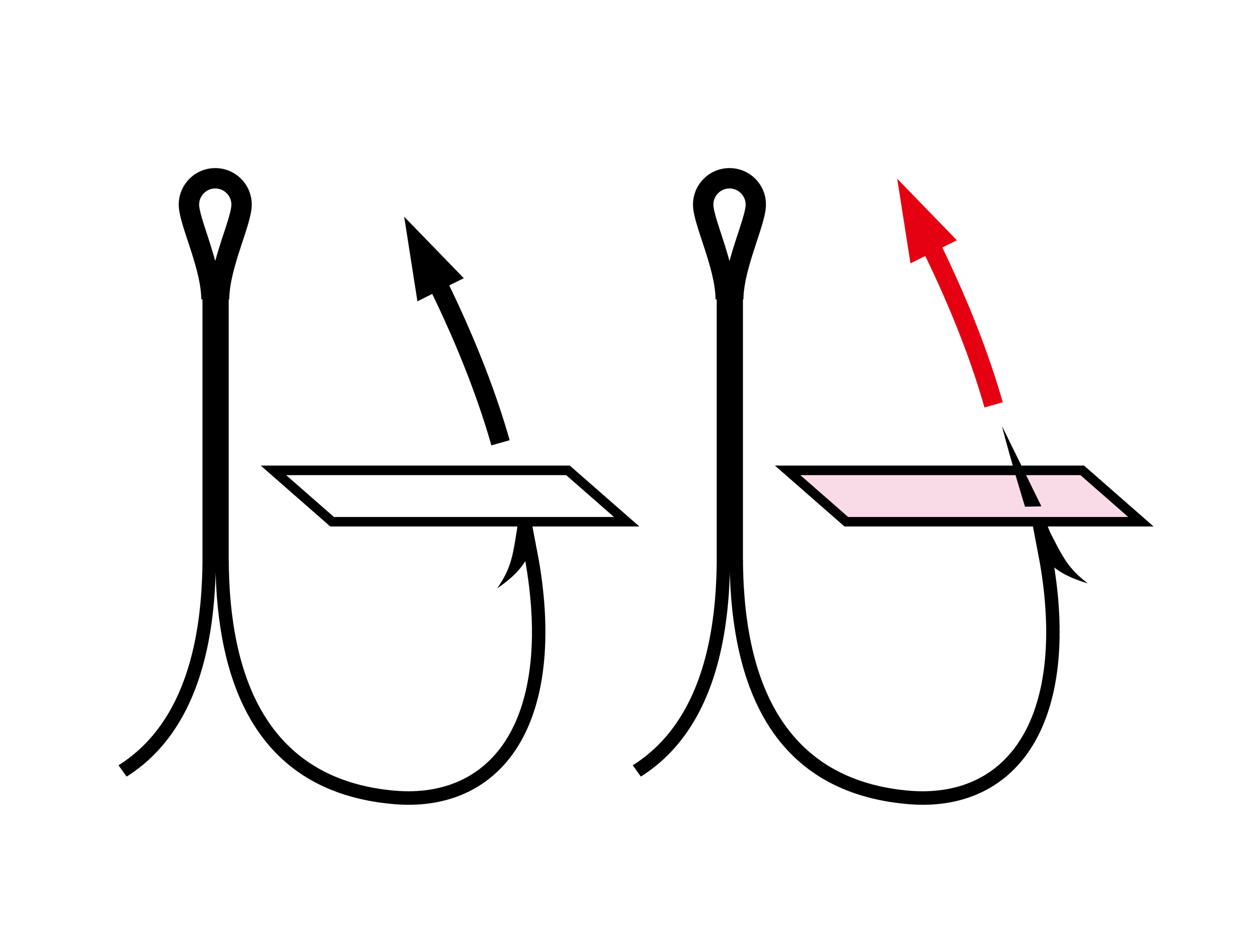 フッキング時にはアイ方向(内側)に力がかかるが、アウトバーブなら抵抗にならない。