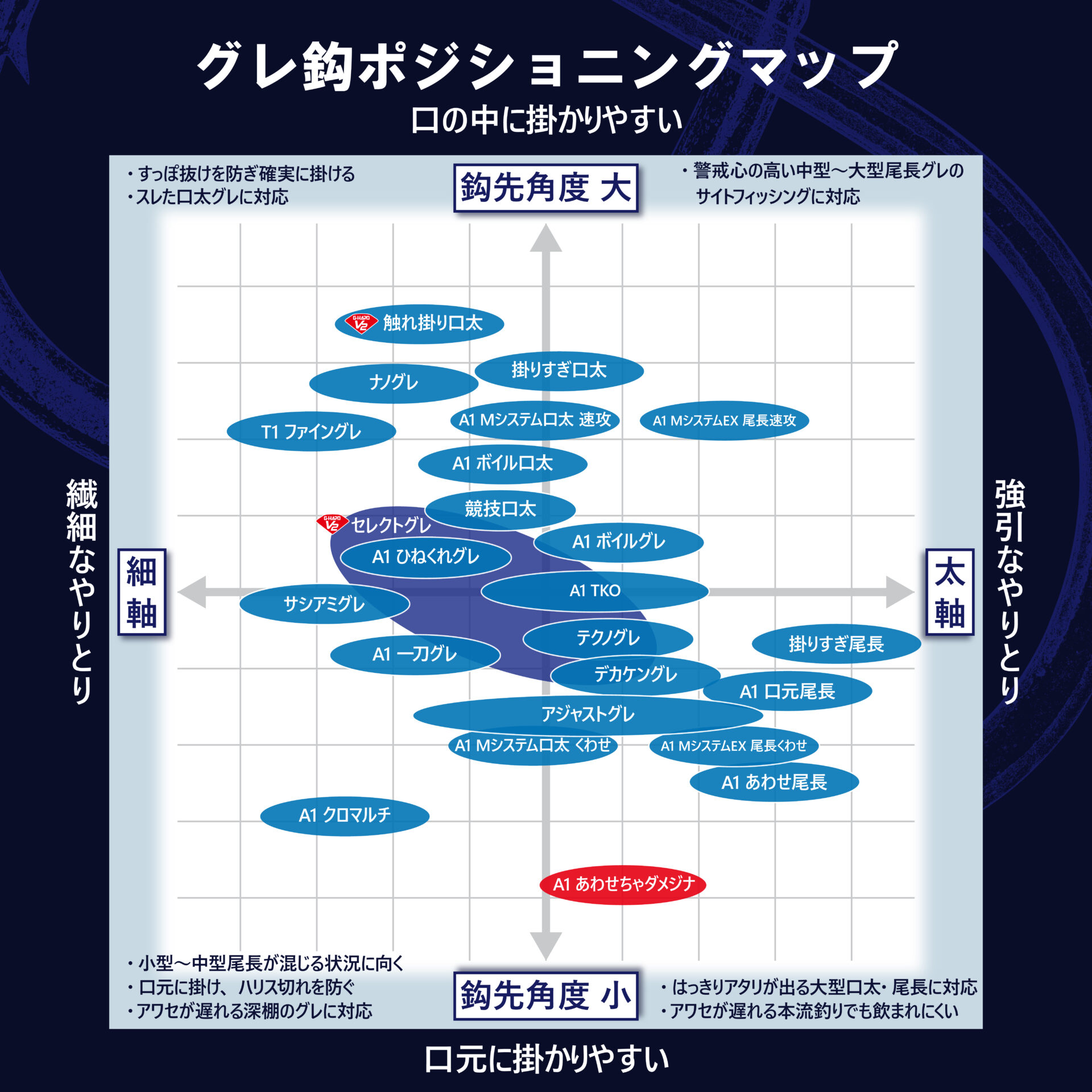 向こう合わせで口元への掛かり率90%以上!本流、磯際の尾長狙いに最適なグレ鈎です。鈎先がフトコロ側にかなり入った「ネムリ」形状の「スレ鈎」で、アタリがあれば合わさず、竿に魚の重さがのるまで待ち竿を立てるだけ。新形状の鈎先が魚の引きに合わせて自然に口元を捉えます。本流釣りなどでは尾長に鈎を飲み込まれてハリスを切られることが多かったものですが、これなら安心です。素材は強靱な釣り鈎専用鋼の「A1」。チモトには「ブイヘッド」を採用。