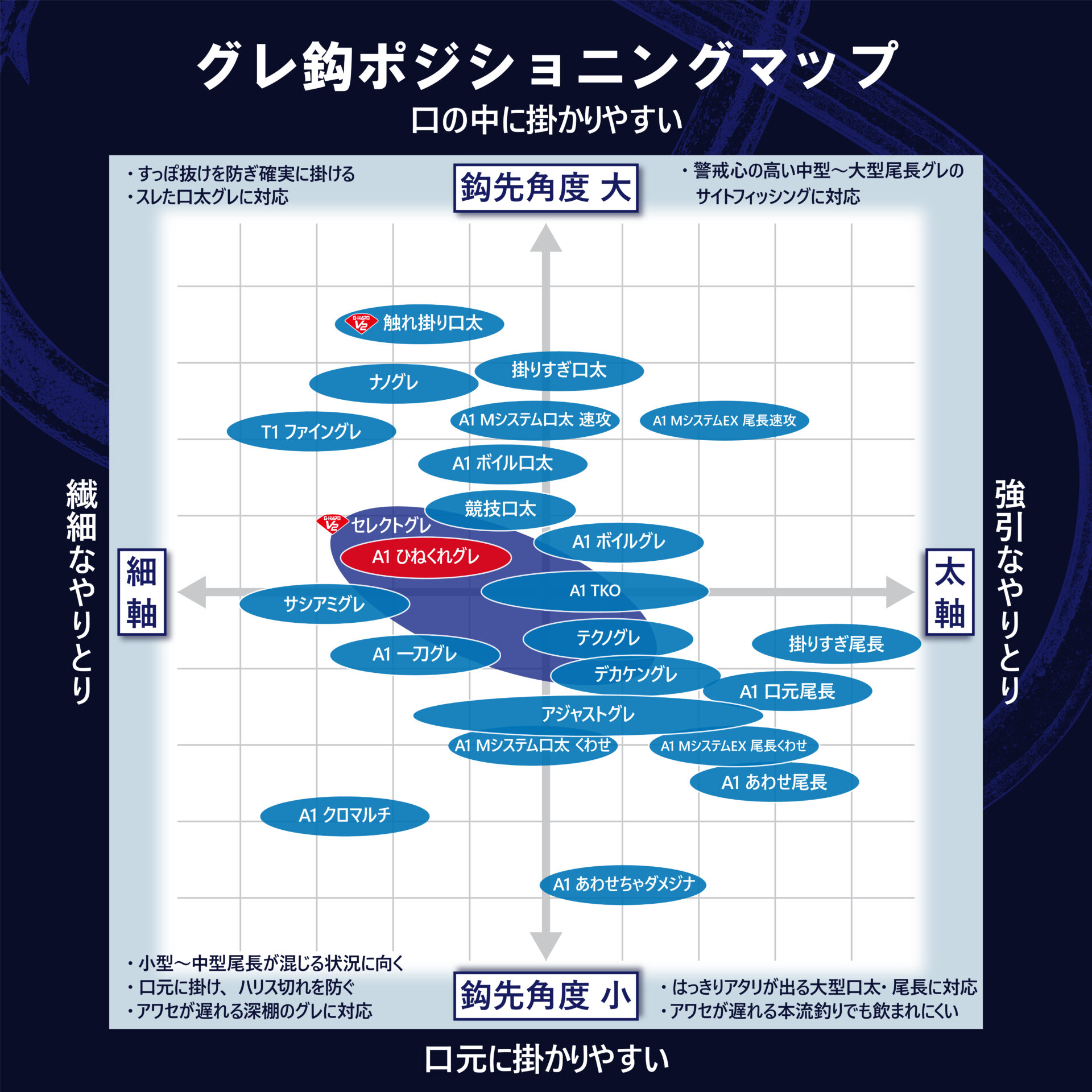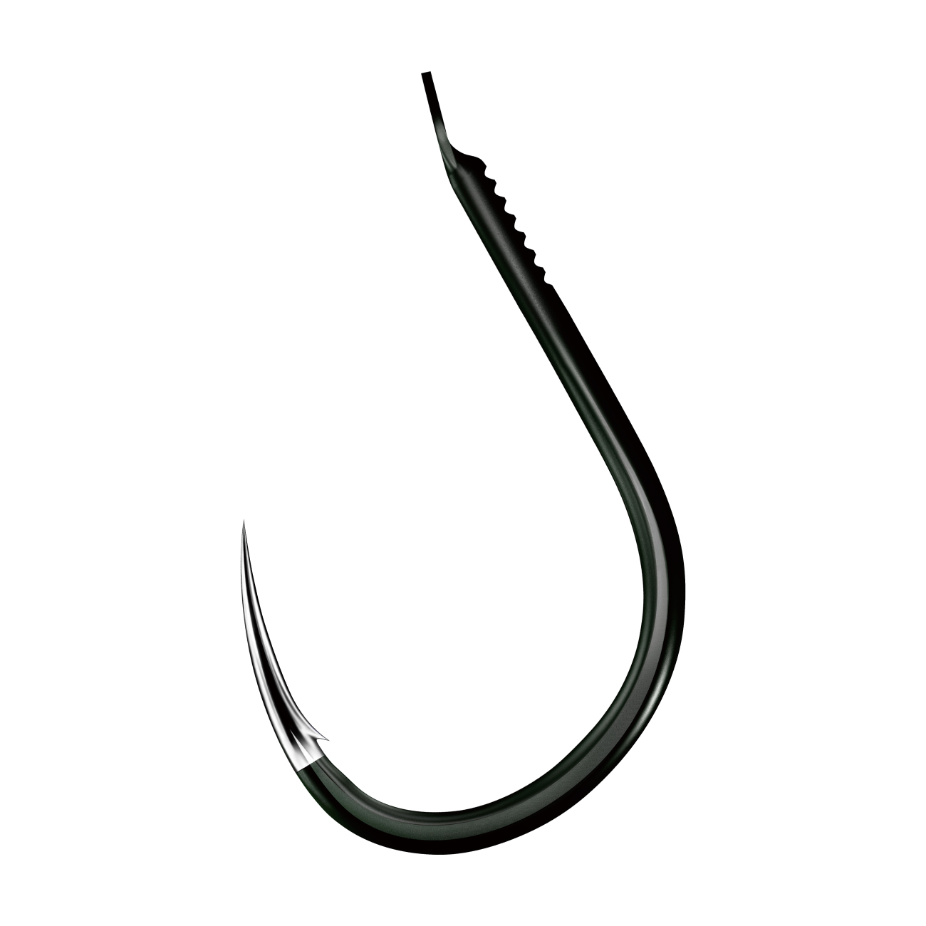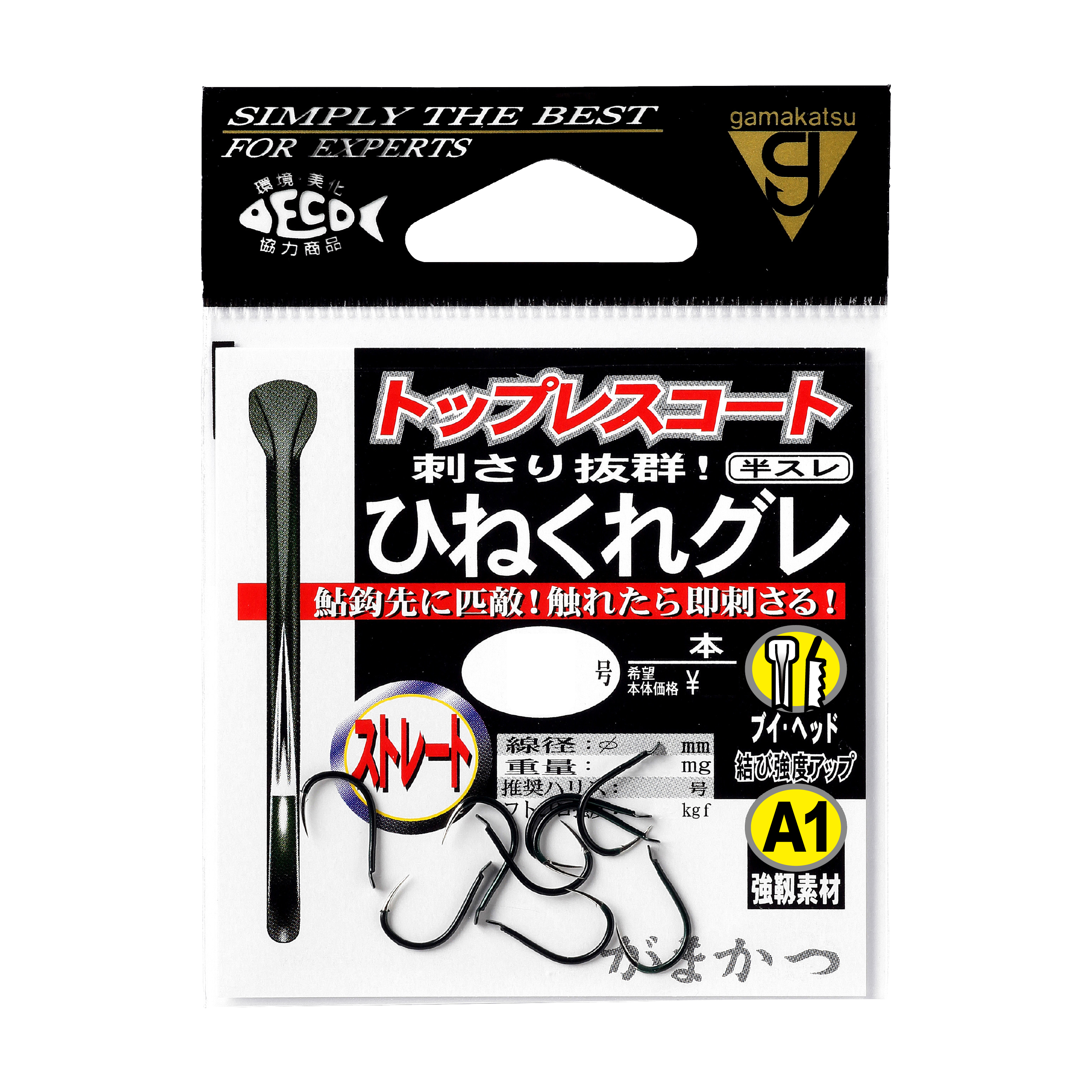 鮎鈎に匹敵する鈎先を持つ「トップレスコート」の「半スレ」。超先鋭鈎先で、グレが餌をくわえ違和感を覚えて吐き出そうとしたときには、鈎先が餌から出てすでに刺さっています。いい角度で素早く鈎が立って鋭く食い込み、瞬時に合わせが完了します。カラーはグレ好みのノリをイメージした「ダークグリーン」。素材は「A1」、「ブイヘッド」採用。