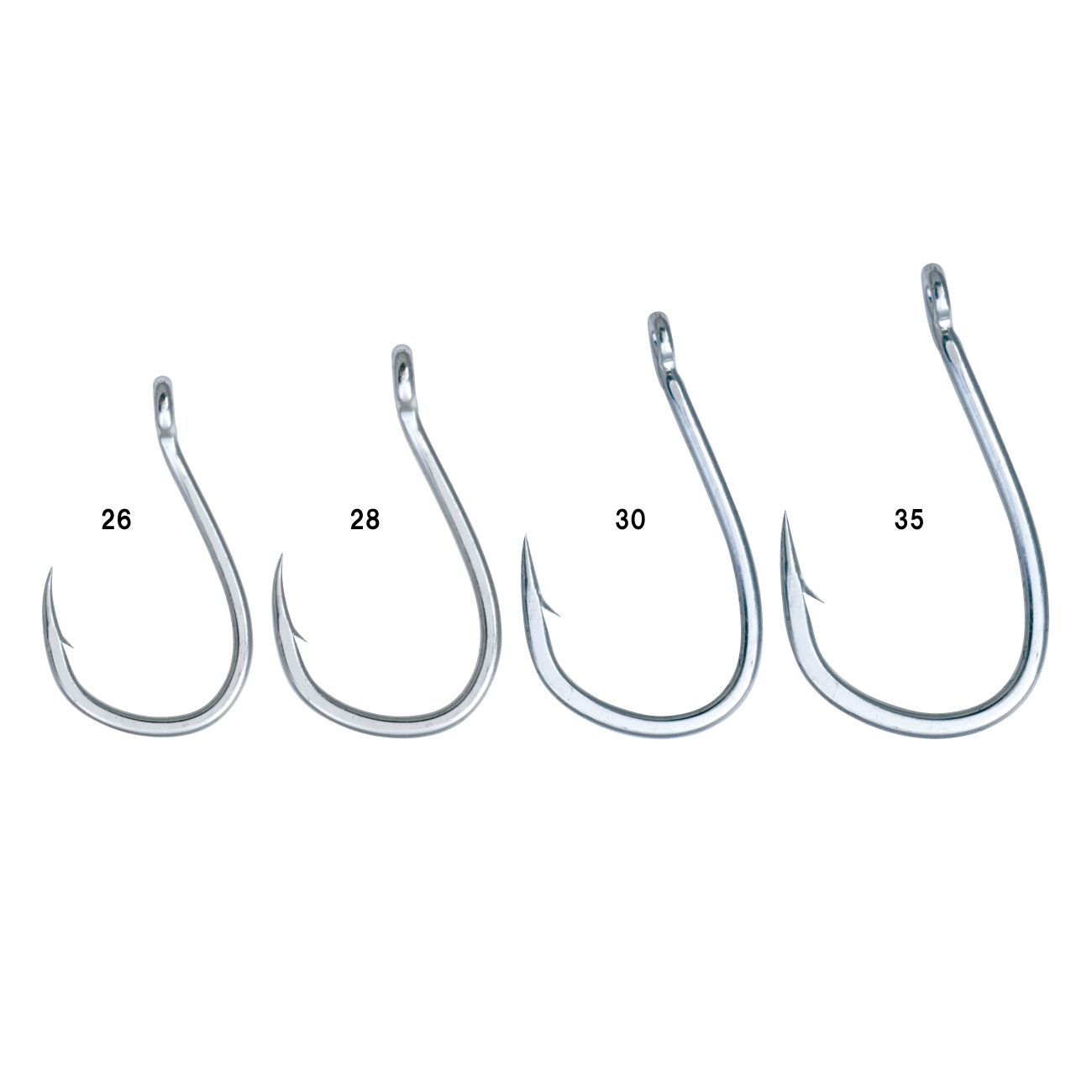 ジギングフロントフックとして、遠征をするジガーの間で定評がある「がまかつ 管付ムロアジ」の良い部分はそのままで、ジギング専用にチューニングを施しました。チューニングの内容は、根付け糸使用時を考慮した微妙なアップアイ。よりジギング向けの鈎先角度と形状。貫通性を考慮したバーブの大きさ。管付ムロアジと比較し、ワンランク細軸化する事で、不必要な強度と重さを取り除き、貫通性を向上させました。