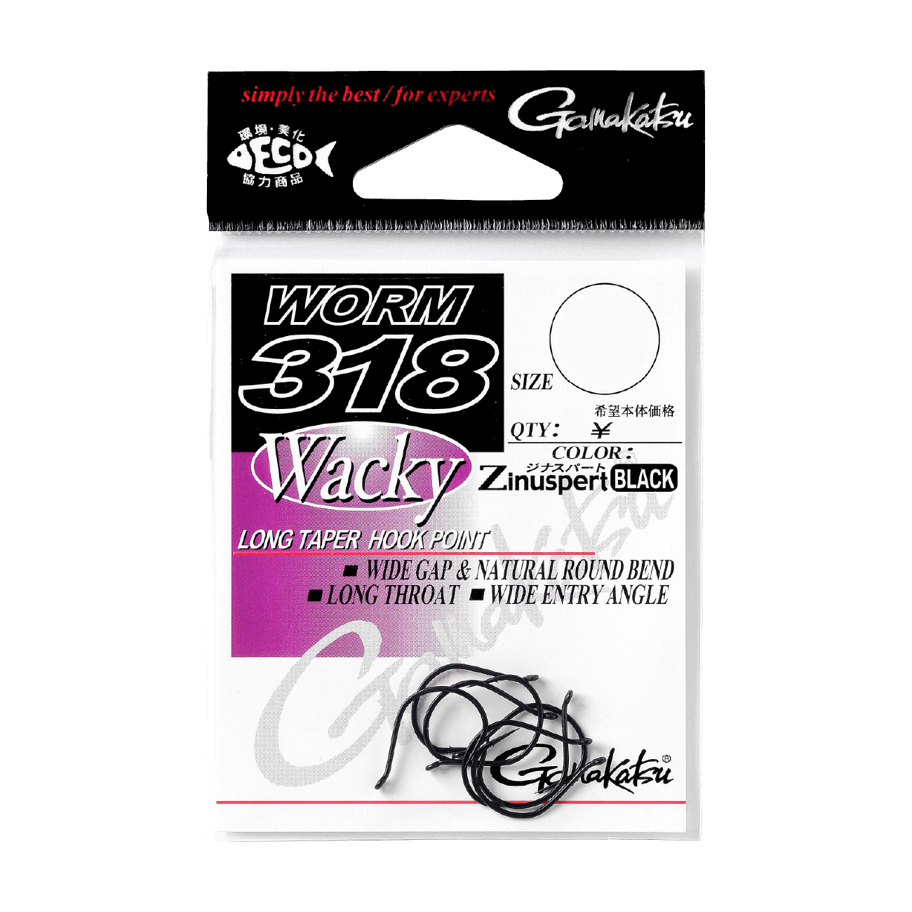 そのシルエットは、ワッキーリグの特徴を研究しつくされて生まれました。長めにとったスロート部がバスとのファーストコンタクトをイージーにし、優れた貫通力を誇るロングテーパード・ポイントが、わずかなバイトもフッキングに持ち込みます。独特のワイドエントリーアングル(角度のある進入角度)はバスのファーストコンタクトから一気にフッキングへ持ち込み、深く確実なフッキングを約束します。ワッキーリグに多用されるバルキー系ワームに対応するワイドギャップ&ナチュラルベンドカーブは、アクション時にはスロートからベンドヒールがしっかりとワームをホールド。フッキング時にはスムーズにワームがスライド。マイクロバーブが確実なフッキングを実現し、バラシを最小限に抑えます。