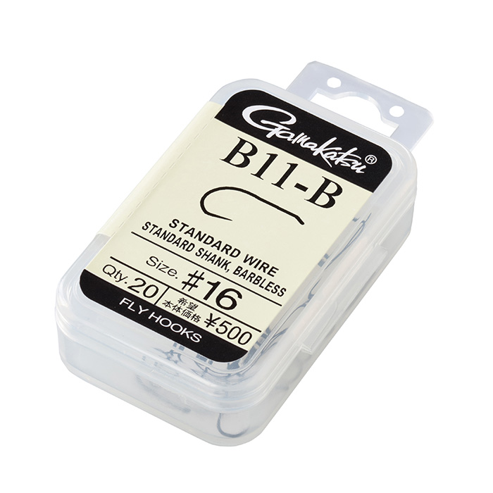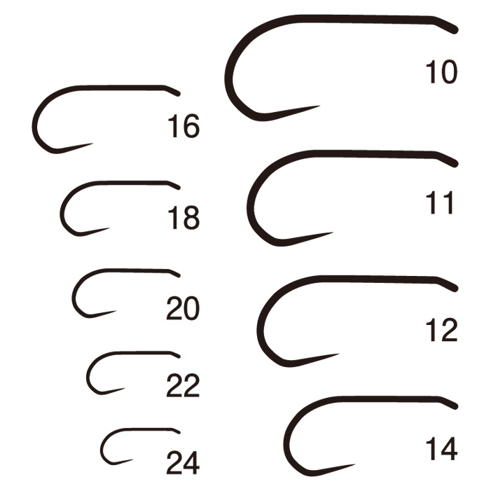 何処が新しいのか。「ボディー後部を自然に少しだけ沈ませたい」なんて今的な小技を使うには、スムースに連続してつながり落ちるストレートなシャンクからベンドへのカーブを利用し、ボディーを少し下側まで巻けば良いのです。もちろん「普通のカタチ」ですから、シャンクのストレート部のみにボディーを巻くベーシックパターンも全く自然。アールと直線との間に計算し尽くした「角」を持ってくることによって、想像以上の「強度」と「ホールド性」をもたらしているのですが、それは「バーブレスはバレ易い」という想いをあなたから無くすことでしょう。近年では嫌う「バックヘビー」気味バランスを敢えて取ることにより、ベンドからポイントにかけては微妙に水中に突き刺さります。そのために流下バランスがとても安定し、ナチュラルドリフトに繋がります。